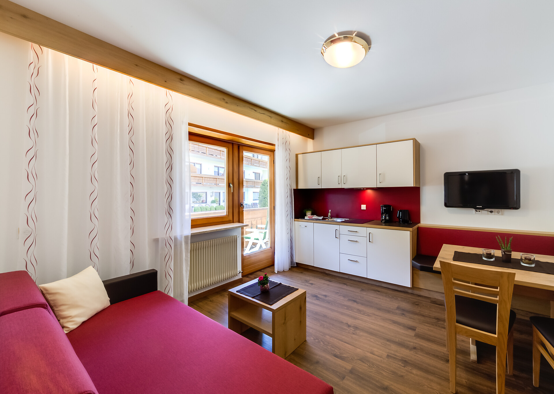 In the "Ifinger" apartment with balcony, the morning sun welcomes you with a wonderful view of Schenna's local mountain. 33m² for 2 people with east-facing balcony and morning sun. Living room with sitting area, sofa bed, flat screen TV, radio, safe, telephone and kitchenette with coffee machine, dishwasher, fridge with freezer compartment, microwave, kettle, crockery, pots and pans, 2 electric hotplates, washing-up liquid, dishwasher and microwave.pots, 2 electric plates, washing-up liquid, cleaning cloths and drying towels Balcony with view of the local mountain of Scena, the "Ifinger", with table and chairs, deckchairs, clothes horse. Bedroom with double bed, flat screen TV, closet New bathroom with window, shower, WC, hairdryer, towels and 2 bathrobes. WLAN free of charge in every apartment