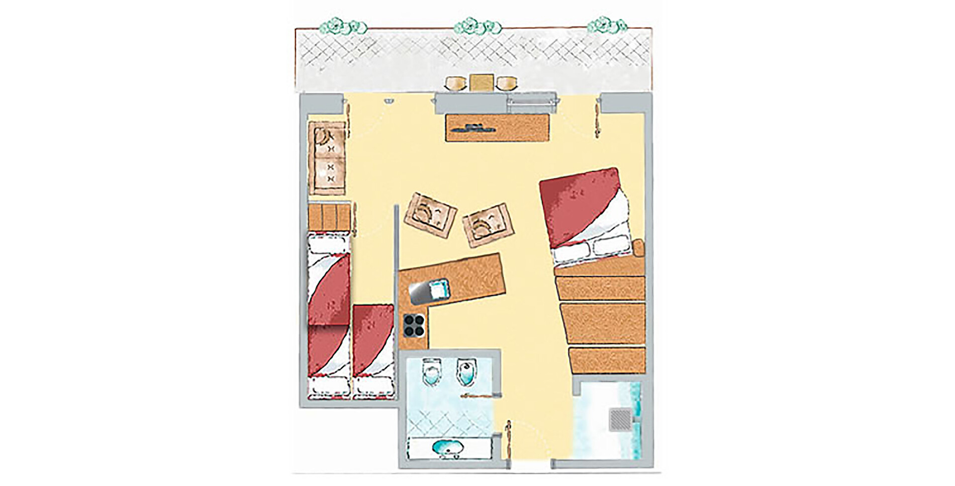 C Balcony Apartment No. 46 South and west side 50 m² Living room with kitchenette, bedroom, bathroom. Sitting corner, couch, satellite TV, safe, telephone, radio alarm clock, linen, towels, hairdryer, crockery, coffee machine, separate children's room with 2 beds
