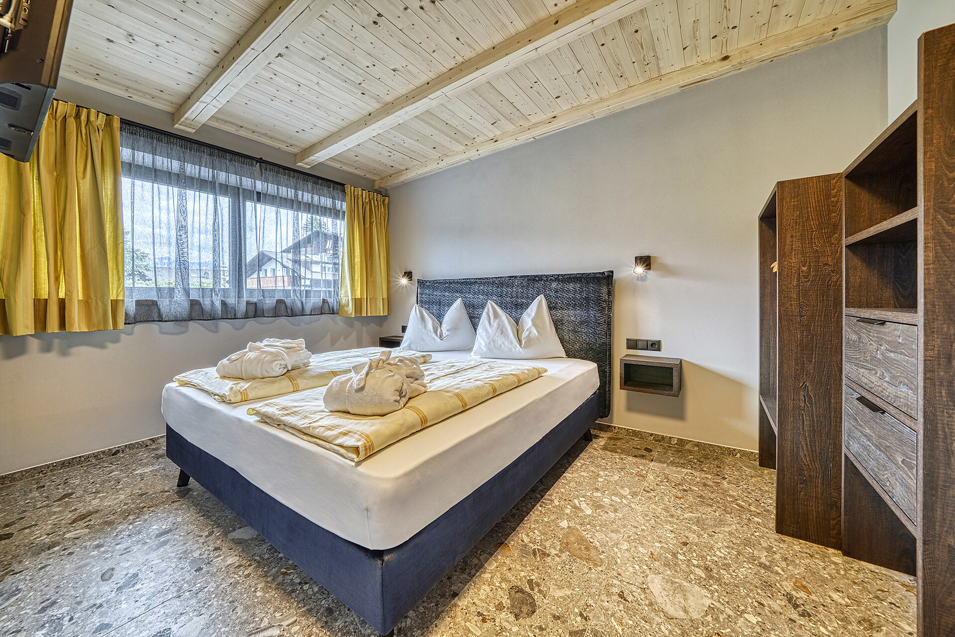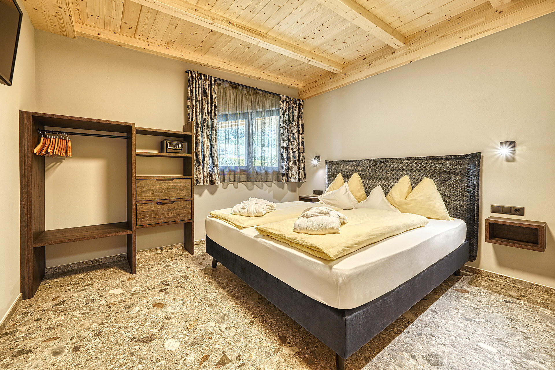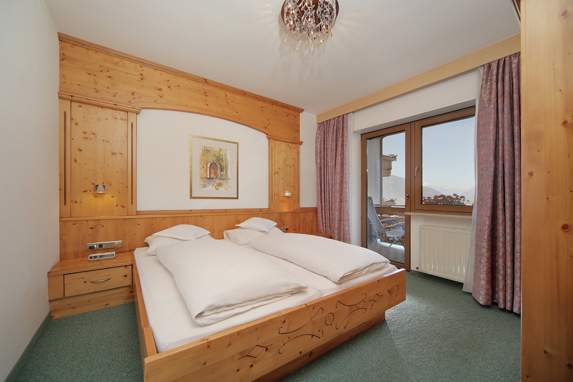 A holiday apartment "I5" (approx. 45 sqm) in traditional style, bedroom newly furnished in a modern design. Living room with seating area, double sofa bed for children, satellite TV, WiFi, and safe, kitchenette with eating and cooking utensils, toaster and coffee machine, bathroom with toilet and bidet, shower, hairdryer and towels, garage and elevator. Terrace on the west side with a floating lounger and table set and panoramic views of the mountains of the Texel Group.