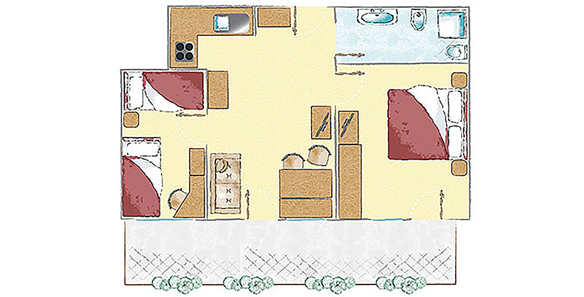 B Garden apartment South side and west side 52 m² living room with kitchenette, bedroom, bathroom. Sitting corner, couch, satellite TV, safe, telephone, radio alarm clock, linen, towels, hairdryer, crockery, coffee machine, separate children's room with 3 beds.