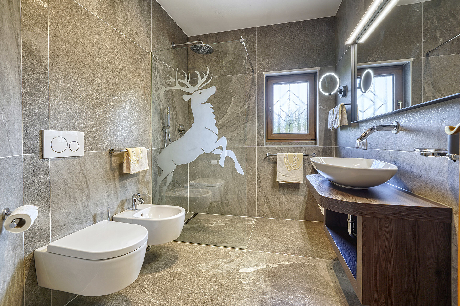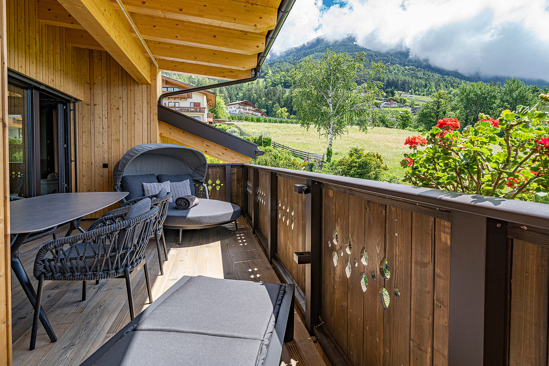 New, modern apartment für 1-5 persons with west-facing balcony with a fantastic view over the Meraner Land and the Texel Group. 55 qm. Bedroom - living room with panoramic window, large family table, comfortable reading chair, WiFi, satellite TV and safe, fully equipped kitchenette with dishwasher, coffee machine and toaster, separates bedrooms. Bathroom with walk-in rain shower, toilet and bidet and hair dryer as well as an additional day toilet. Anti-allergic rooms, pets not allowed.