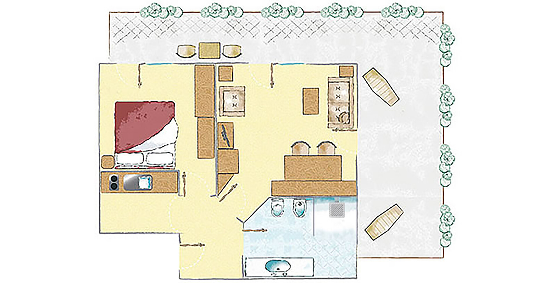 Apartment "E" with terrace South side and west side 42-50 m² living room with kitchenette, bedroom, bathroom with walk in rain shower, Sitting corner, couch, satellite TV, safe, telephone, radio alarm clock, linen, towels, hairdryer, crockery, coffee machine.