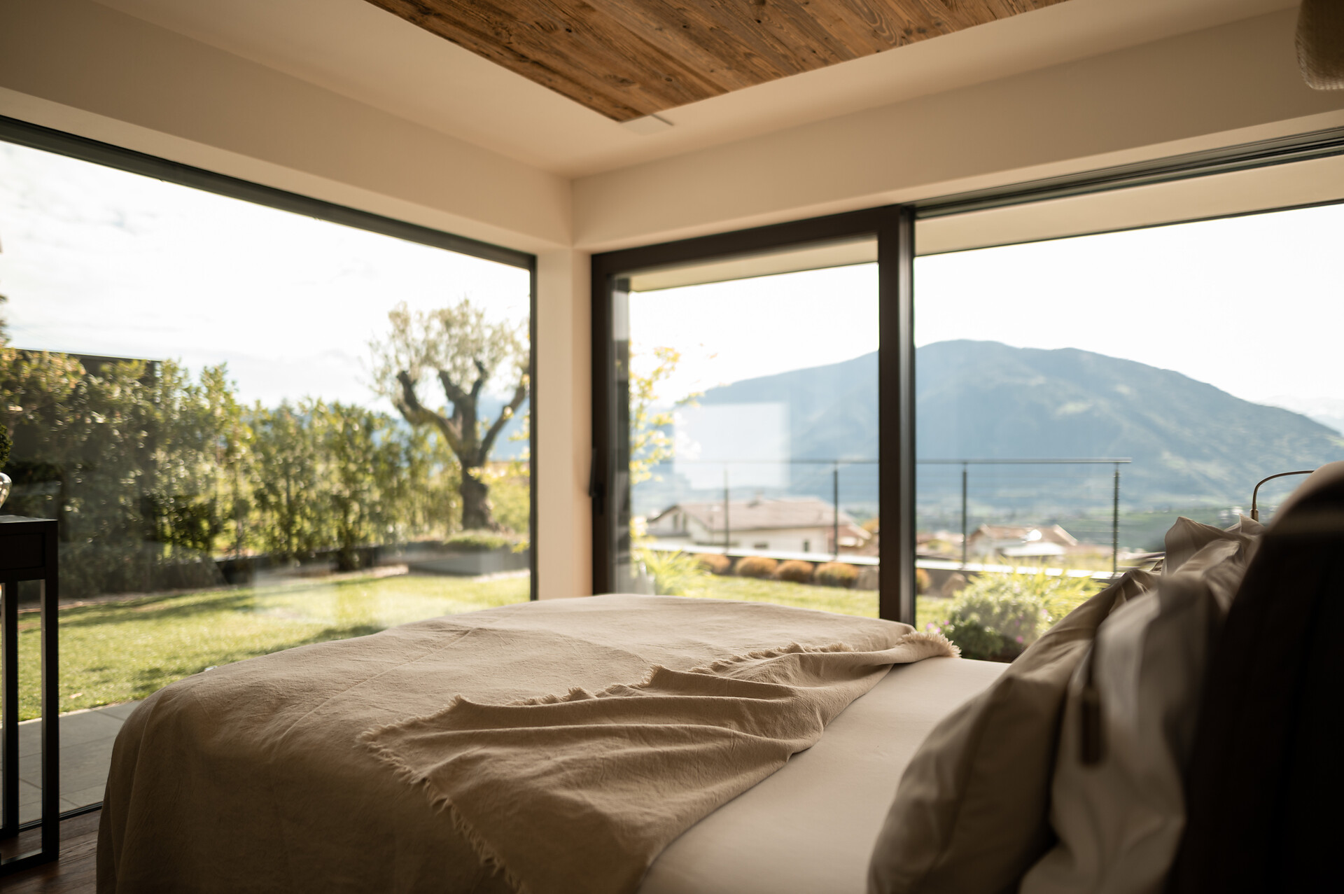 The View-Houses enchant with their exclusive location and the unique all-round view of the surrounding mountain panorama and the Merano valley basin. The large window areas, the elegant sun terraces with glass balustrades and the modern design make Chalet Goyen & Villa Goyen an exclusive holiday home that meets the highest standards of cosiness, comfort and location.