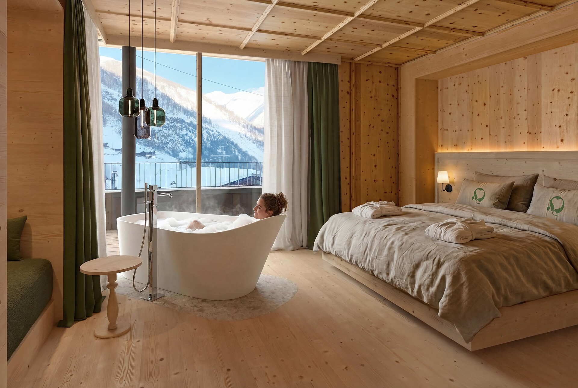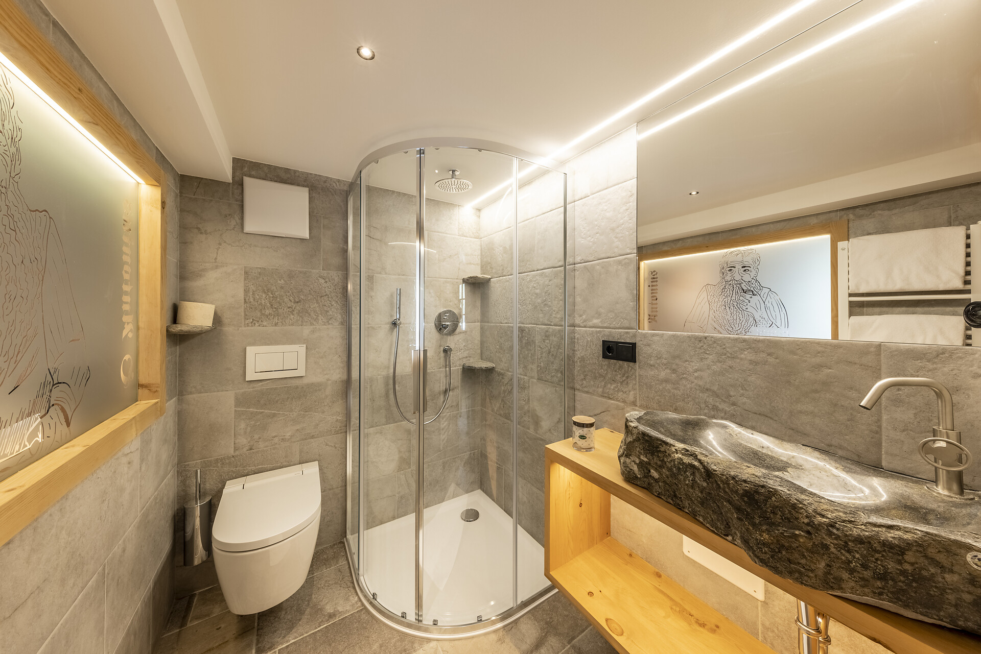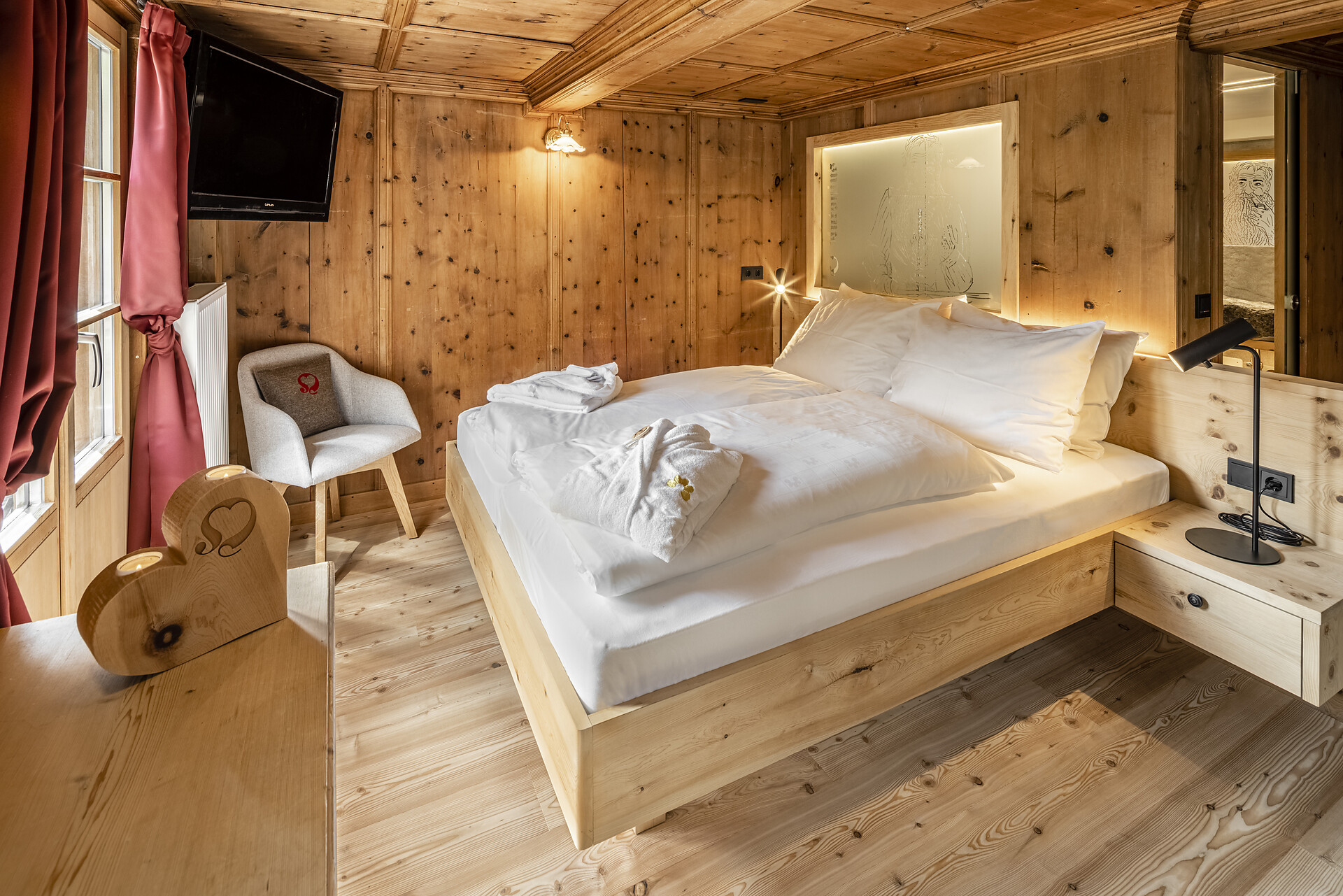 Fortunately, I am the Oberraindlhof. The grandest of my historic rooms is called ‘Antonius’. Why you may ask? In the year 1900, it served as the sanctuary of the family patriarch, Anton. Given his many responsibilities during the day, he naturally needed an especially good night’s rest. A practice that still works well today. With exquisite Swiss stone pine and spruce, this 25m2 space exudes a cosy ambience, while fine natural stone and premium natural materials lend an air of opulence to this magnificent room. And wait until you see the view from the balcony!