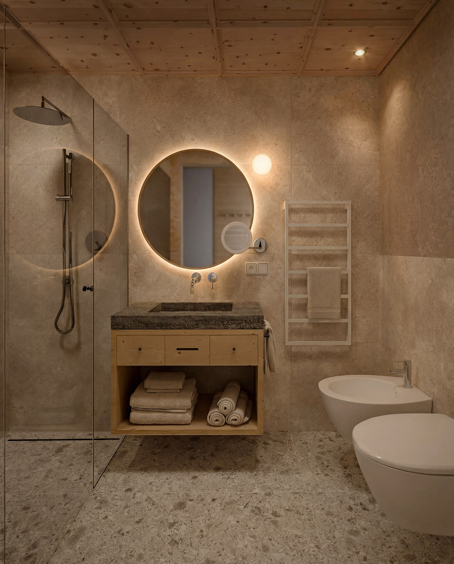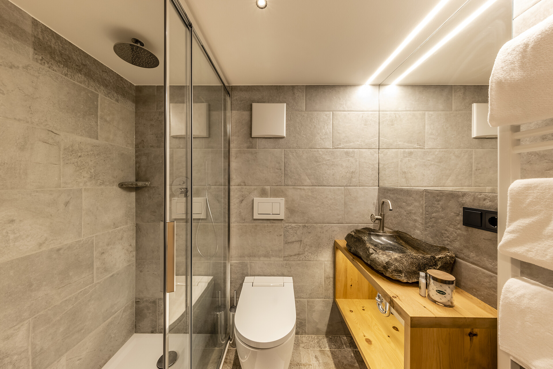 New bathroom with shower/WC, washbasin made from natural Val Senales stone