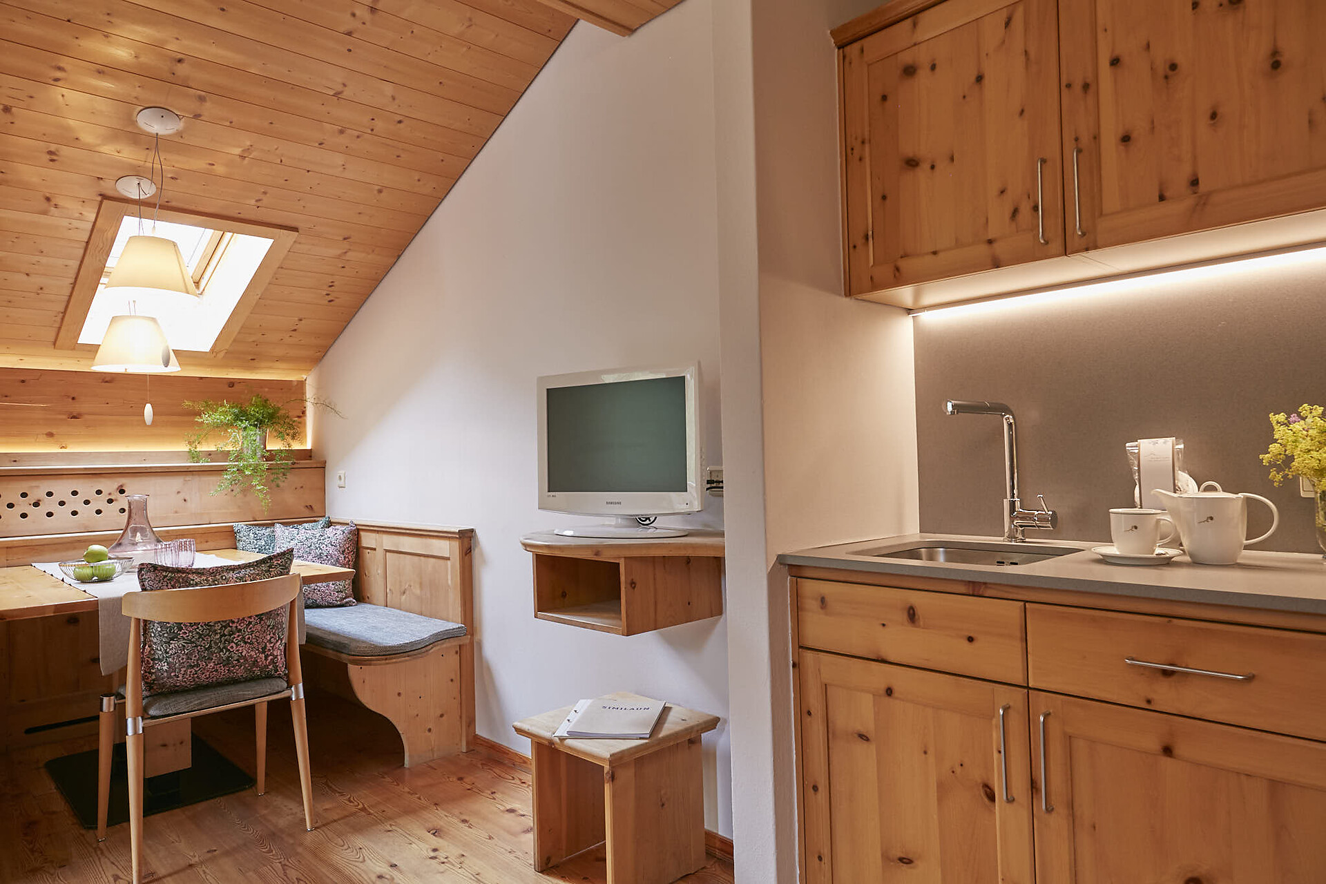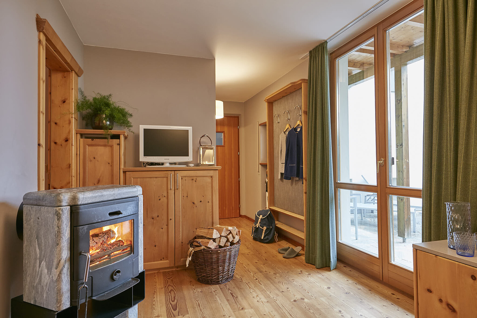 The cozy CLASSIC Suites in our Palla Bianca annex offer between 35 and 50 m² of living space, and sleep two persons. Warm and earthy natural hues, wooden furniture and soft woolen textiles create a comfortable atmosphere. All of these suites feature separate living and sleeping areas, a cozy sitting room with wooden stove, a marble bathroom and either a balcony or sun terrace with garden access; some have kitchenettes.