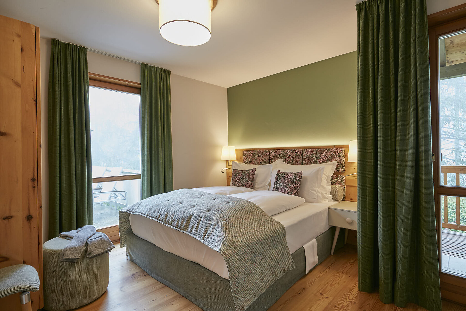 The spacious PREMIUM Suites in our Palla Bianca annex offer 70 m² of living space, and sleep two to five persons. Warm and earthy natural hues, wooden furniture and soft woolen textiles create a comfortable atmosphere. All of these suites feature a cozy sitting room with wooden stove, two separate bedrooms with views of the mountains, a modern marble bathroom and either a balcony or sun terrace with garden access.