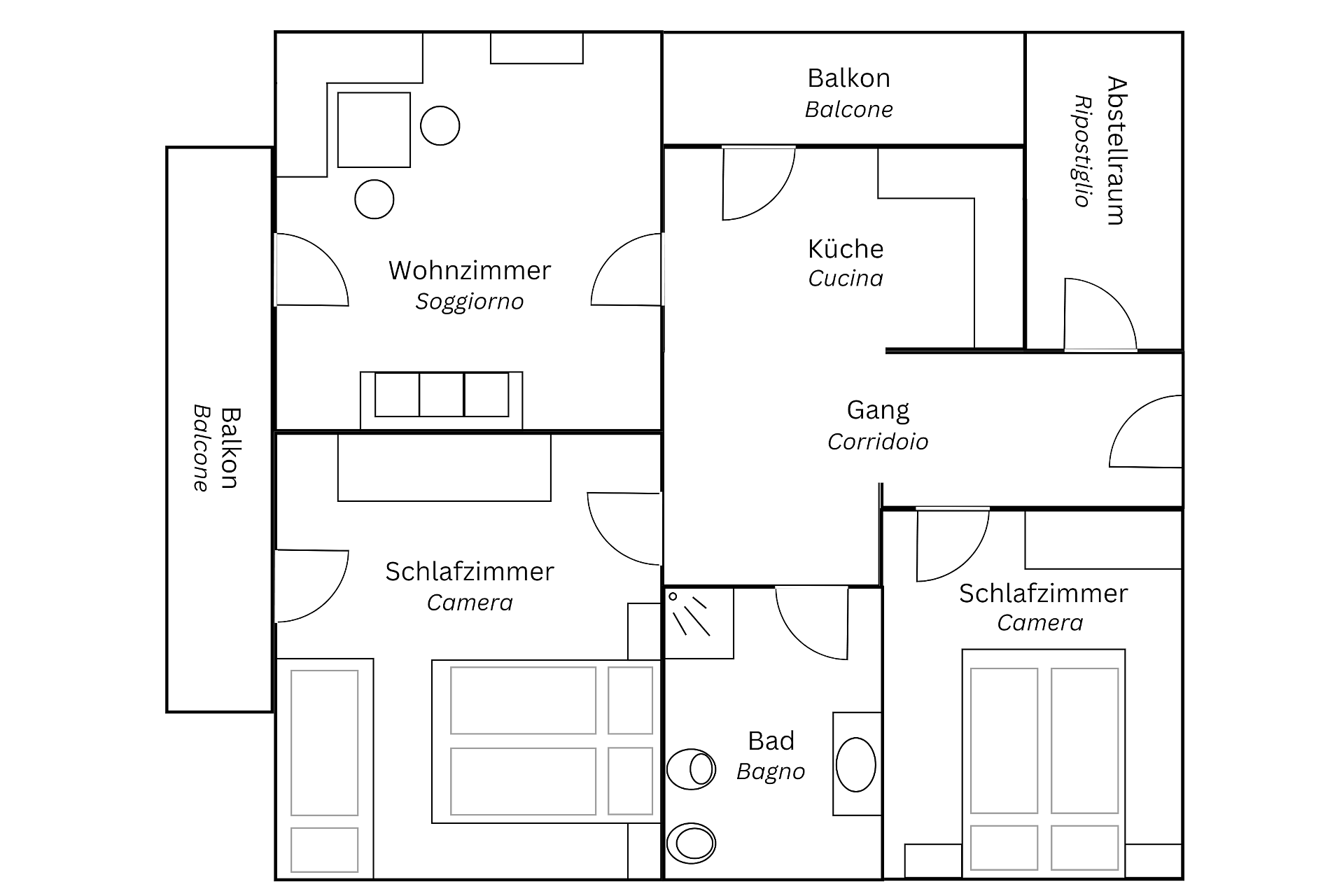 Single bed, Double bed , Sofa bed, Balcony, Separate living area, Bed linen provided, Non-smoking apartment, 2 or more bedrooms, Separate kitchen, Coffee machine, Dishwasher, Electric cooker, Cutlery provided, Hob, Water boiler, Shower/Bath tub, Bidet, Hair dryer, Towels, TV, WLAN, Final cleaning included, Main building, Panoramic view, South view