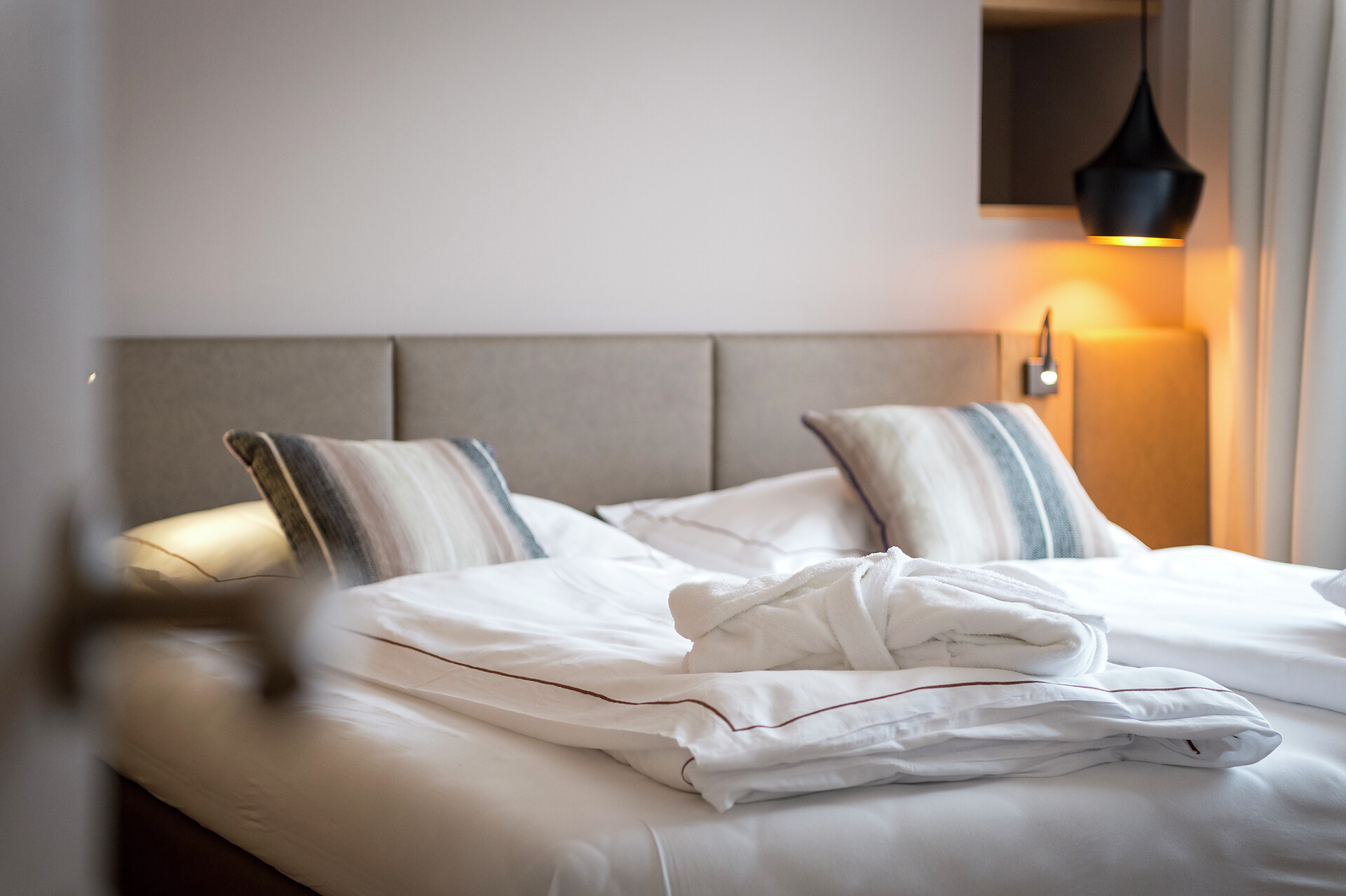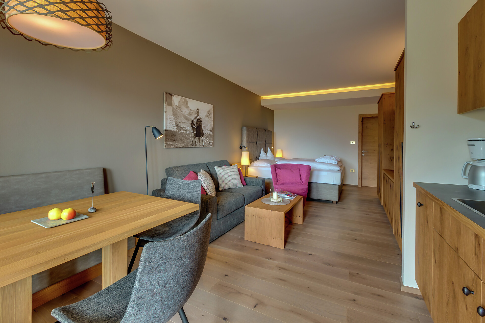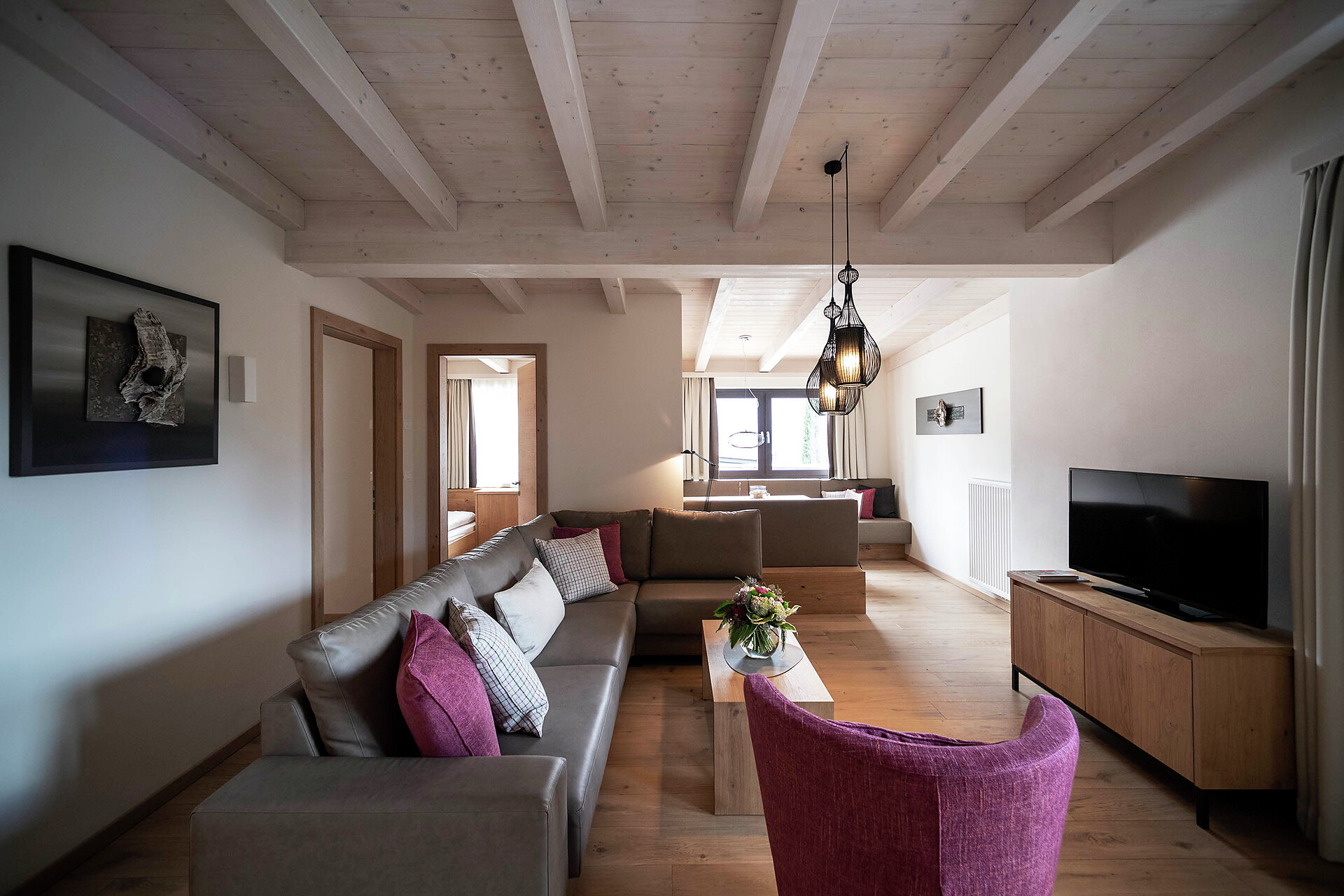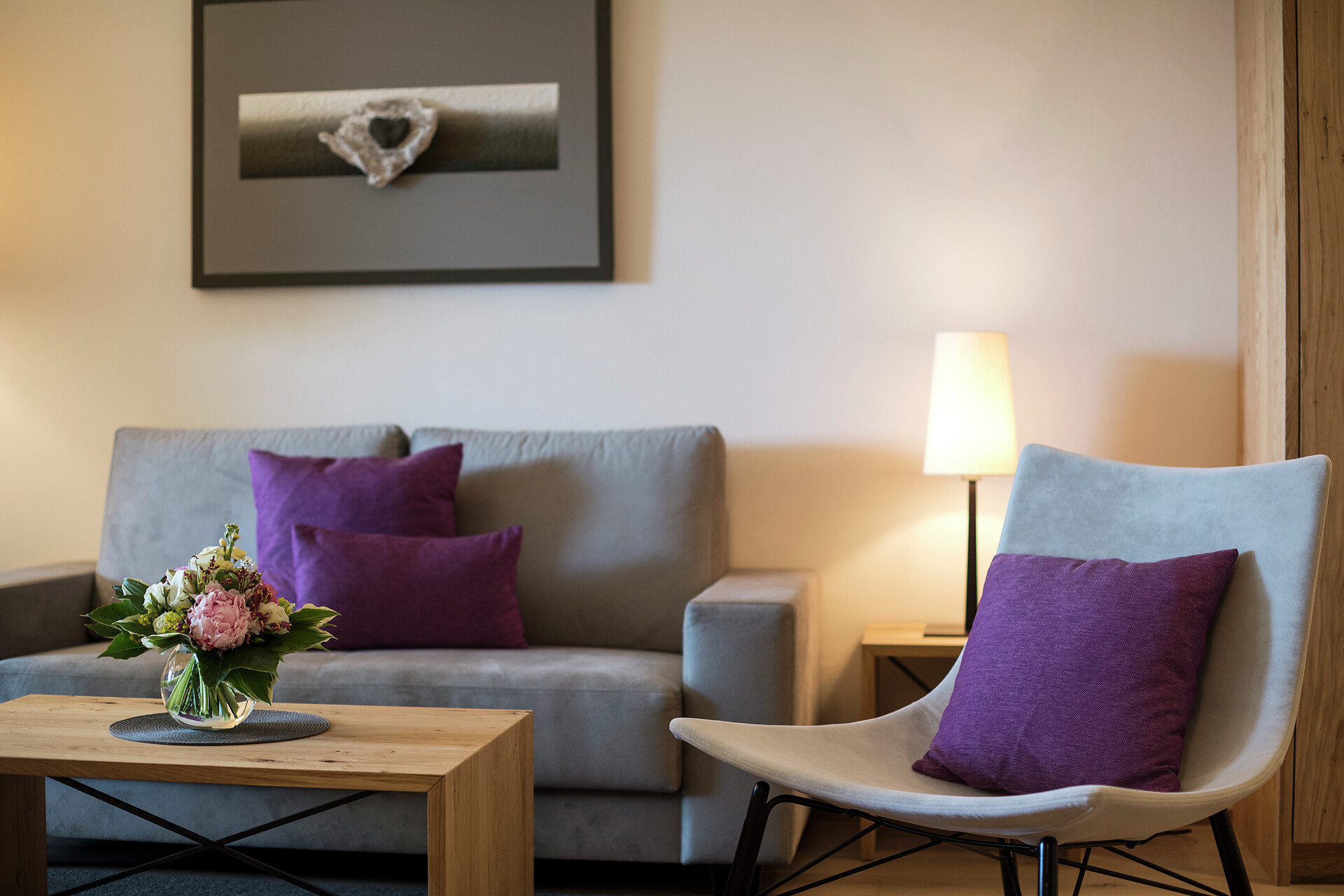 Three-room suite, south-facing with balcony, living room with kitchenette and dishwasher, 1 bedroom, 1 children's room with bunk beds or two single beds, bathroom with shower, toilet, cosy bathrobes and toiletries bag, hairdryer, free WiFi, satellite TV, air conditioning, approx. 73 m²