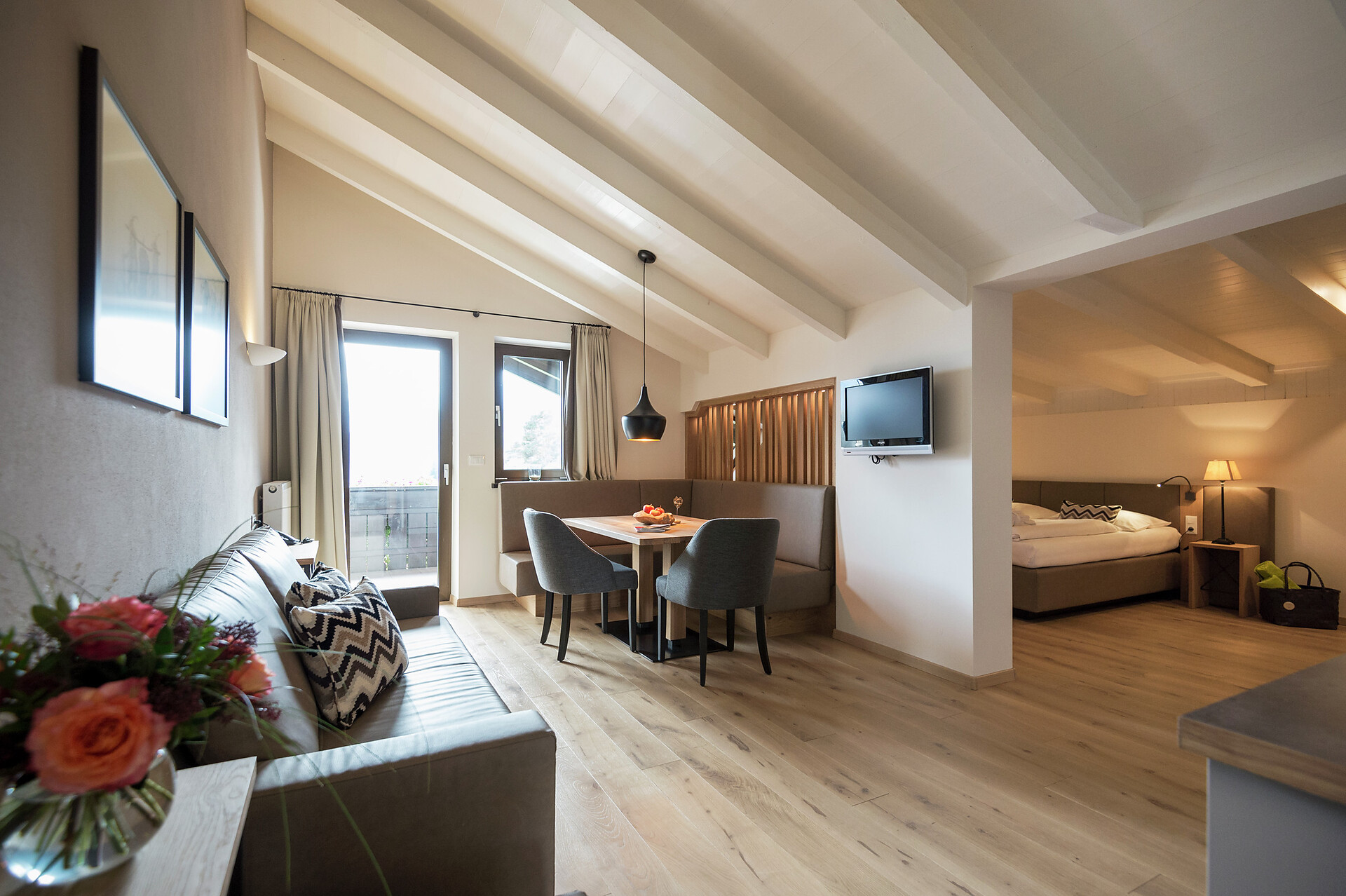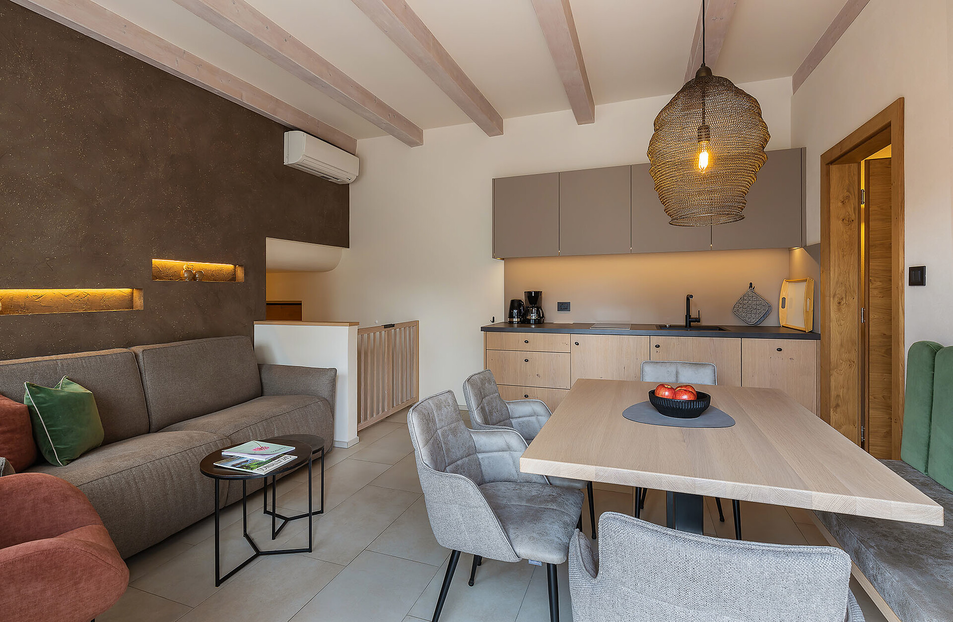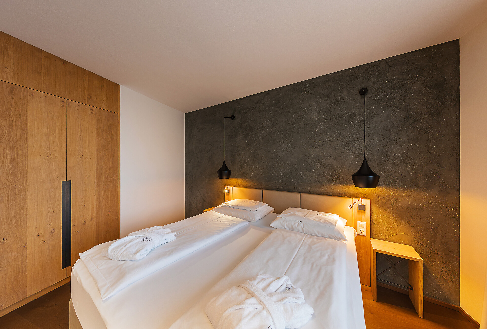 Three-room suite, south-facing with balcony, living room with kitchenette and dishwasher, 1 bedroom, 1 children's room with bunk beds or two single beds, bathroom with shower, toilet, cosy bathrobes and toiletries bag, hairdryer, free WiFi, satellite TV, air conditioning, approx. 73 m²