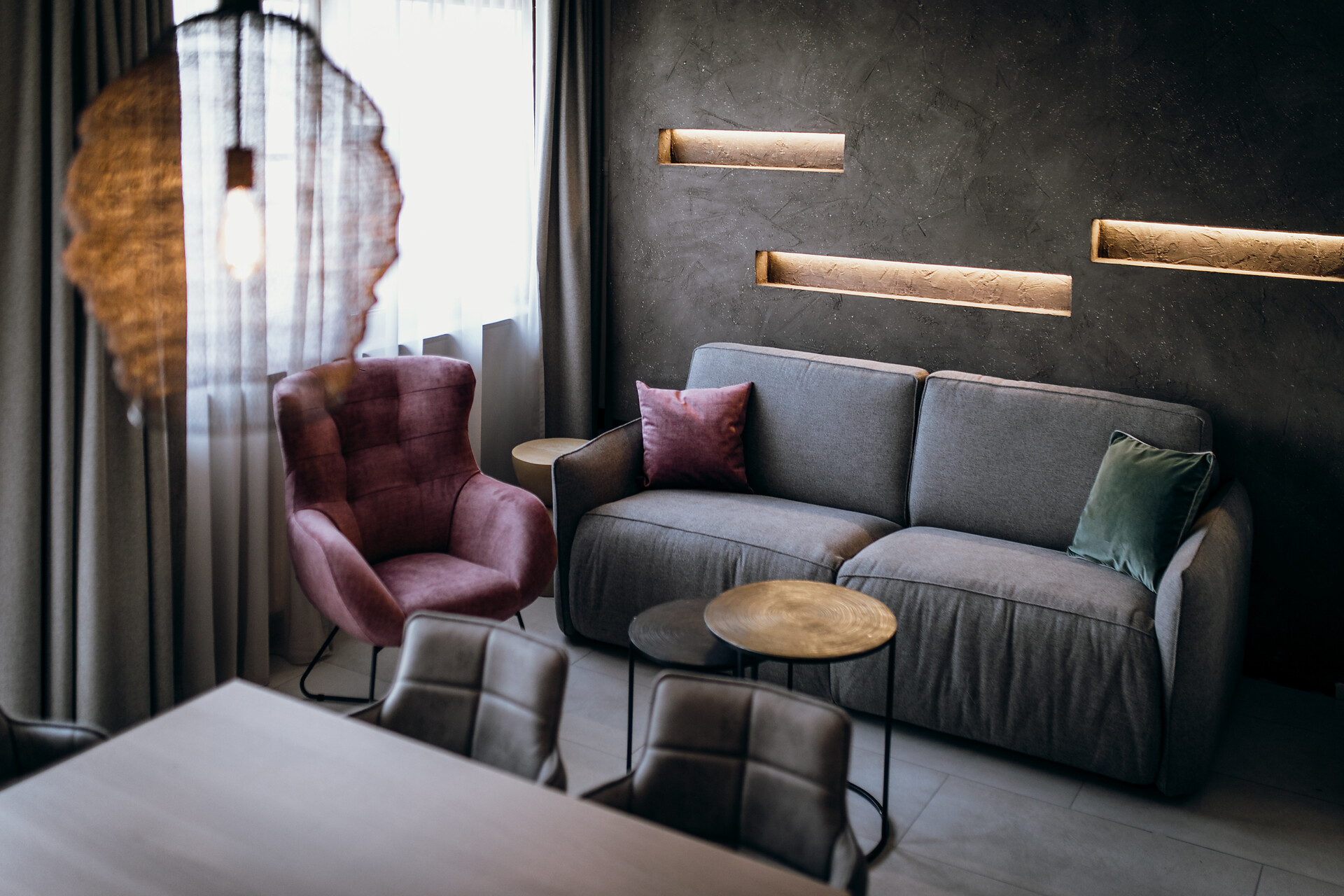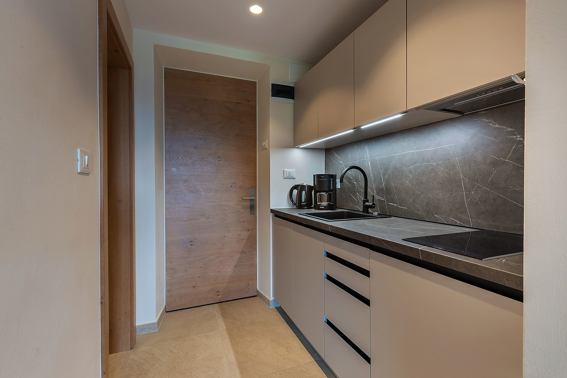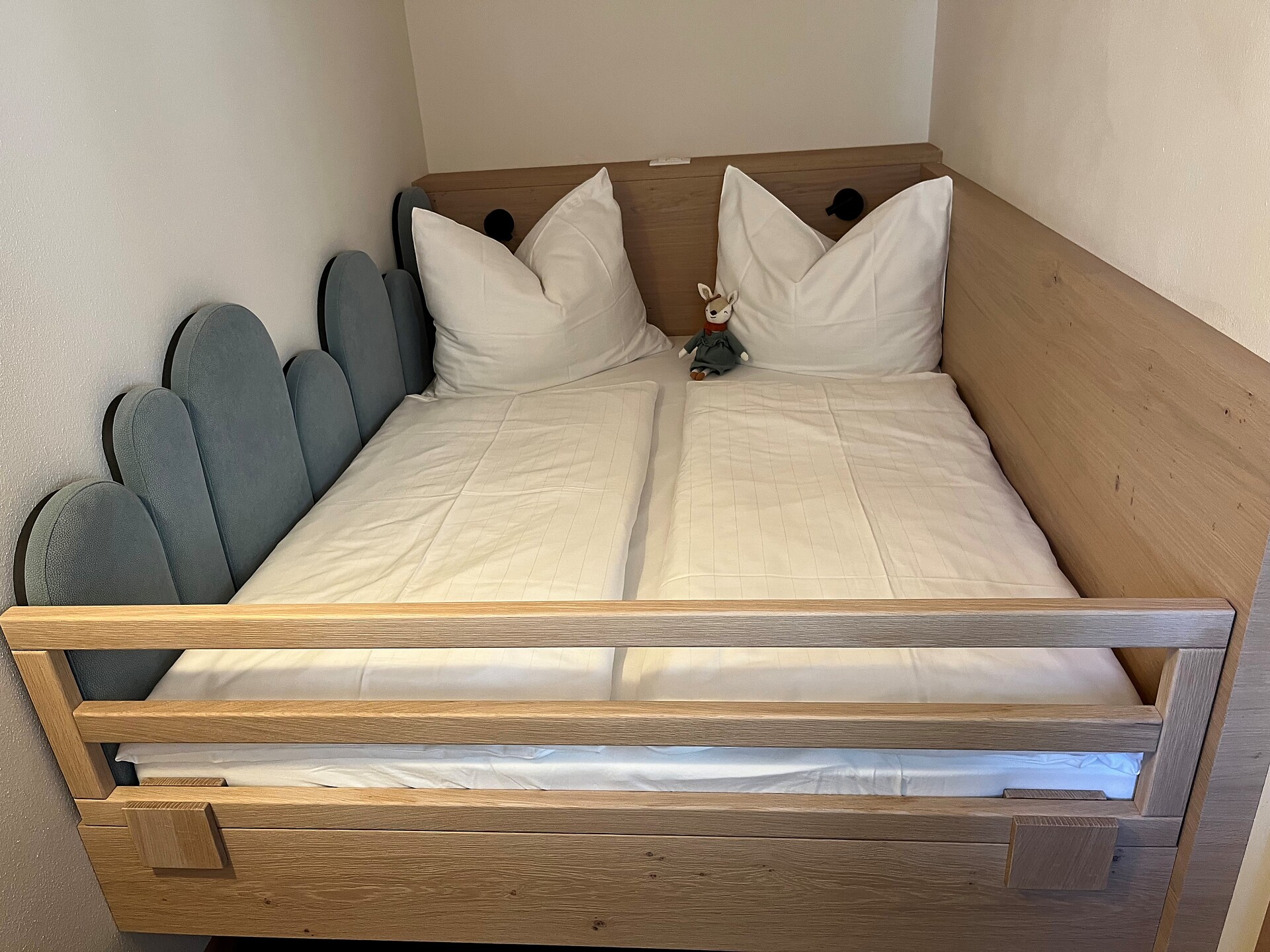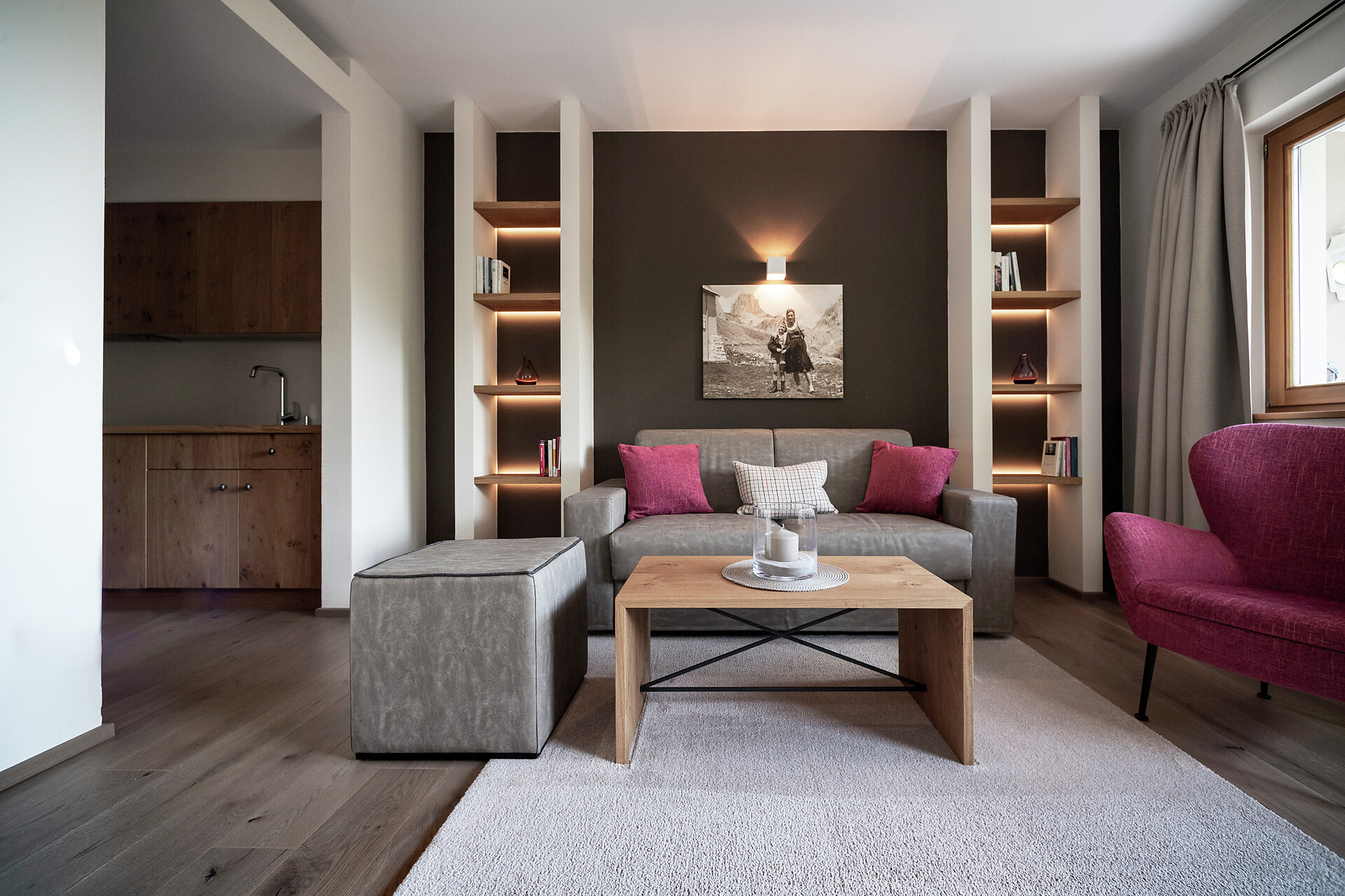 Three-room suite, south-facing with balcony, living room with kitchenette and dishwasher, 1 bedroom, 1 children's room with bunk beds or two single beds, bathroom with shower, toilet, cosy bathrobes and toiletries bag, hairdryer, free WiFi, satellite TV, air conditioning, approx. 73 m²