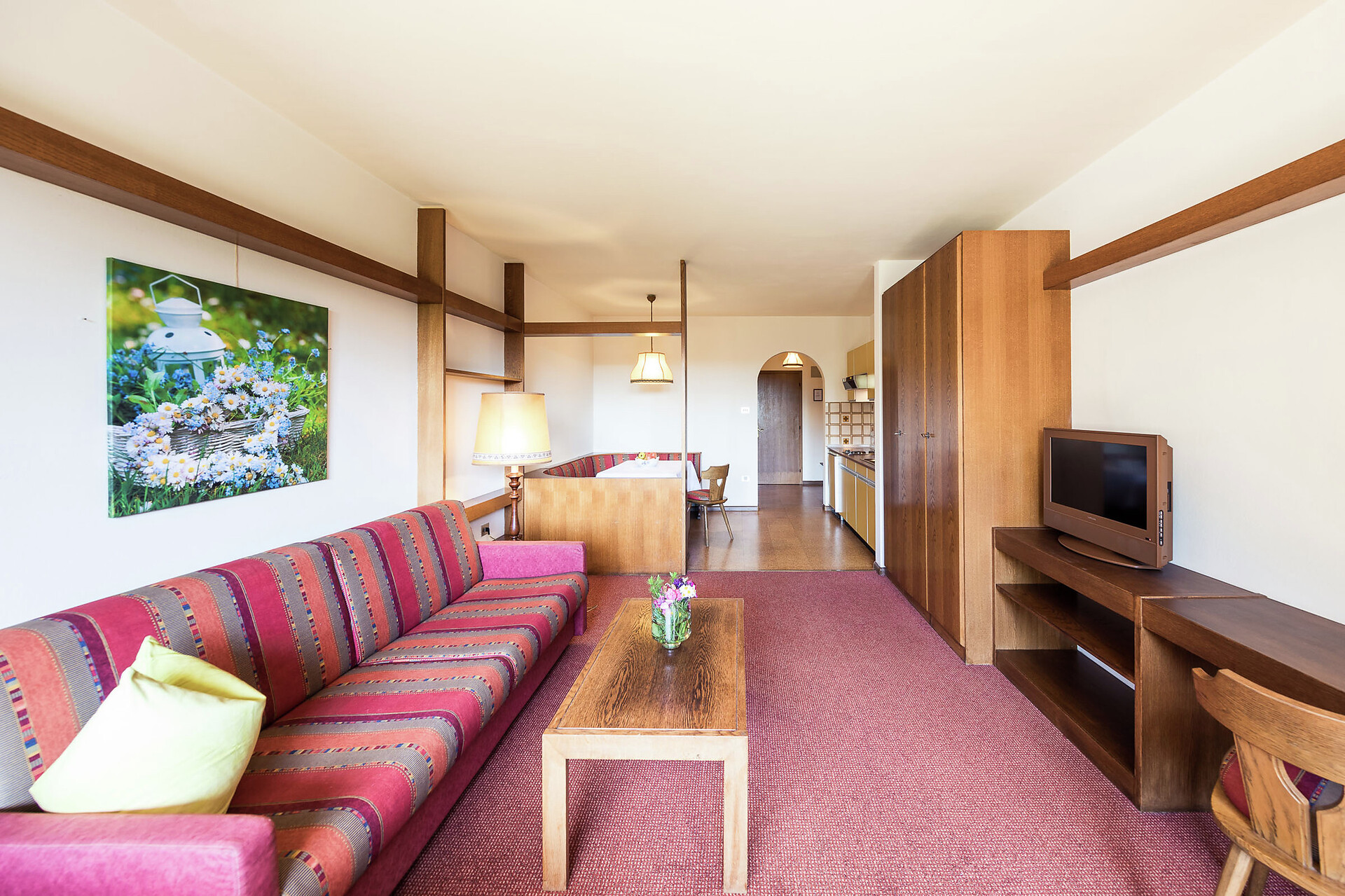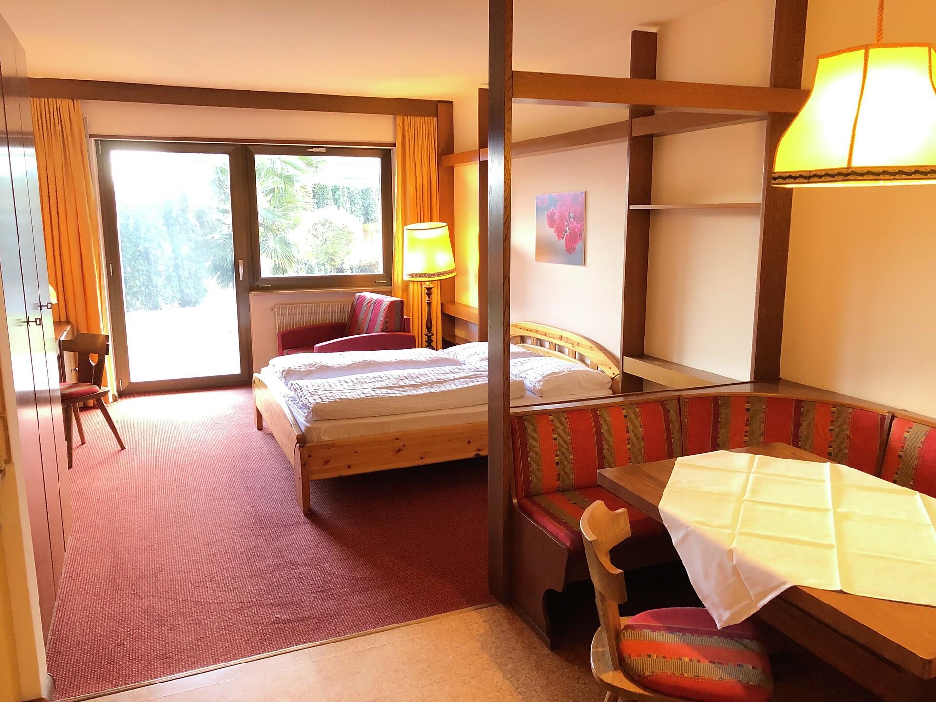 Our One-room-apartment (size: 35m²) has a double bed, single sofa bed, a kitchenette, sitting area with dining table, a separate bathroom with shower, safe, flat screen satellite TV, drying rack and a spacious balcony overlooking our Mediterranean Garden.