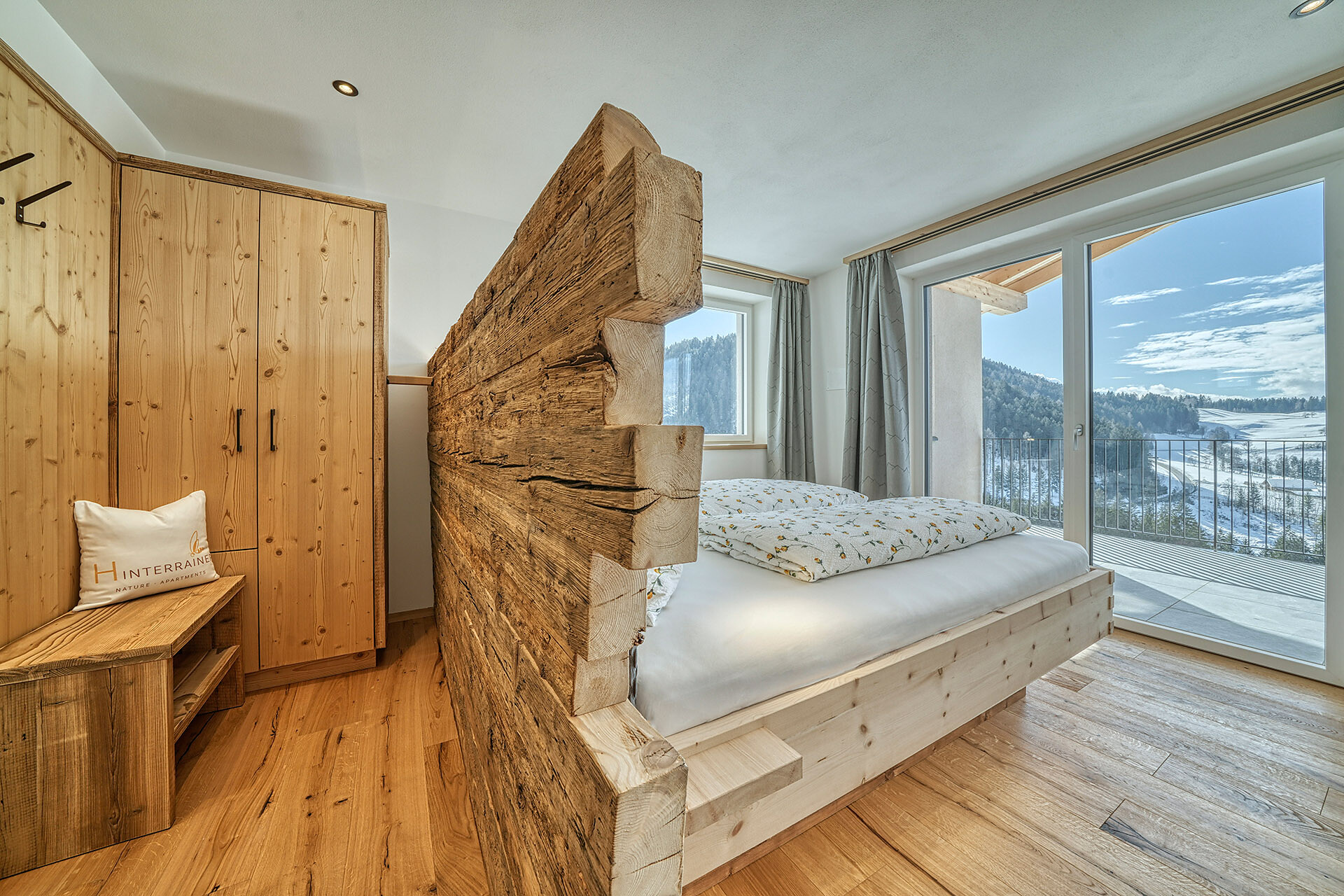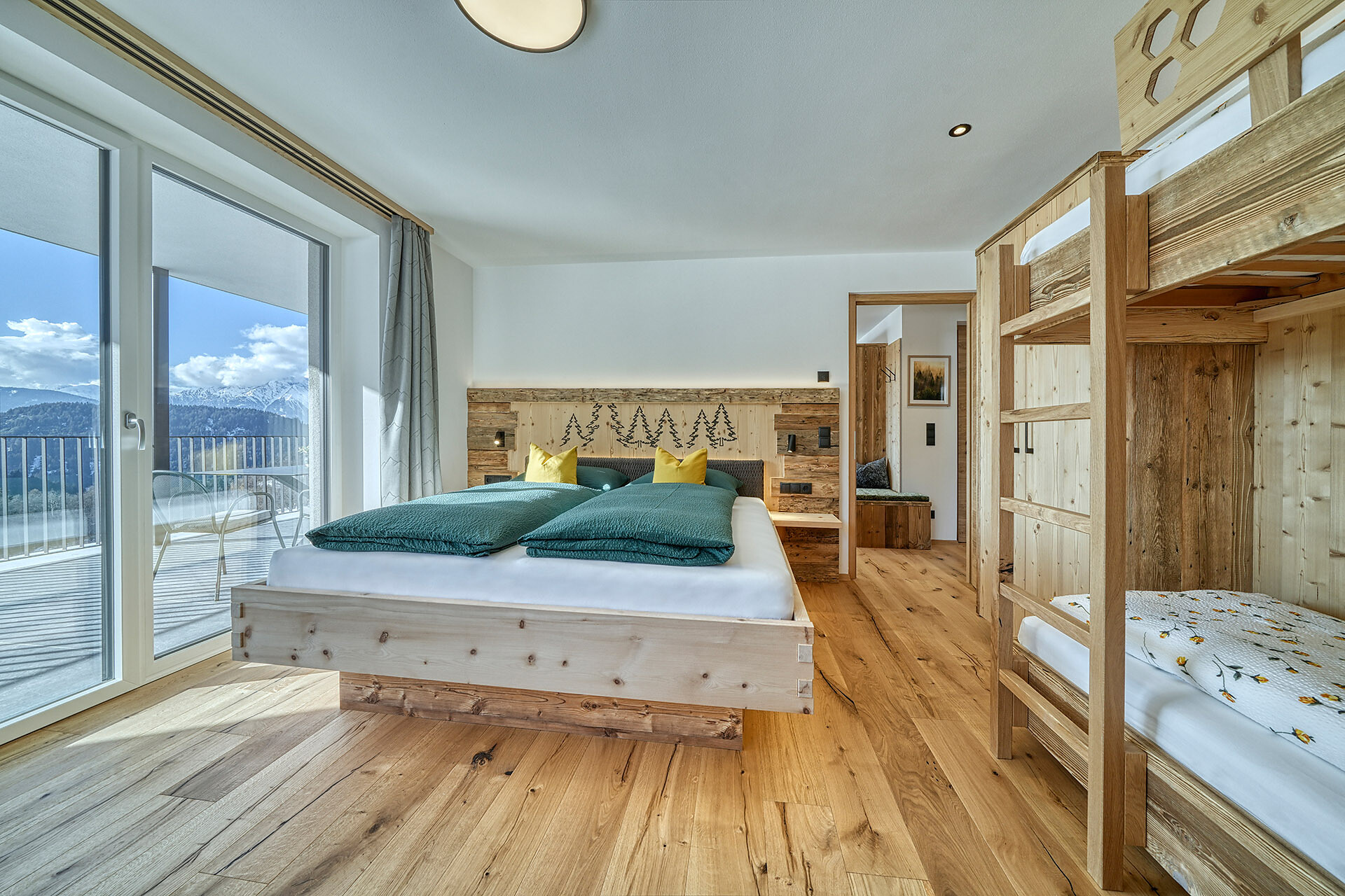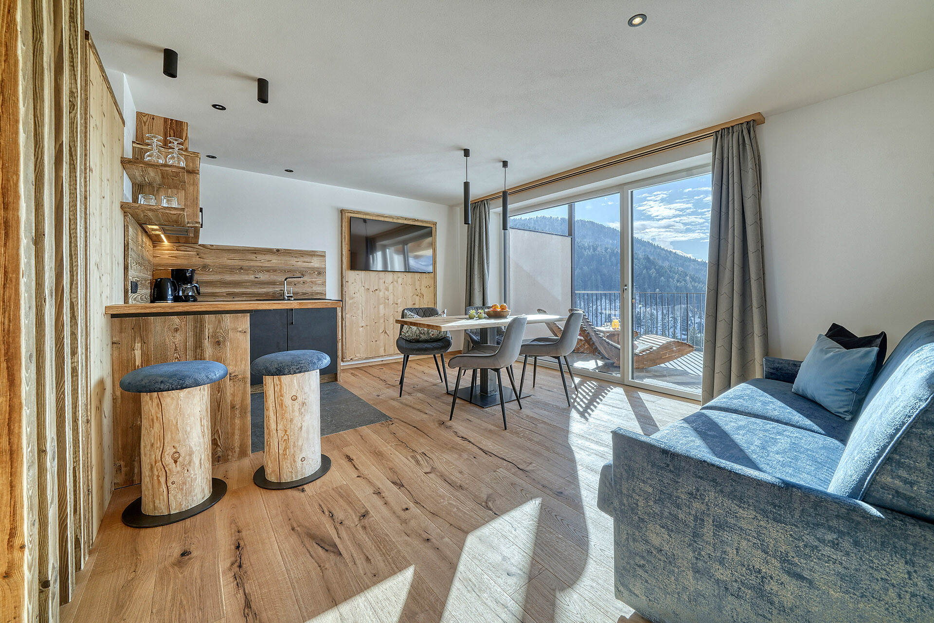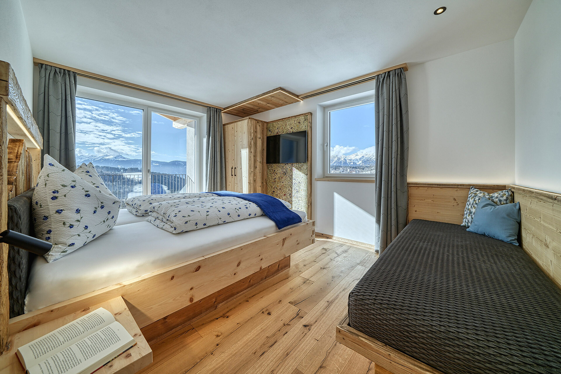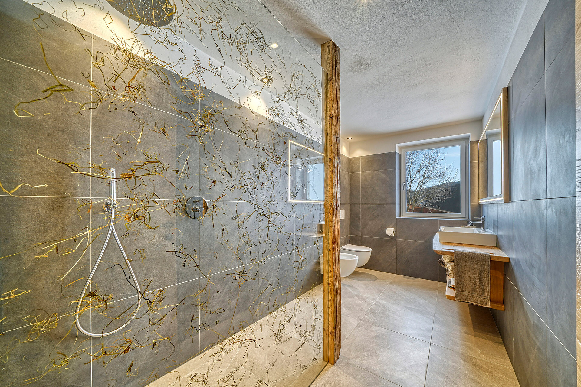 Delicate hay elements bring the scent of our mountain meadows into your forest retreat. Large windows fill the interior with light and open up views of the surrounding woods, while natural materials create a warm and calming atmosphere.