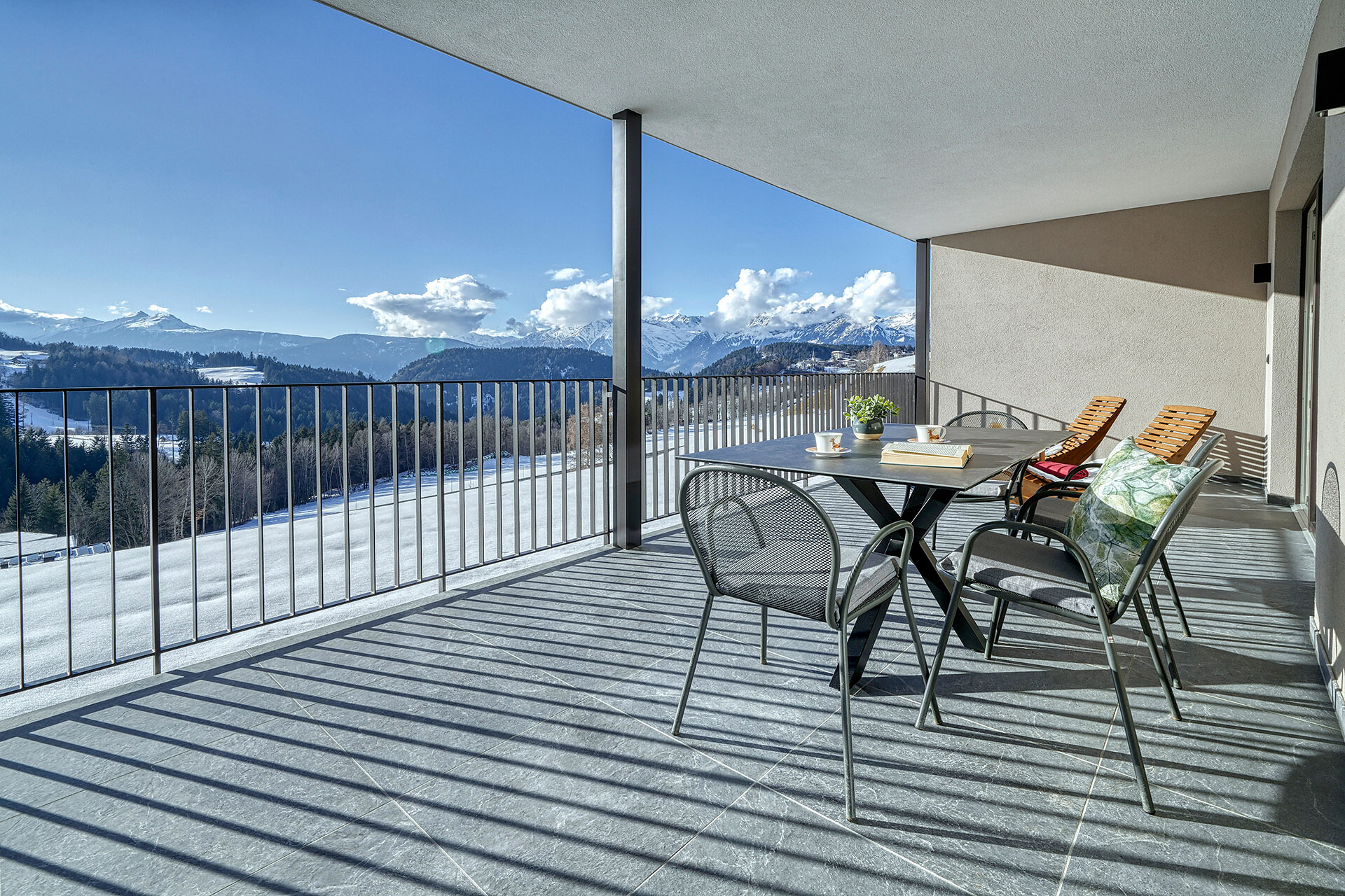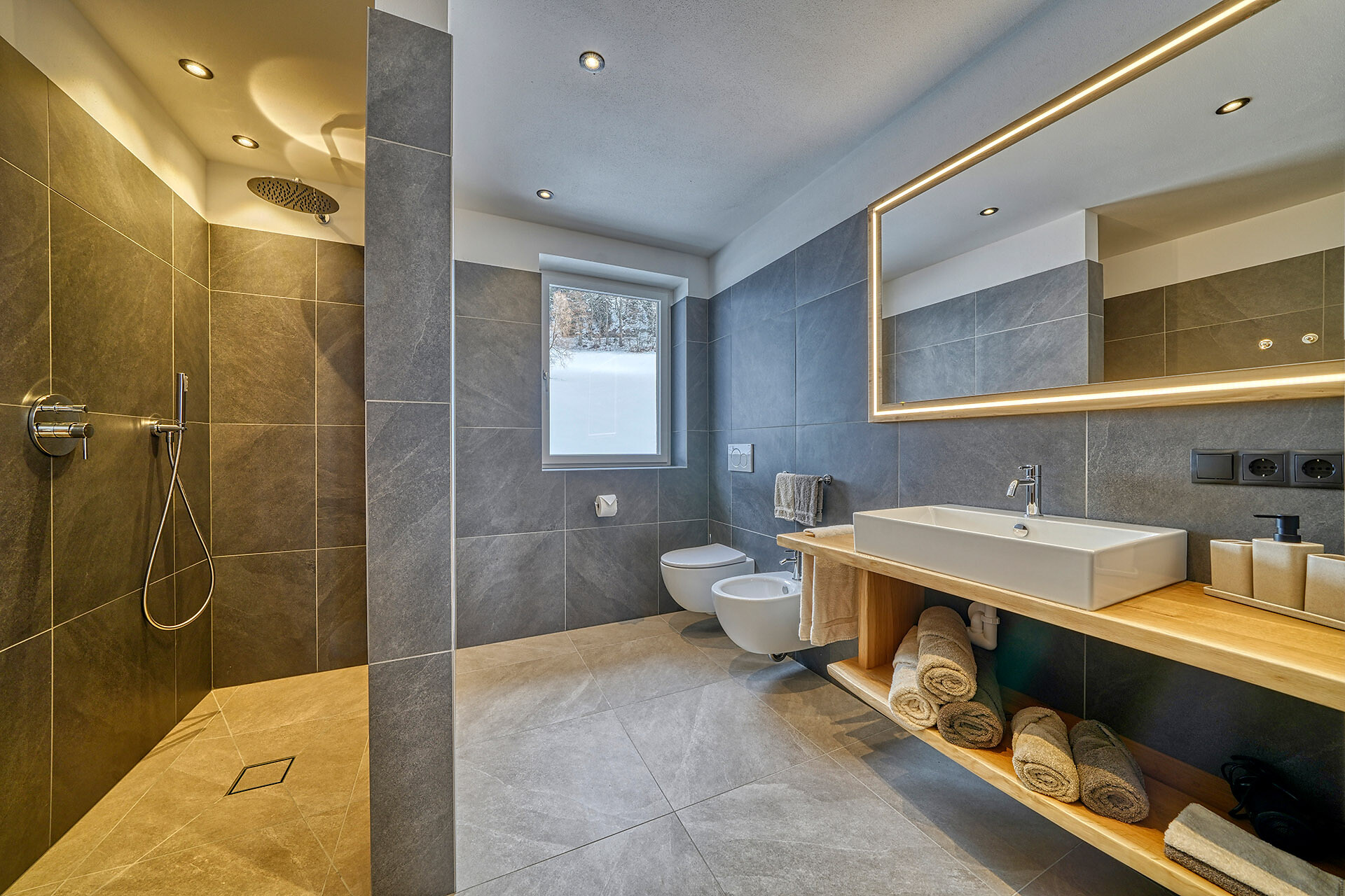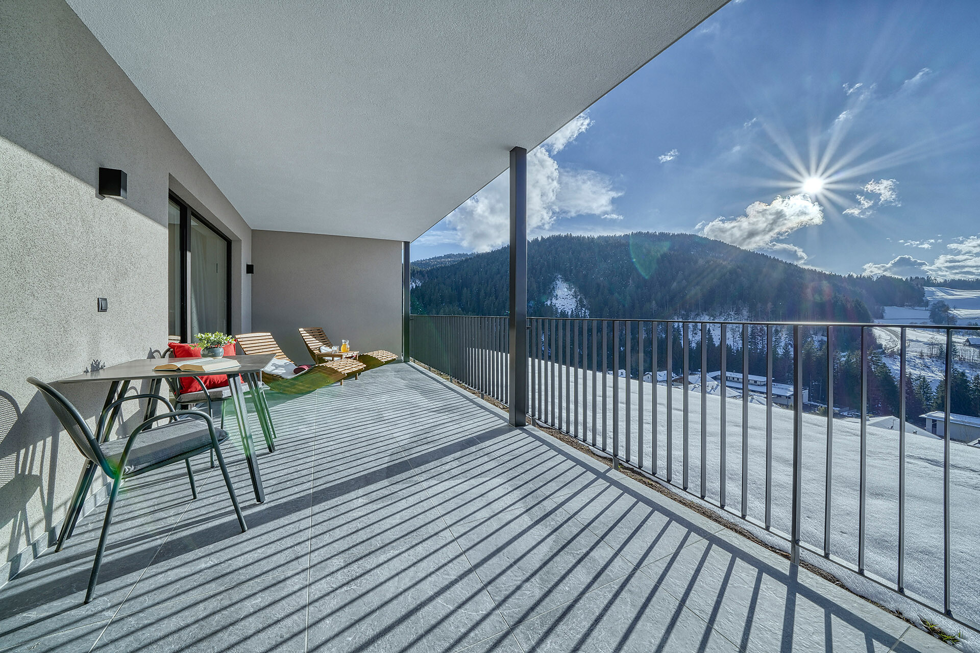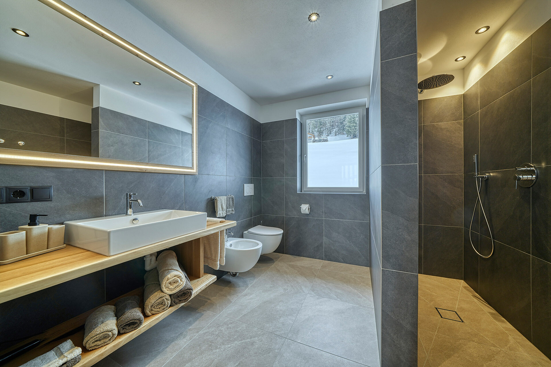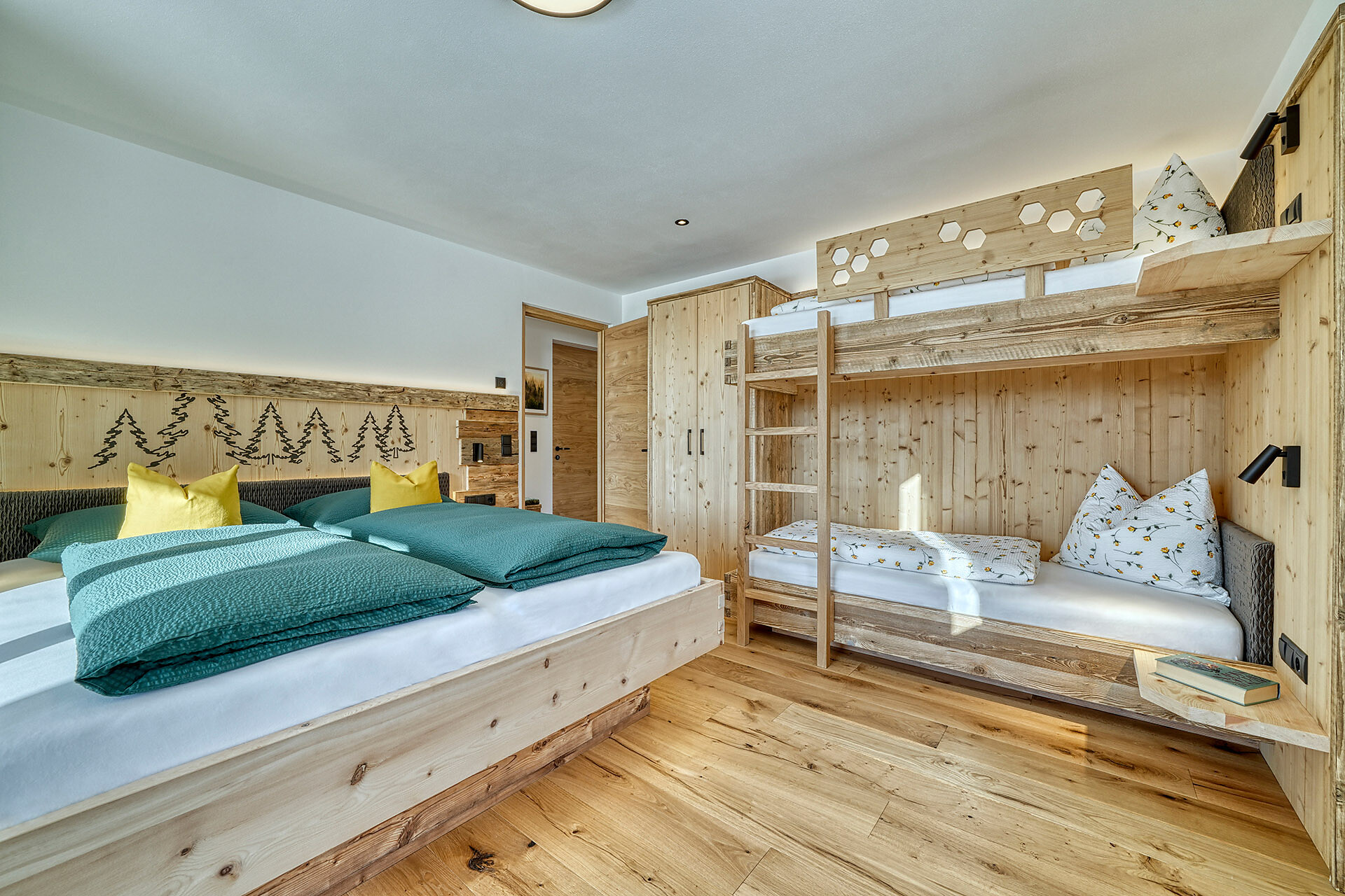 Delicate hay elements bring the scent of our mountain meadows into your forest retreat. Large windows fill the interior with light and open up views of the surrounding woods, while natural materials create a warm and calming atmosphere.