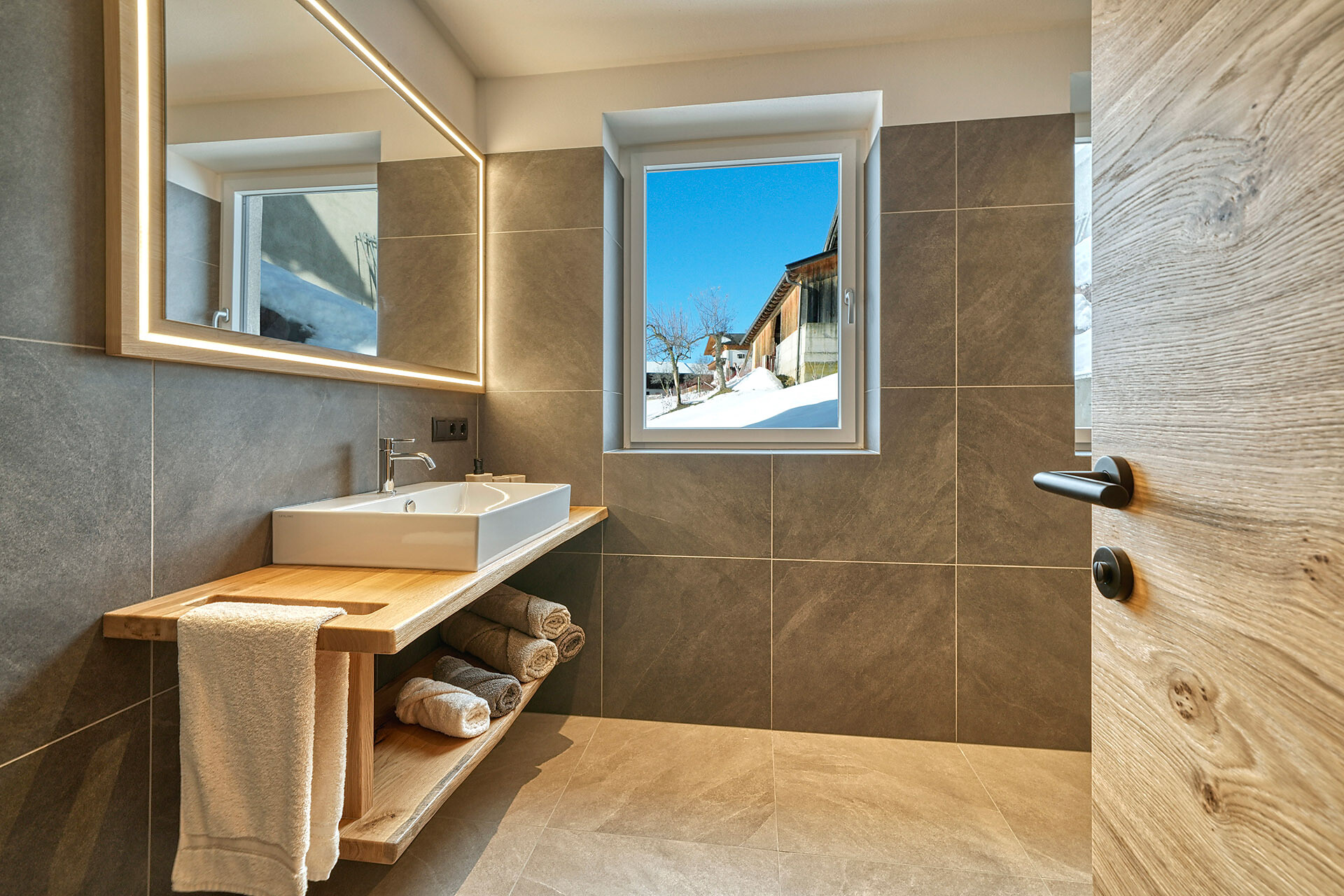 In the bedroom with a double bed, a bathtub awaits with an open view of the mountains – perfect for a candlelit bath. As evening falls, the gentle crackle of the stove fills the room with cozy light, allowing the hours to slow down and the mind to unwind.