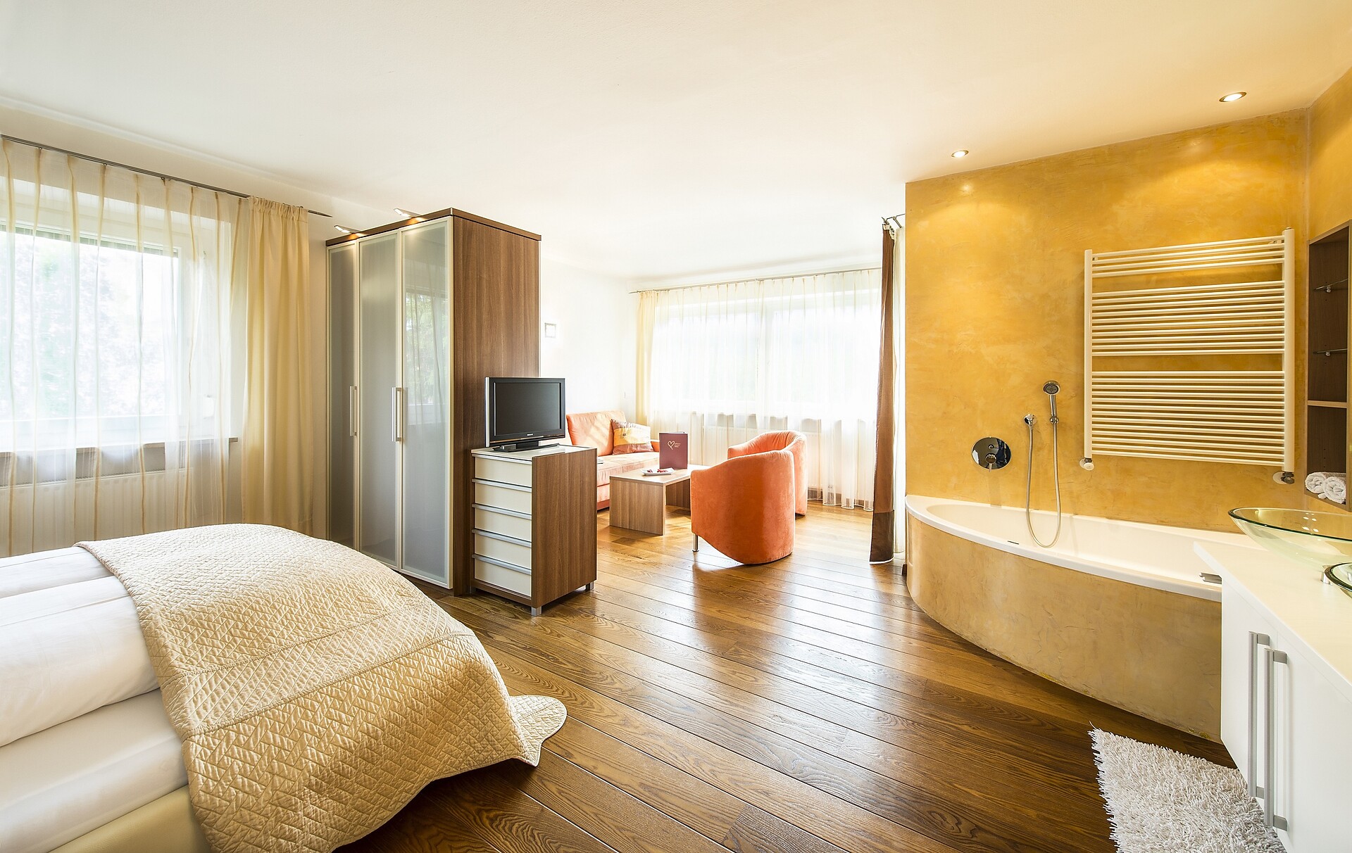 Suite, Double bed , Sofa bed, Balcony, Safe, Shower / Bath tub, TV, WLAN, Main building