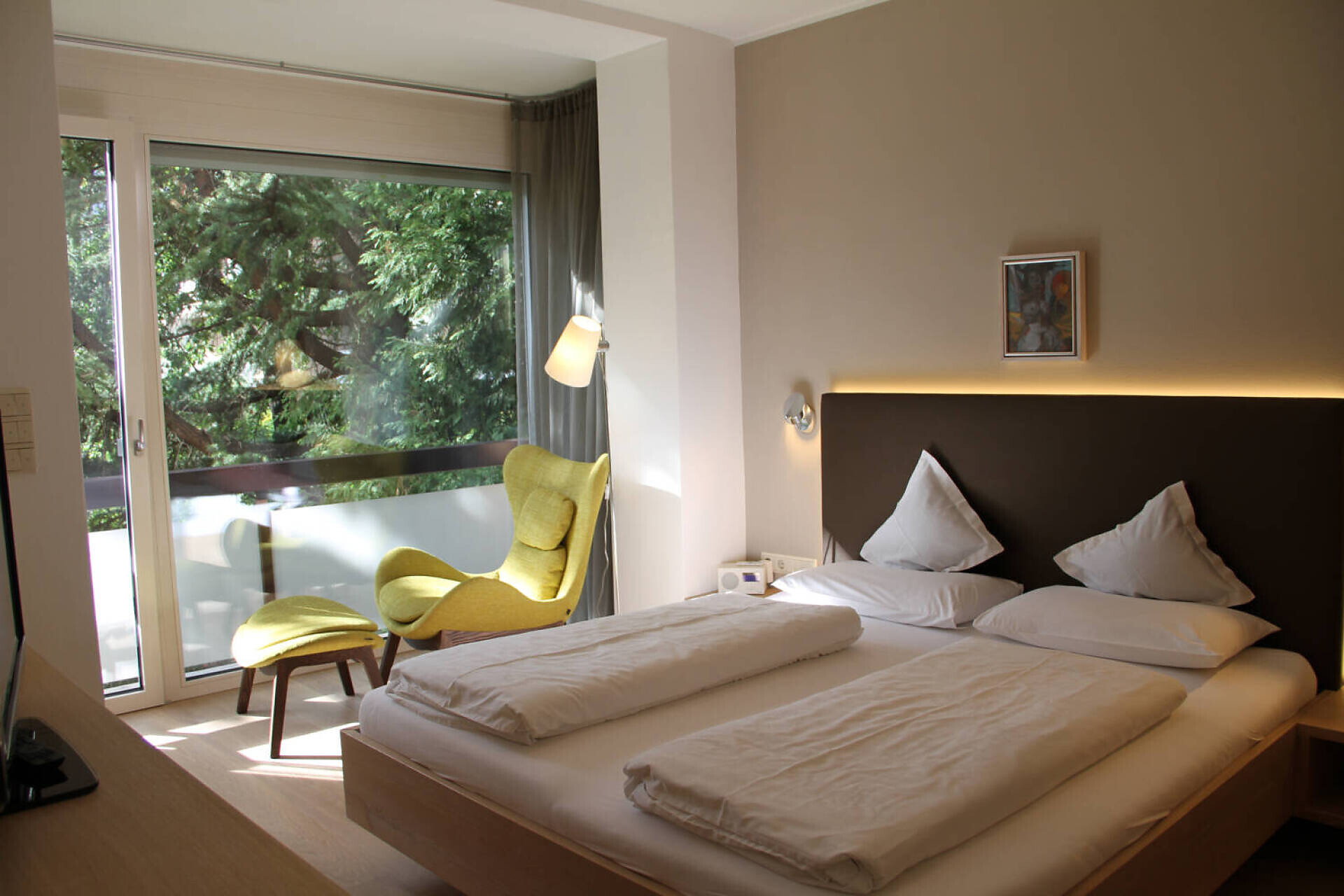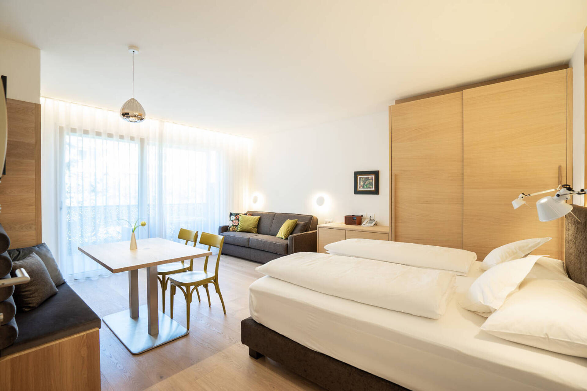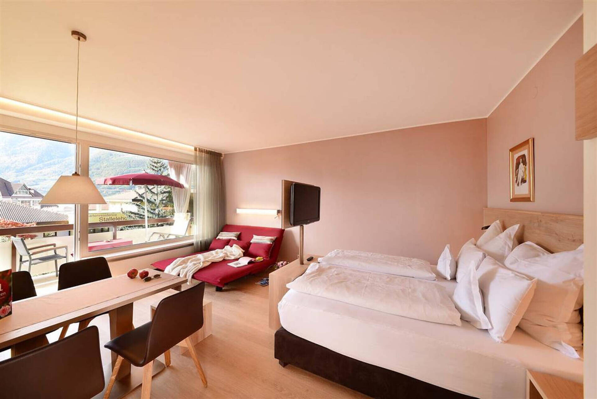 NUOVO: camera-salotto con letto matrimoniale boxspring di altissima qualitá, divano (= letto matrim. 160 cm), tv 50", panca, tavolo e sedie, bagno con doccia, water, fon, grande balcone 10 m² tranquillo o piccolo giardinetto 18 m² con sole la mattina, con tavolino, sedie e sdrai; tv, DAB-radio, telefono e cassaforte, stendipanni, wifi