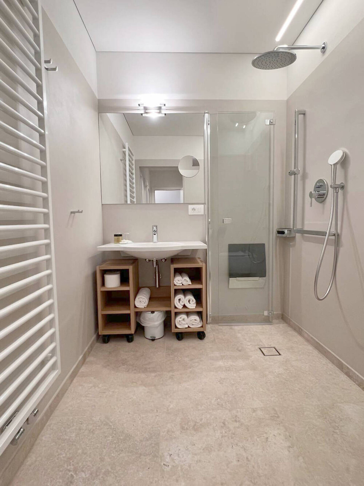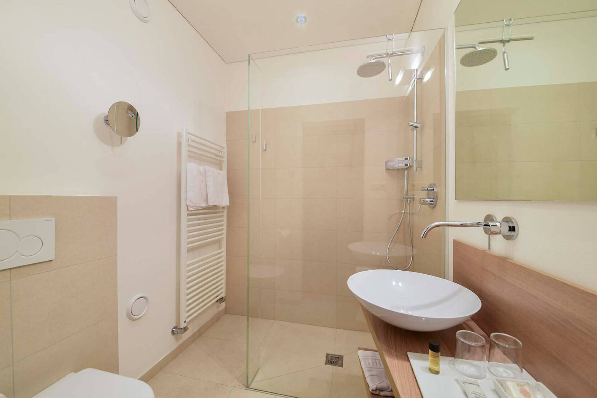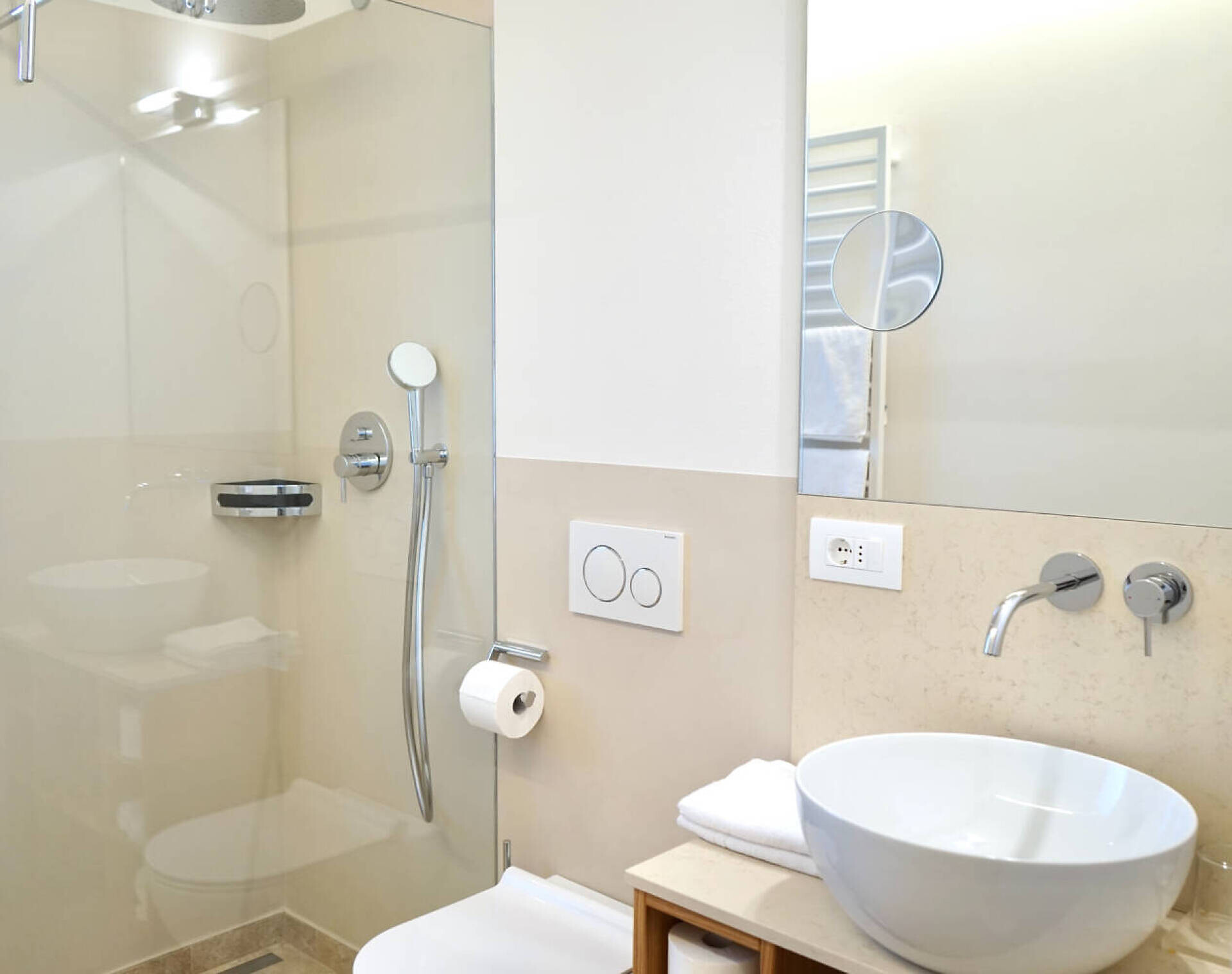 NUOVO: camera-salotto con letto matrimoniale boxspring di altissima qualitá, divano (= letto matrim. 160 cm), tv 50", panca, tavolo e sedie, bagno con doccia, water, fon, grande balcone 10 m² tranquillo o piccolo giardinetto 18 m² con sole la mattina, con tavolino, sedie e sdrai; tv, DAB-radio, telefono e cassaforte, stendipanni, wifi