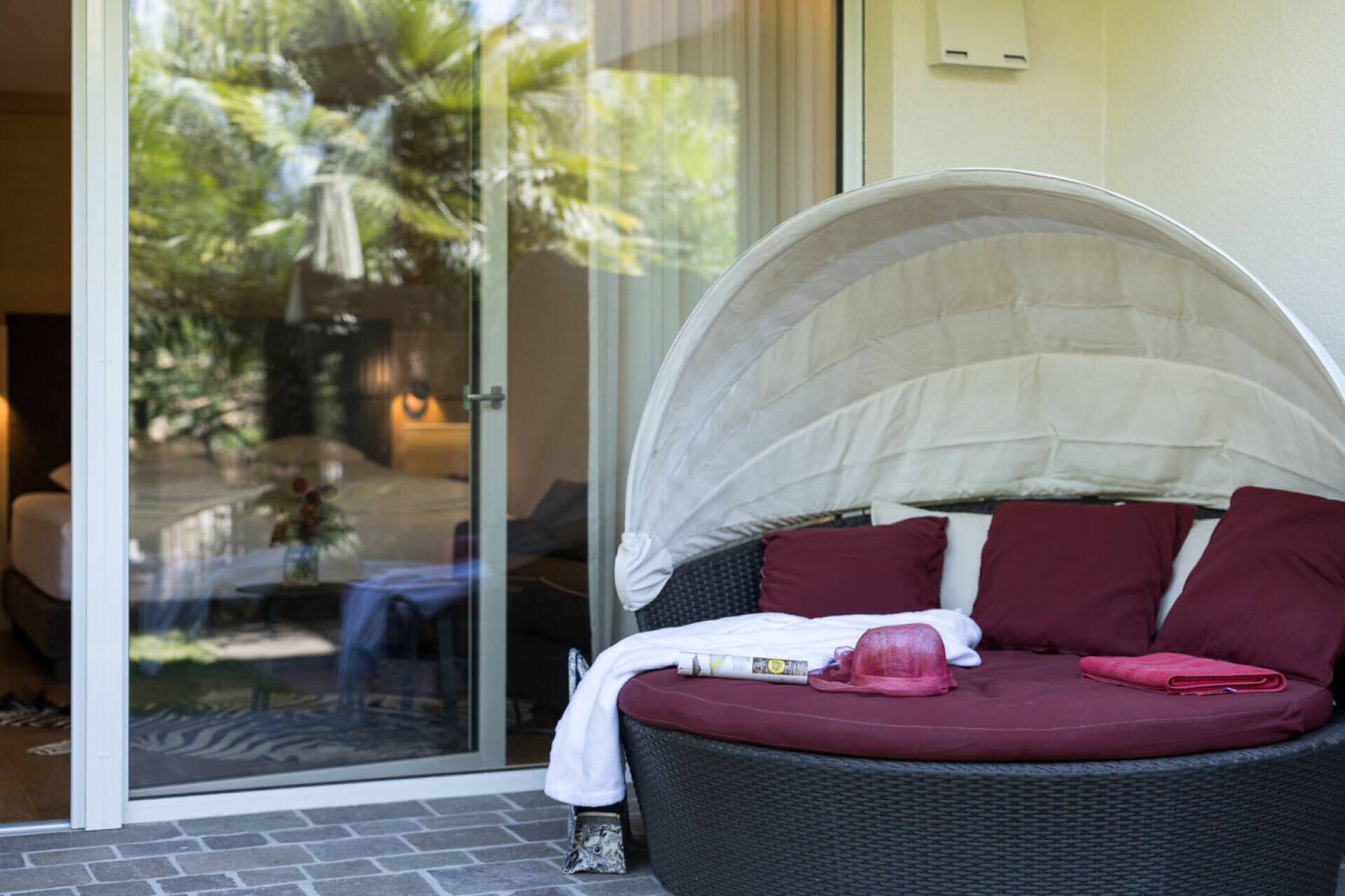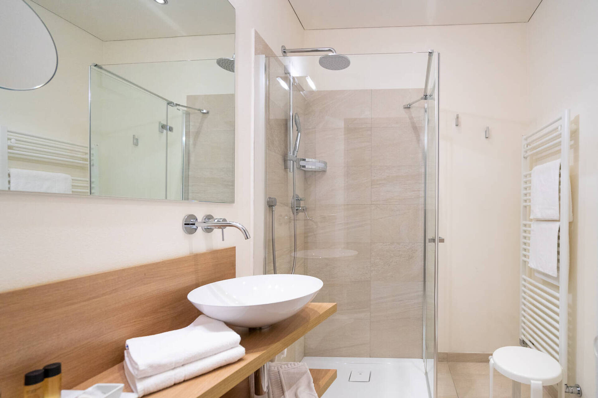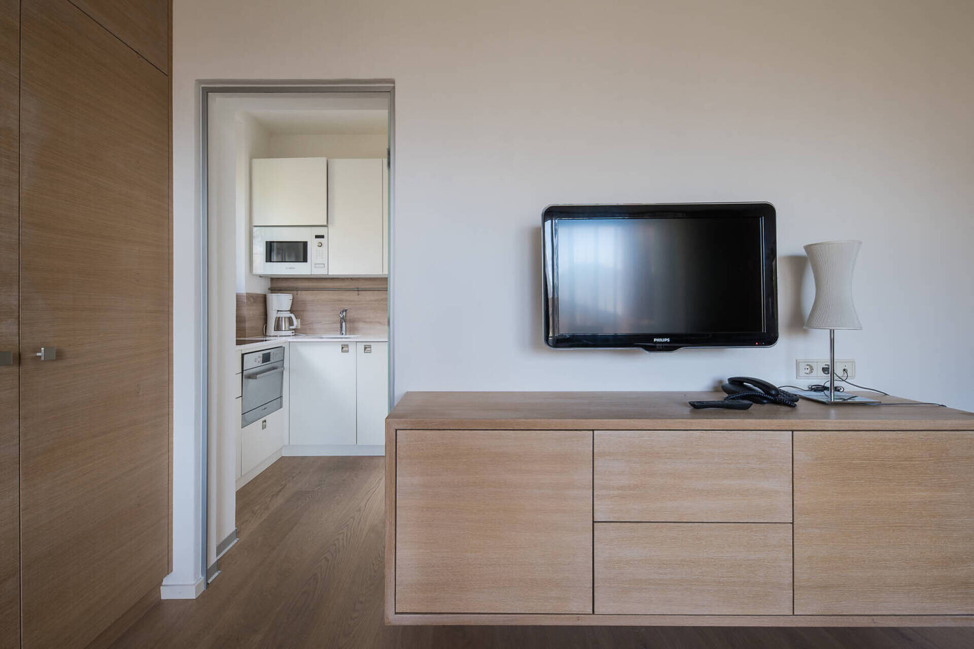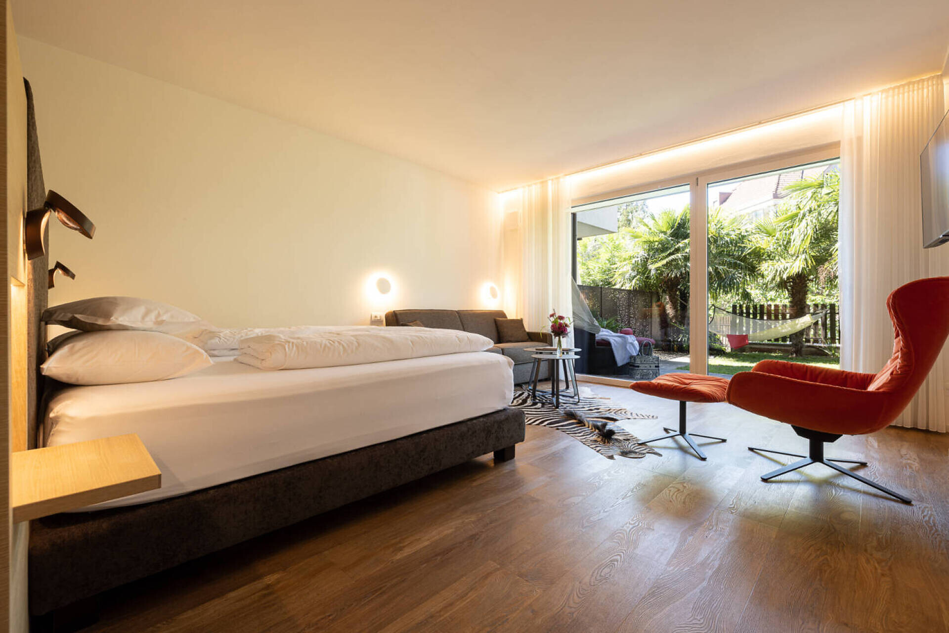 oak plank oiled biologic, high quality boxspring, sofa bed, table zone with chairs, Lcd-TV 50", dab+radio, telephone, safe, frigobar, bathroom with shower o bath, hairdryer, big balcony 10 m² north or south with table, chairs, deck chairs, Wifi,