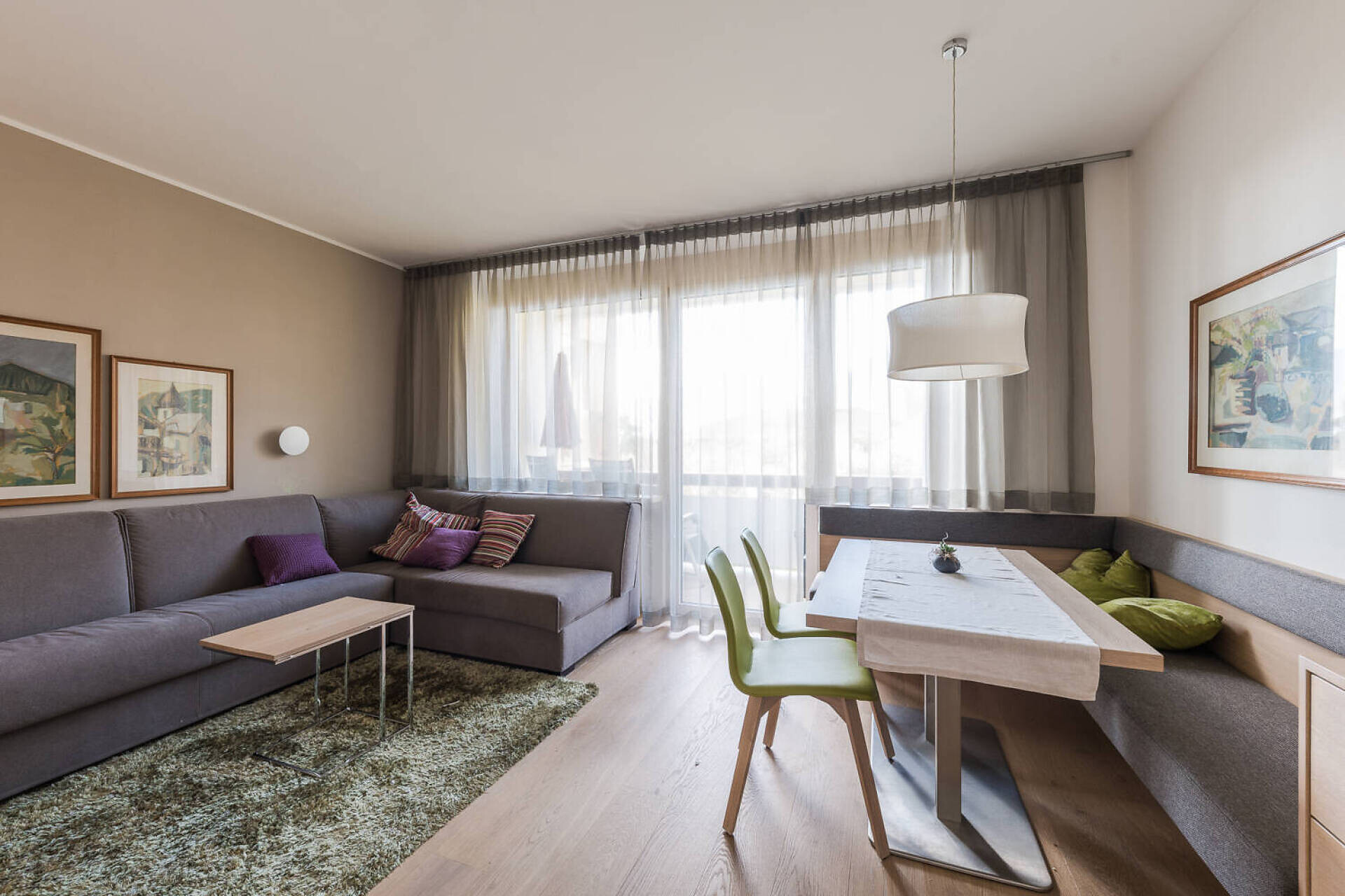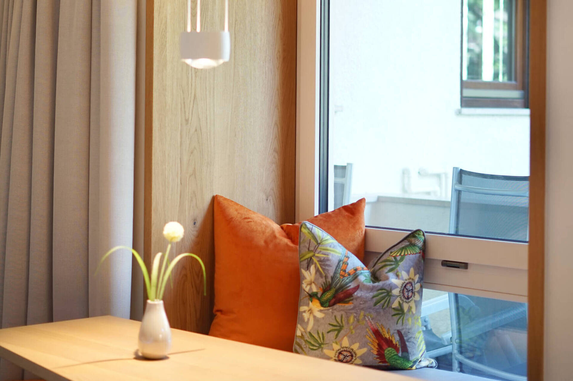 floor in oak oiled biologic, double bed boxspring 1,60 m large, nearbay window with table area, couch, tv 43", telephone, safe, kitchenette, bathroom with window and shower, big balcony north side with table, chairs und deck chairs, side garden view, loundry rack, wifi