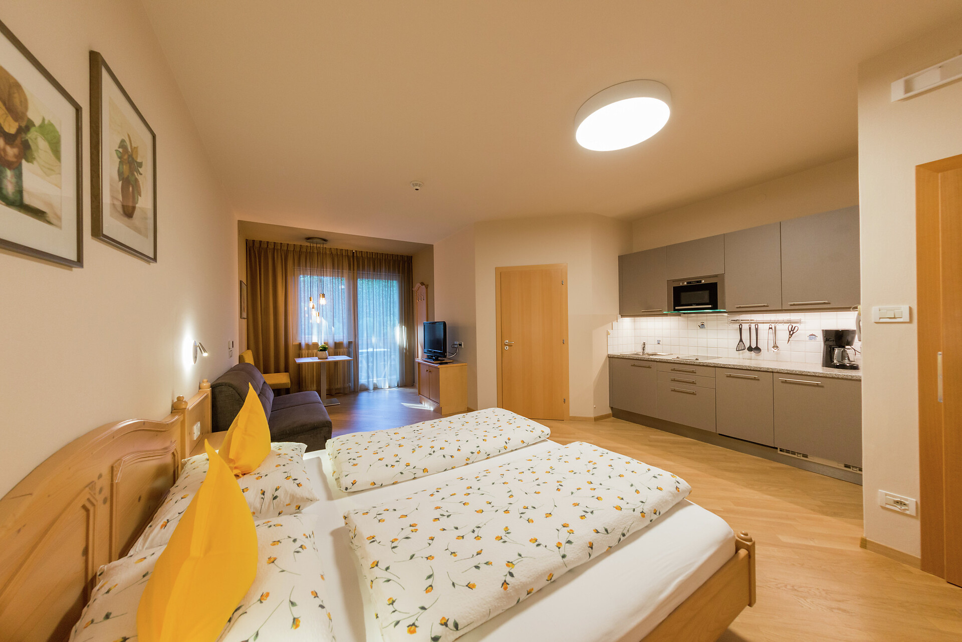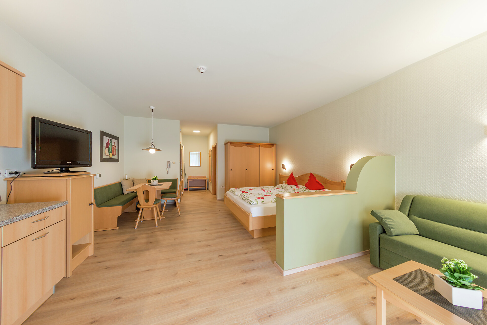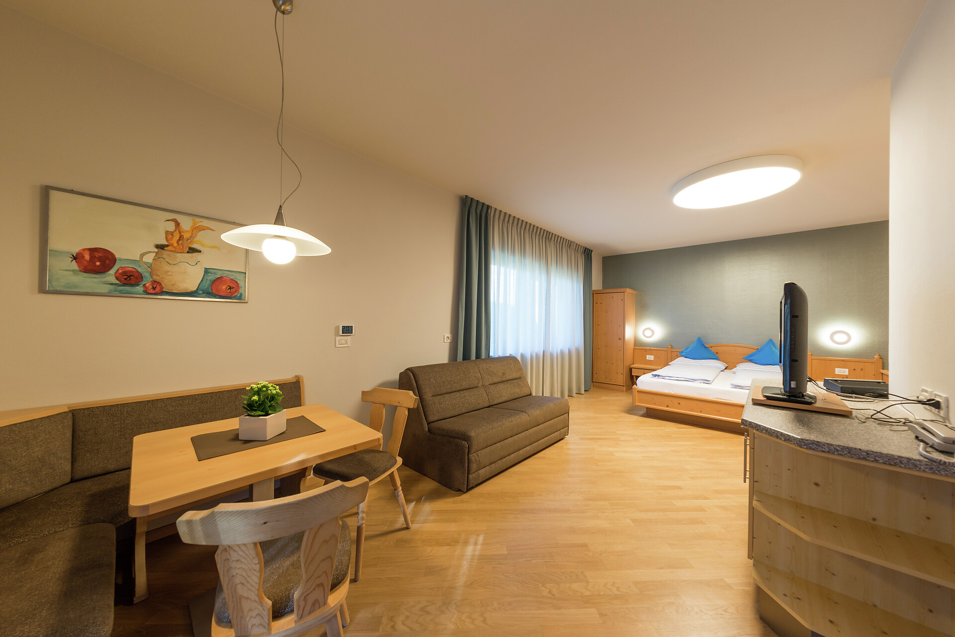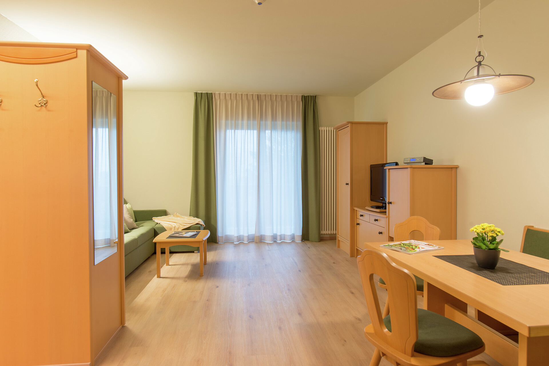 Living/sleeping area with double bed, pull-out sofa bed, cosy dining area, SAT-TV, radio, telephone and safe. Well-equipped kitchenette with 2 ceramic hob, fridge, coffee machine, electric kettle, dishwasher and microwave. Large bathroom with shower, WC, bidet, hairdryer, window. Shower and hand soap, cosmetic towels and toilet paper are available.