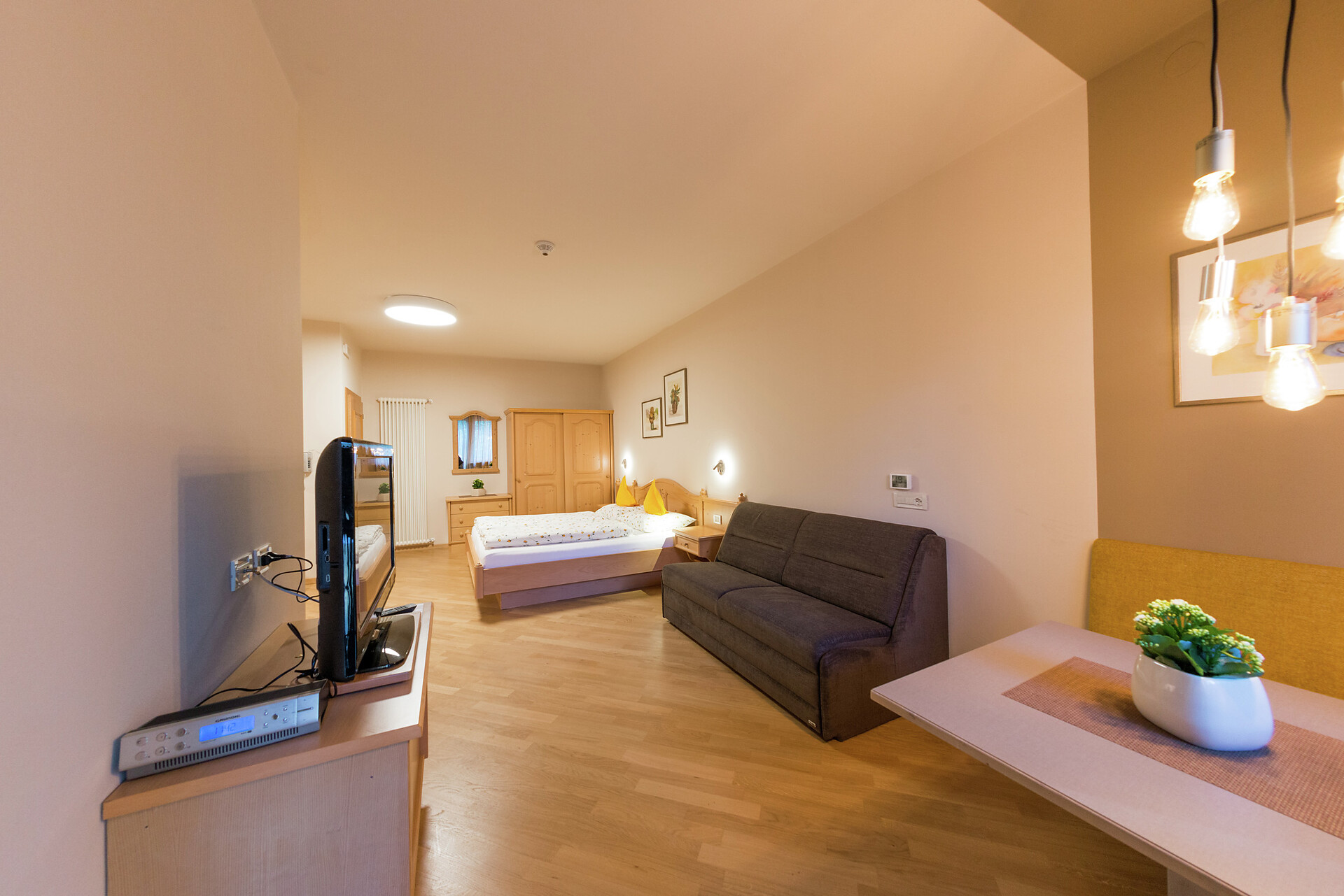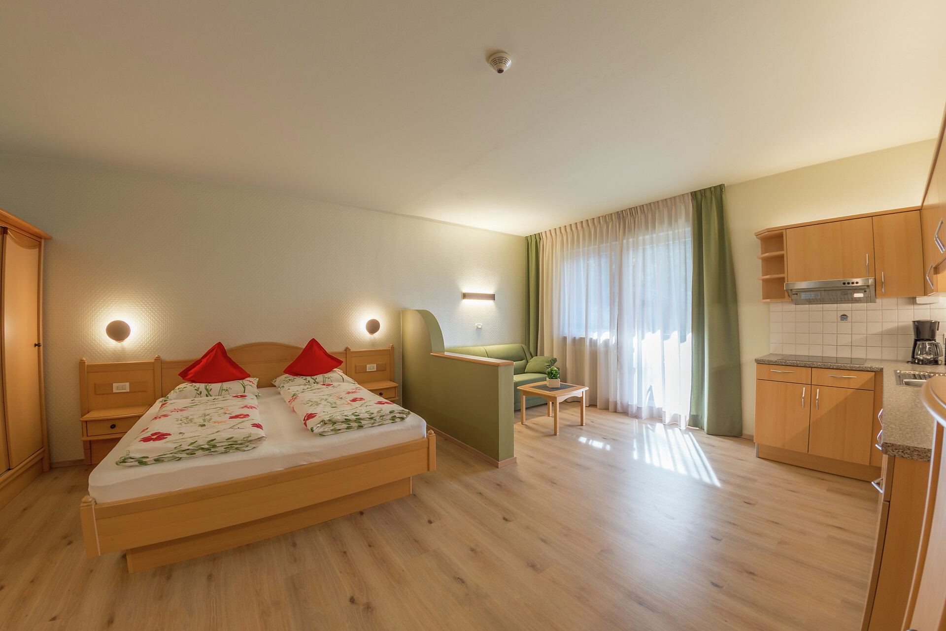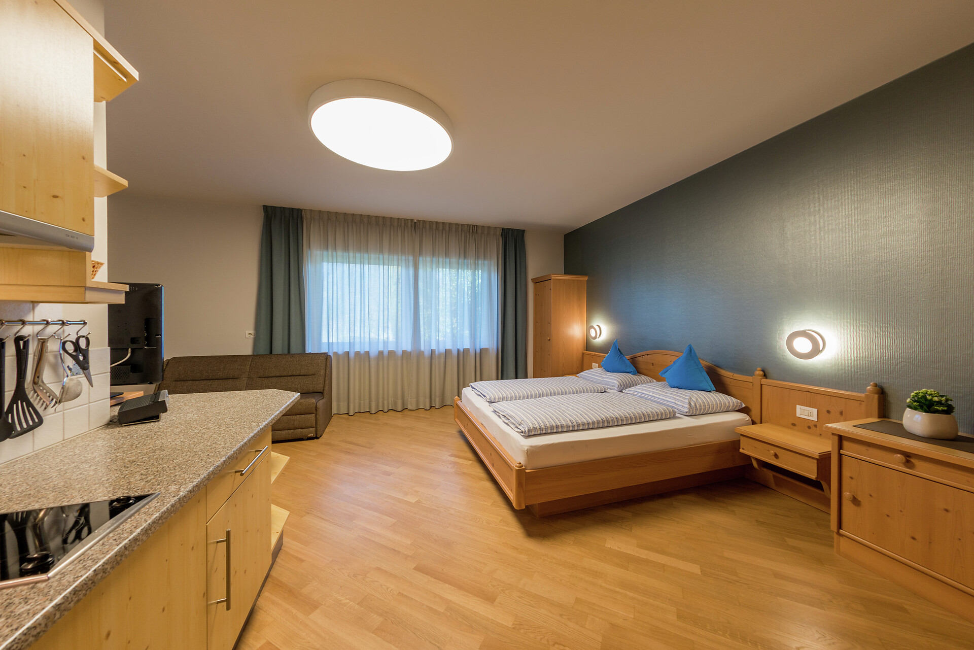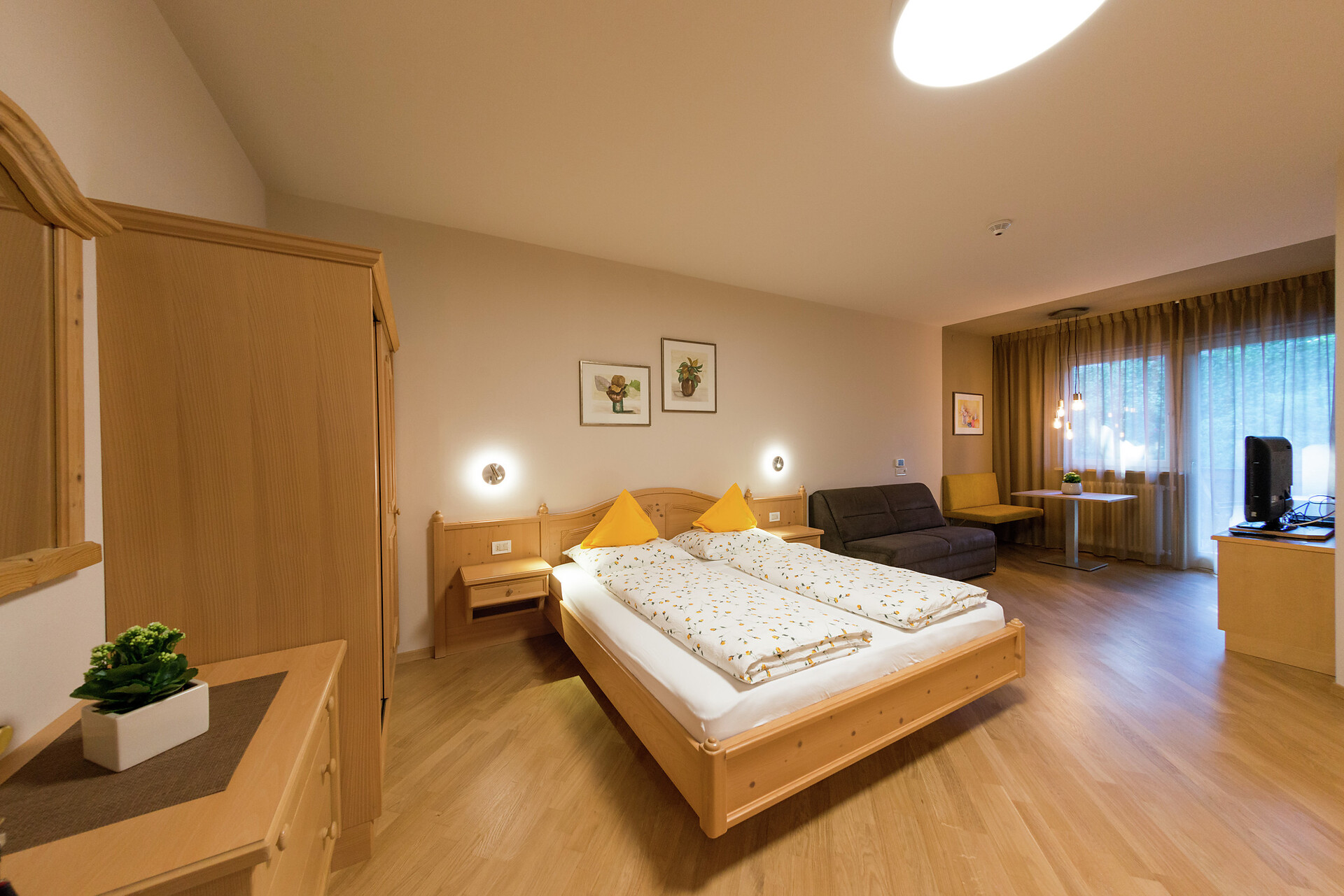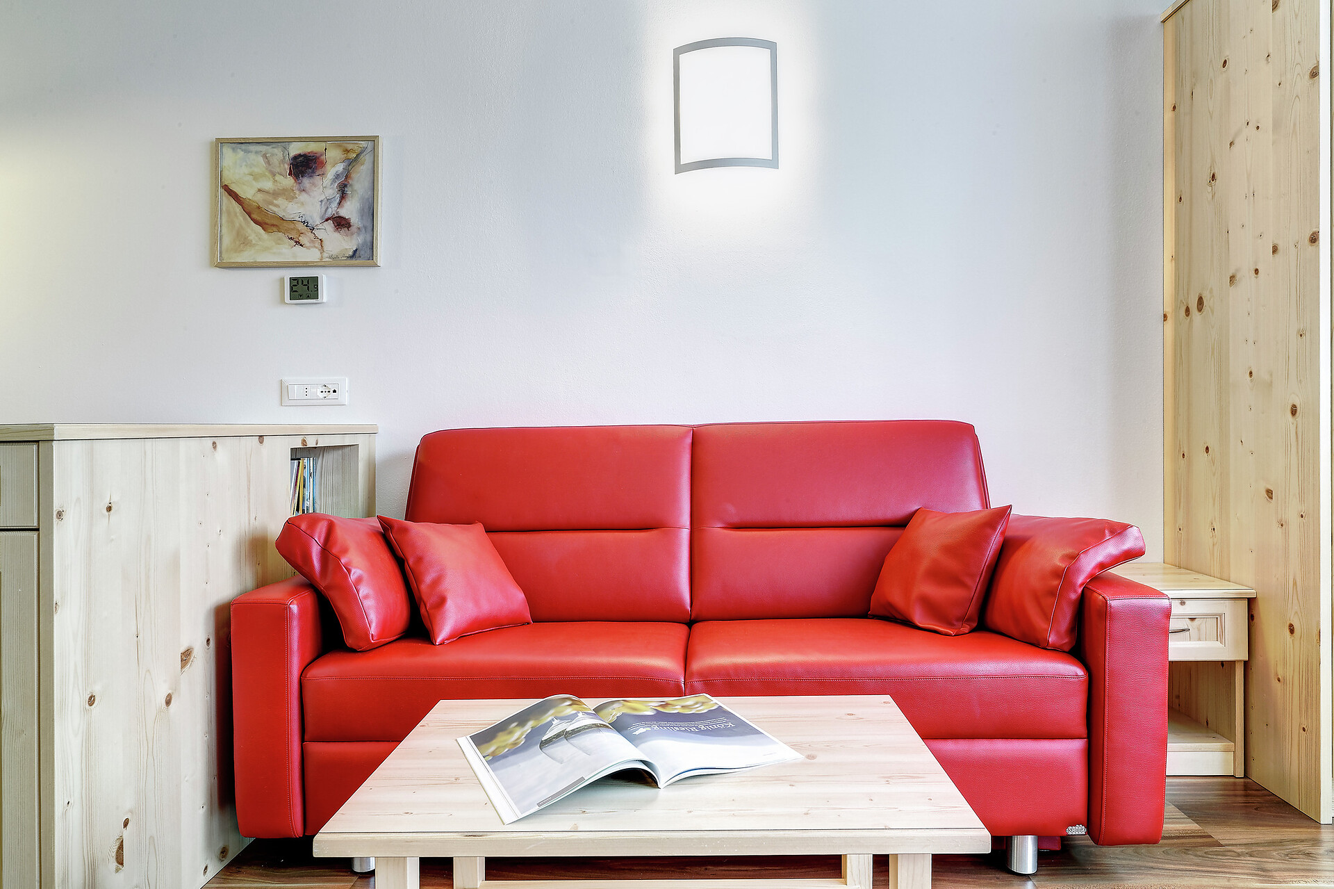 Living/sleeping area with double bed, pull-out sofa bed, cosy dining area, SAT-TV, radio, telephone and safe. Well-equipped kitchenette with 2 ceramic hob, fridge, coffee machine, electric kettle, dishwasher and microwave. Large bathroom with shower, WC, bidet, hairdryer, window. Shower and hand soap, cosmetic towels and toilet paper are available.