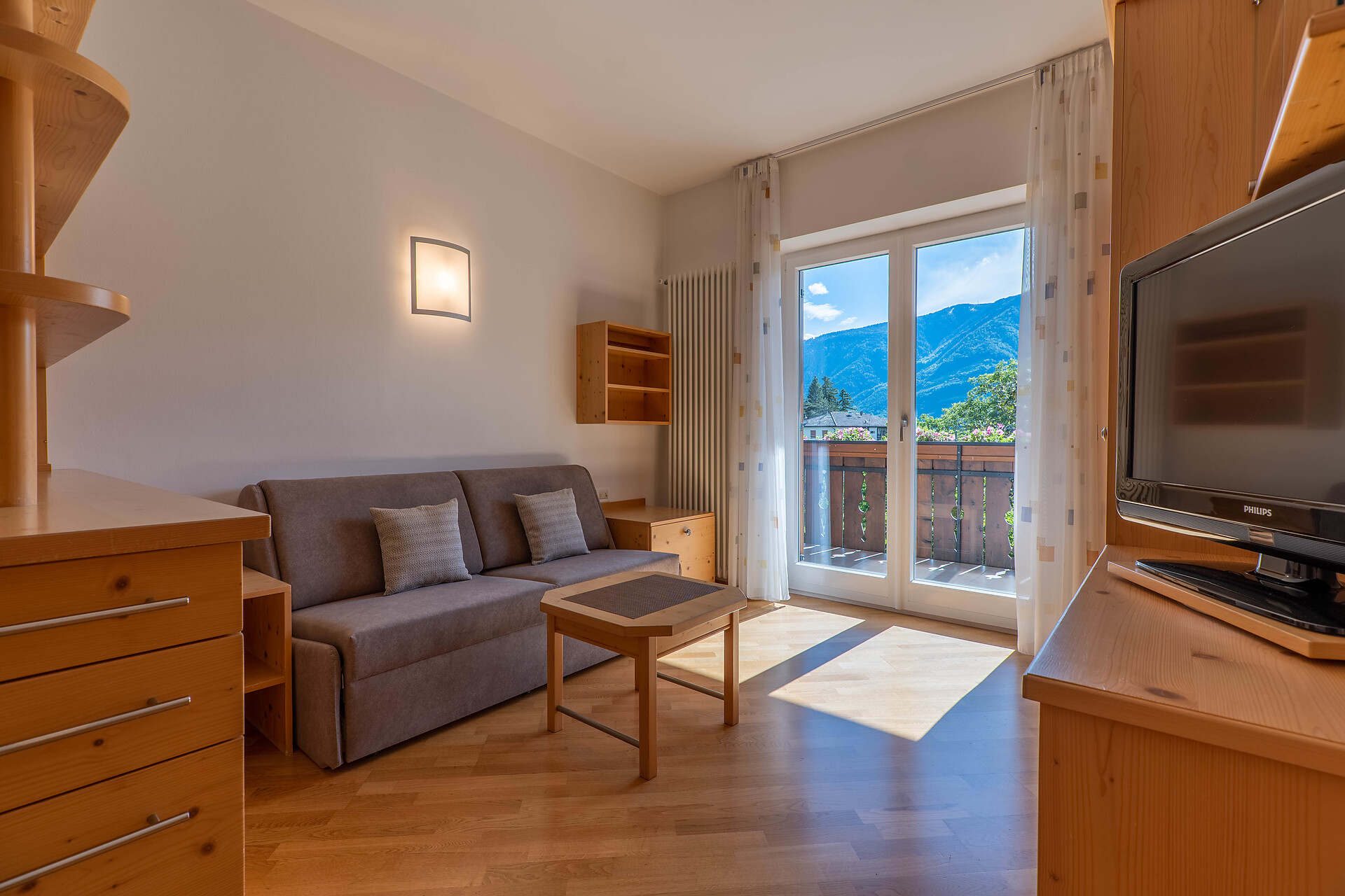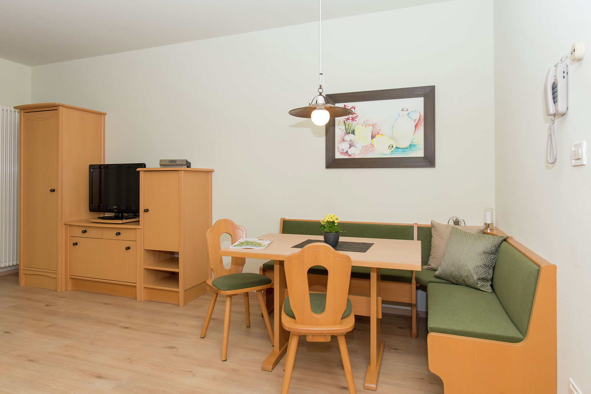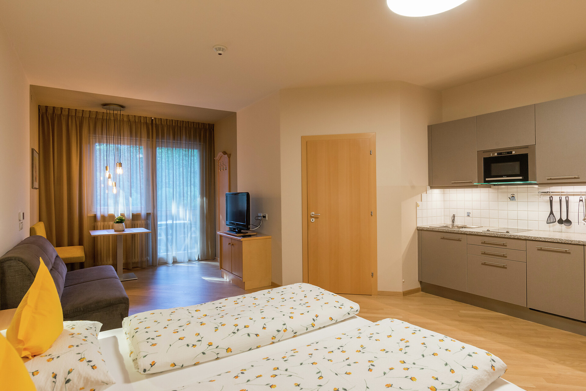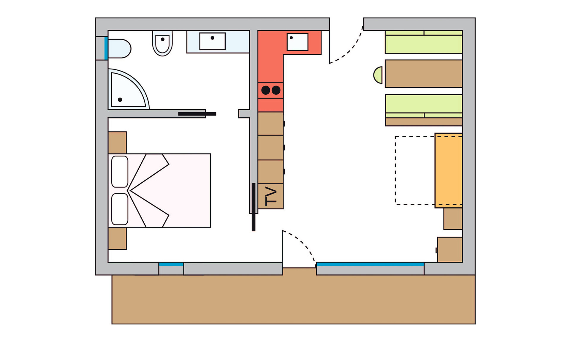 Living/sleeping area with double bed, pull-out sofa bed, cosy dining area, SAT-TV, radio, telephone and safe. Well-equipped kitchenette with 2 ceramic hob, fridge, coffee machine, electric kettle, dishwasher and microwave. Large bathroom with shower, WC, bidet, hairdryer, window. Shower and hand soap, cosmetic towels and toilet paper are available.
