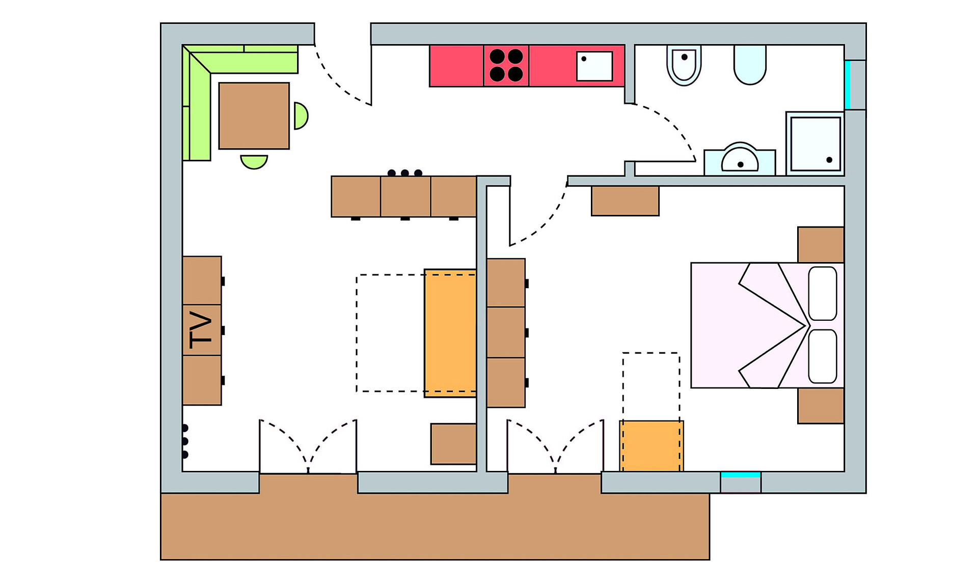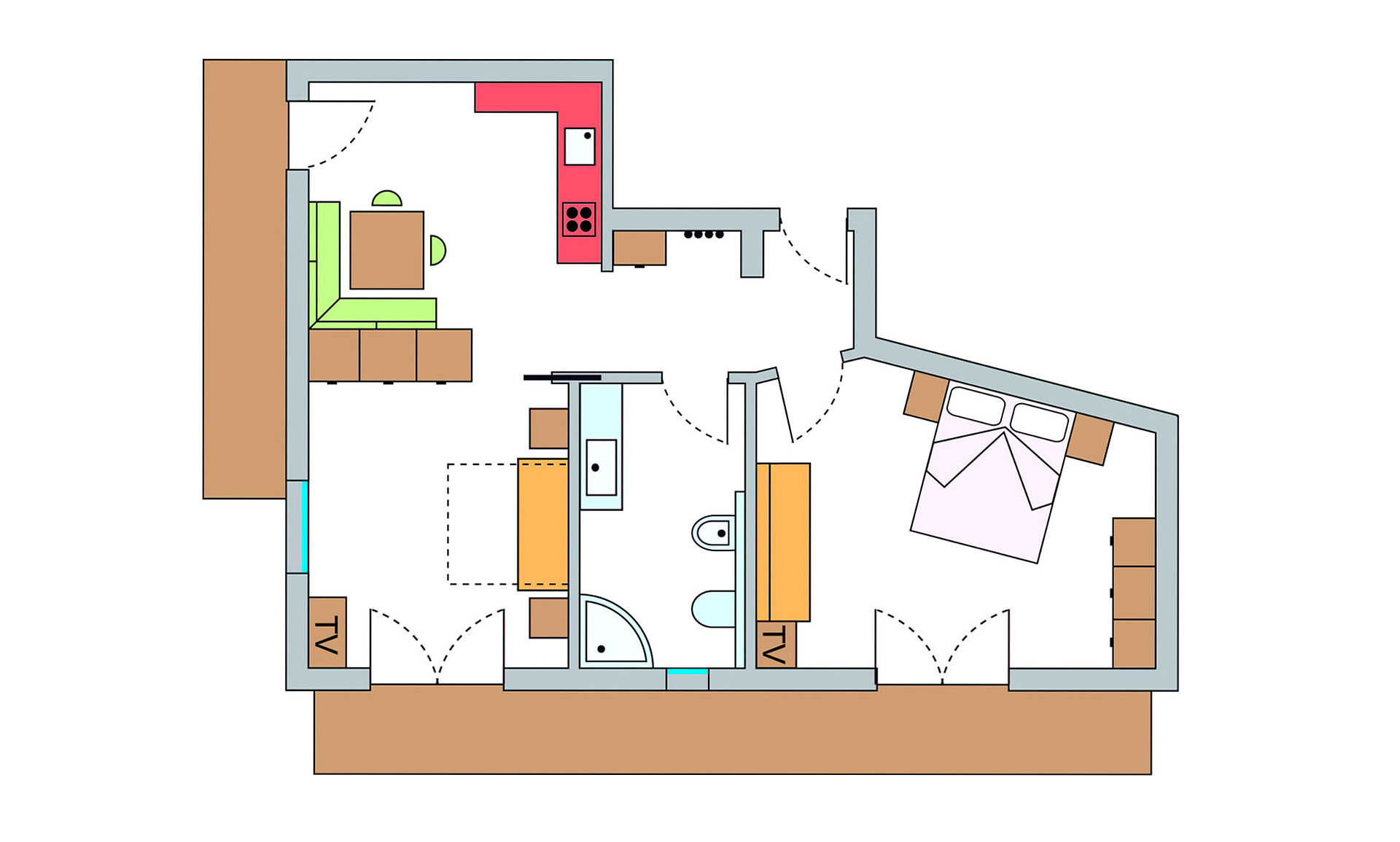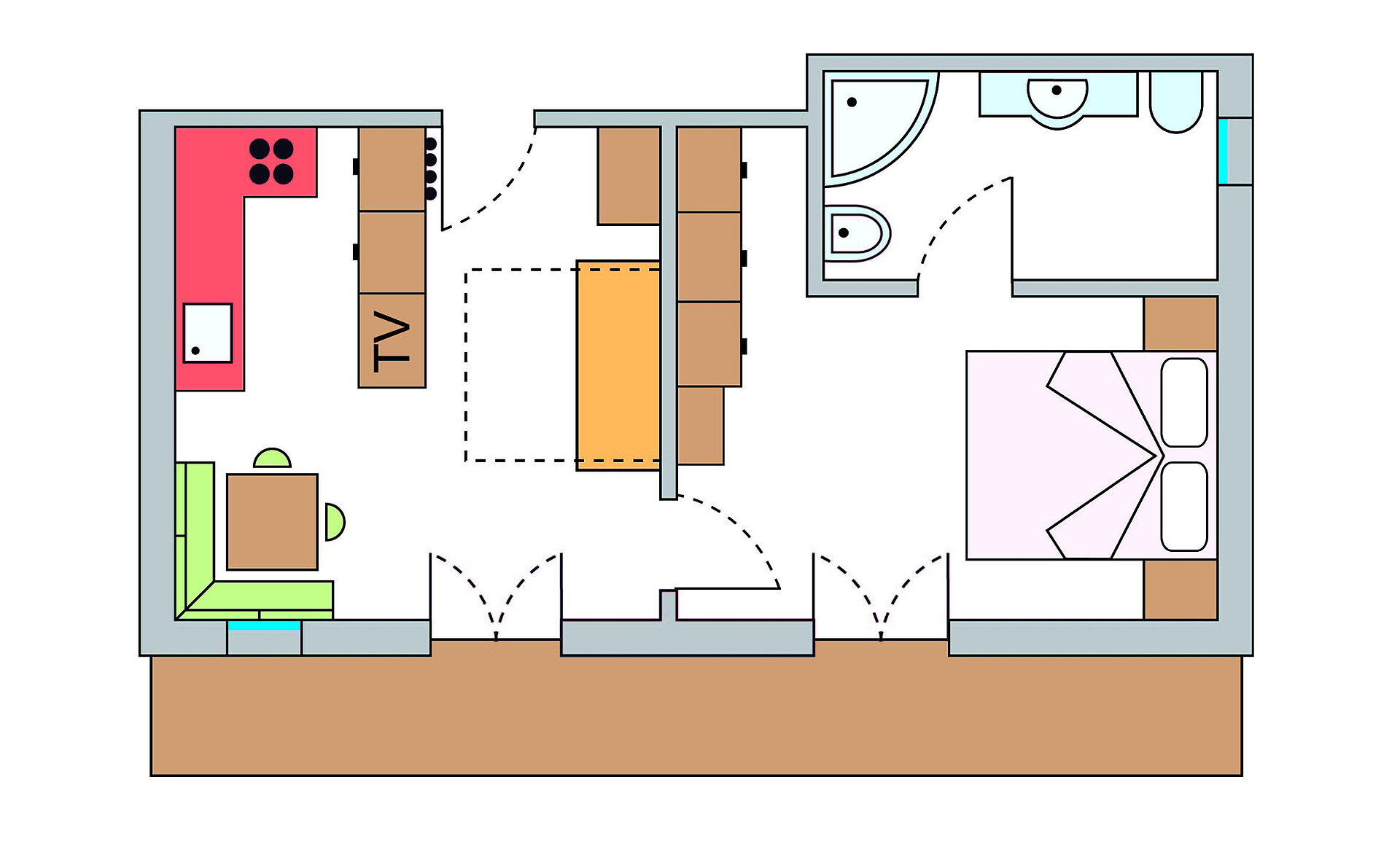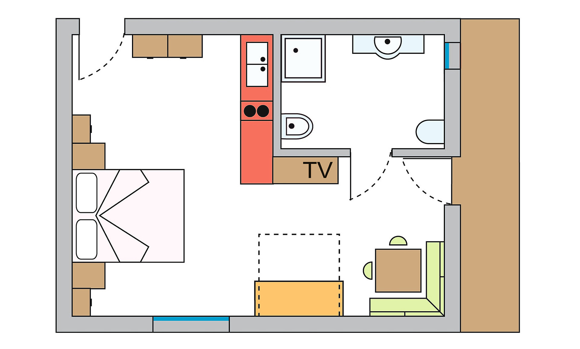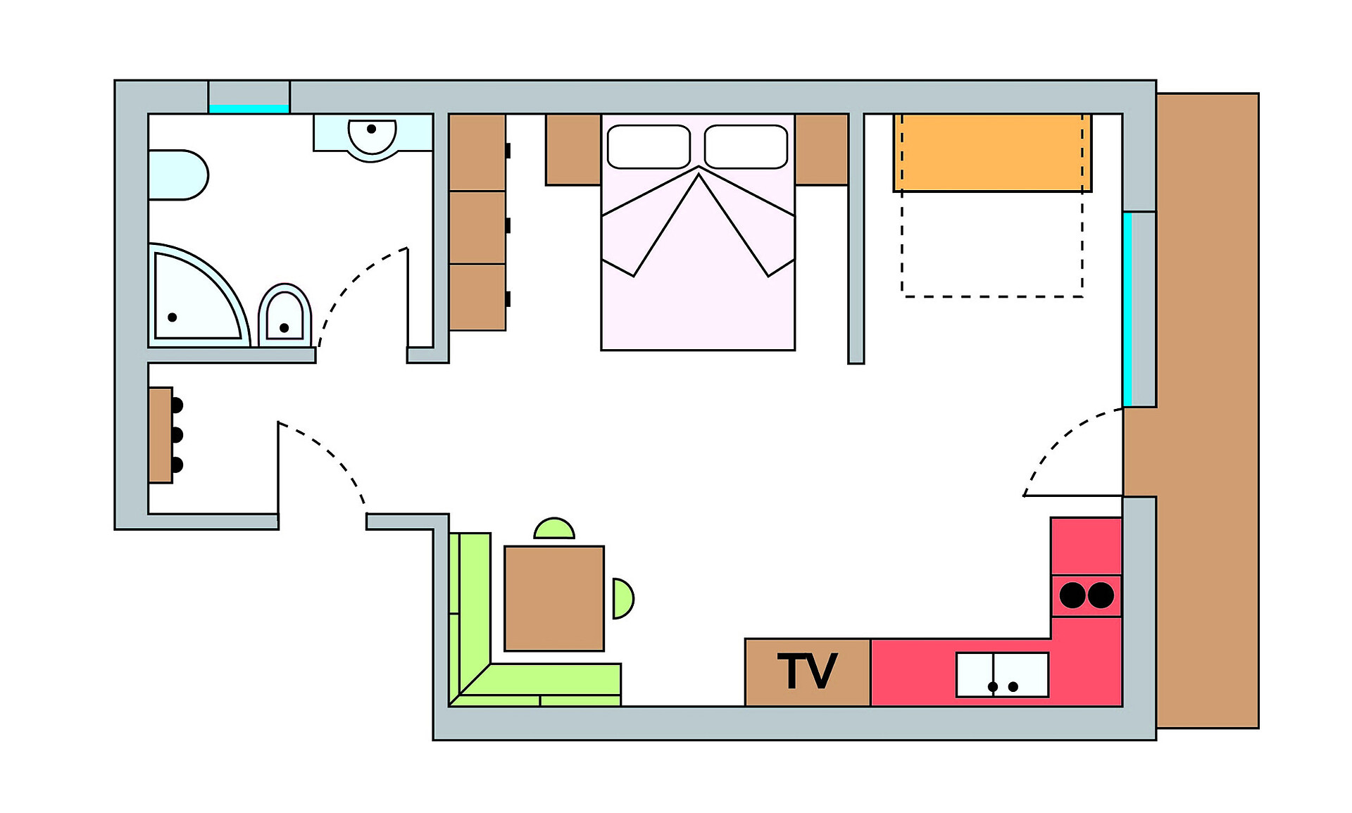 Living/sleeping area with double bed, pull-out sofa bed, cosy dining area, SAT-TV, radio, telephone and safe. Well-equipped kitchenette with 2 ceramic hob, fridge, coffee machine, electric kettle, dishwasher and microwave. Large bathroom with shower, WC, bidet, hairdryer, window. Shower and hand soap, cosmetic towels and toilet paper are available.