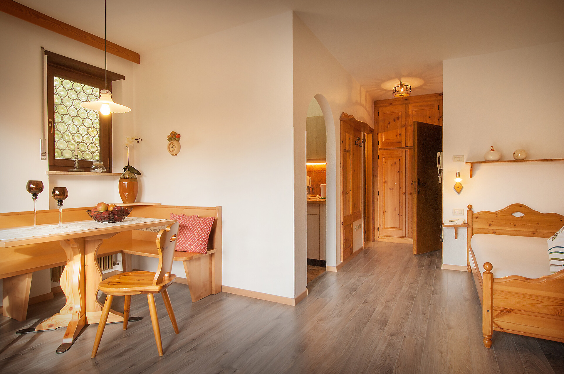 Spacious two-room apartment with separate living room and bedroom and 12 m² south-facing balcony with panoramic views of Dorf Tirol and the Texel Group. The Apartment features two bathrooms with window, 2 wall safe.