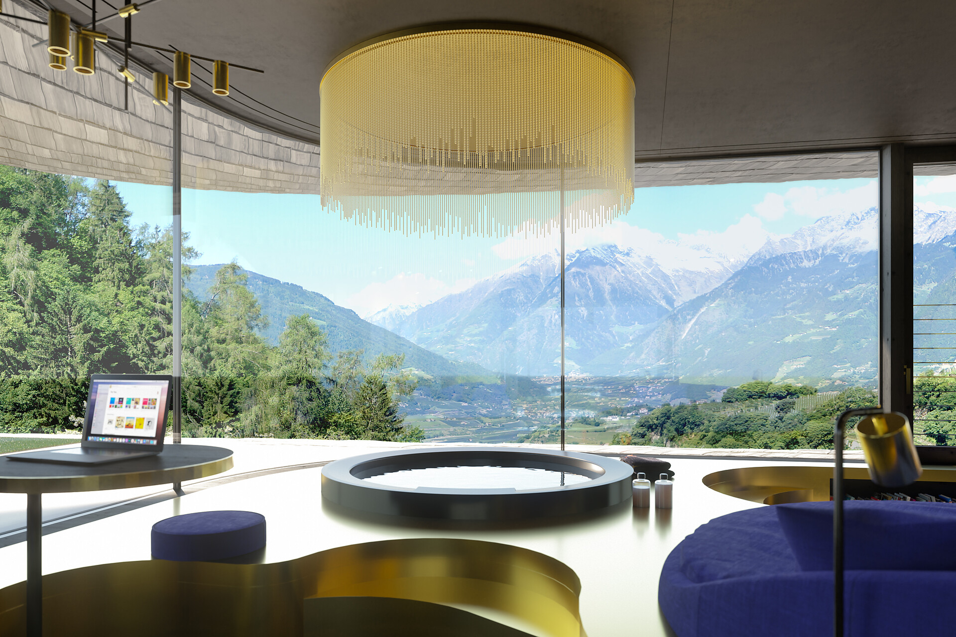 Our suites offer a panoramic balcony with an unobstructed view of Merano. The bedroom has a round box spring bed, the living room is furnished with a round divan and bathtub in front of the large panoramic window. For the highest standards, the suite is equipped with wooden floor, minibar, desk, wardrobe, Smart TV, chandelier and bathroom with panoramic shower.