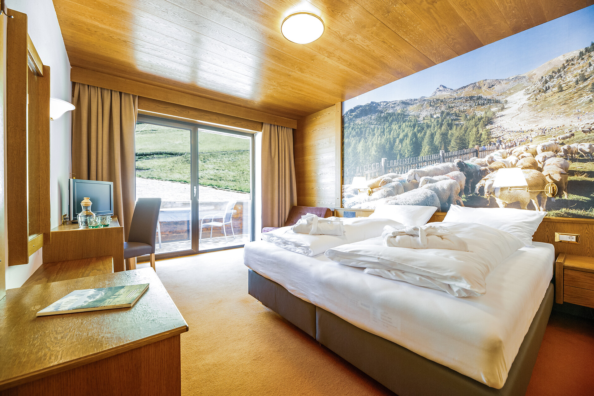 Spacious living, stylish relaxation: in the cozy double room on the 1st or 2nd floors, you’ll find a comfortable box-spring bed and a spacious balcony with impressive mountain views.