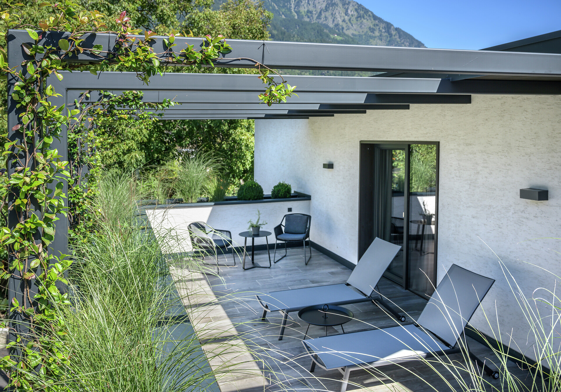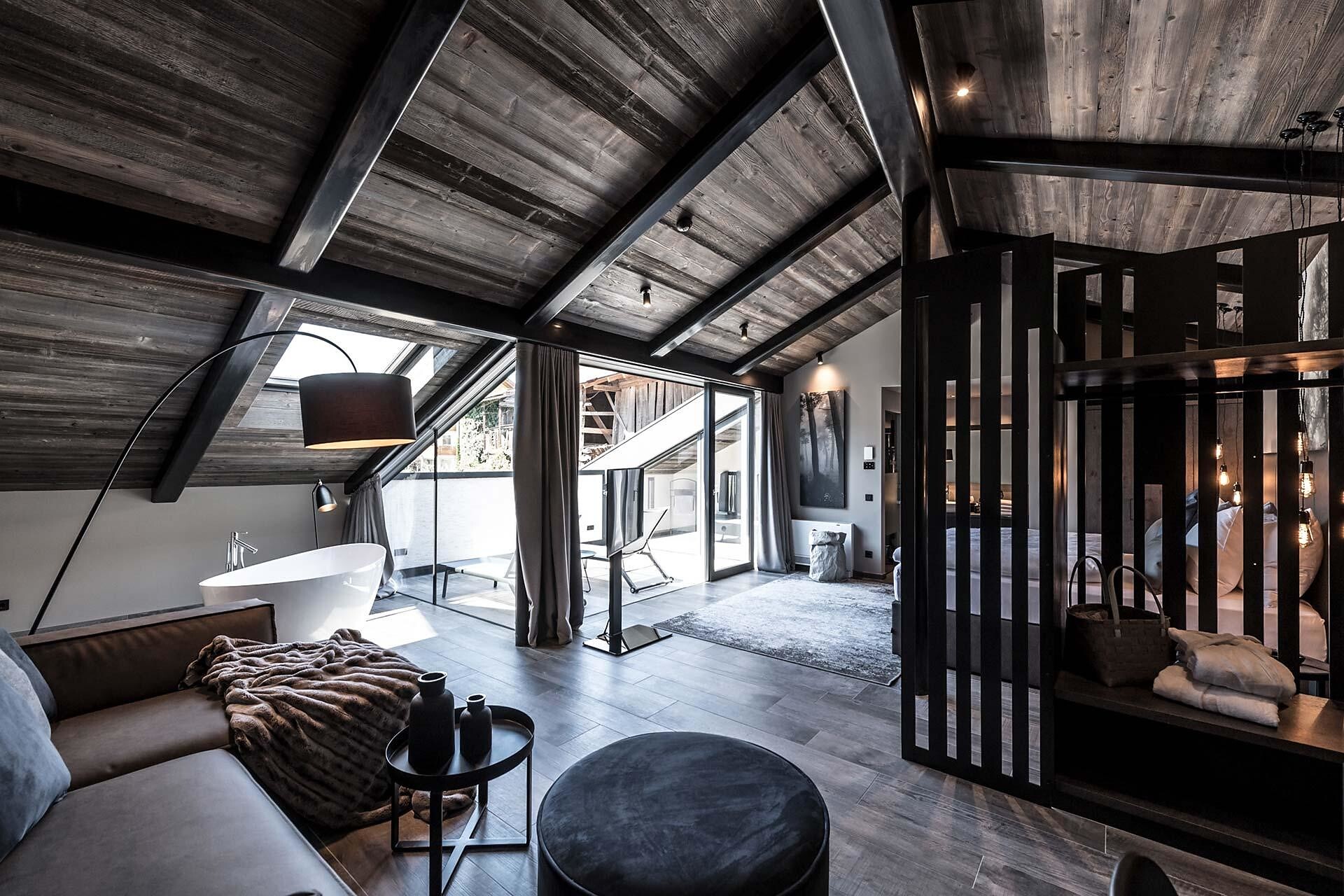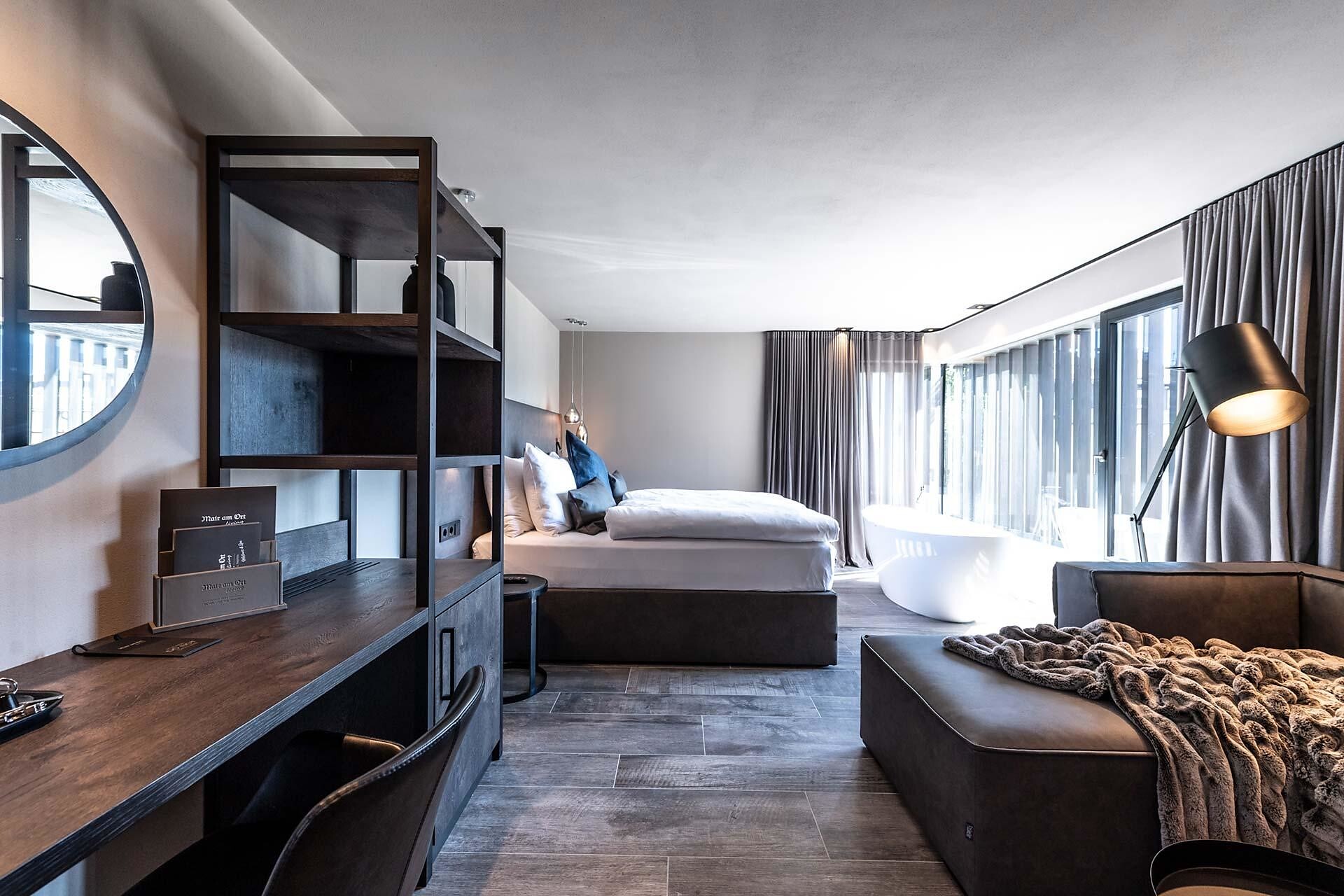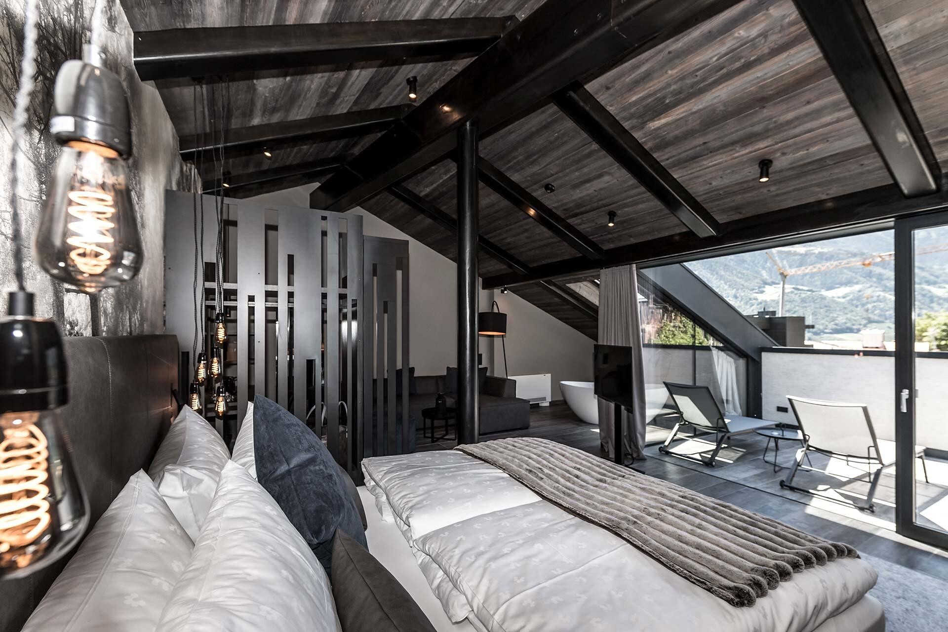 Double room with lounge area (45-50 m²) with a large panoramic terrace, view to Merano and the surrounding mountains