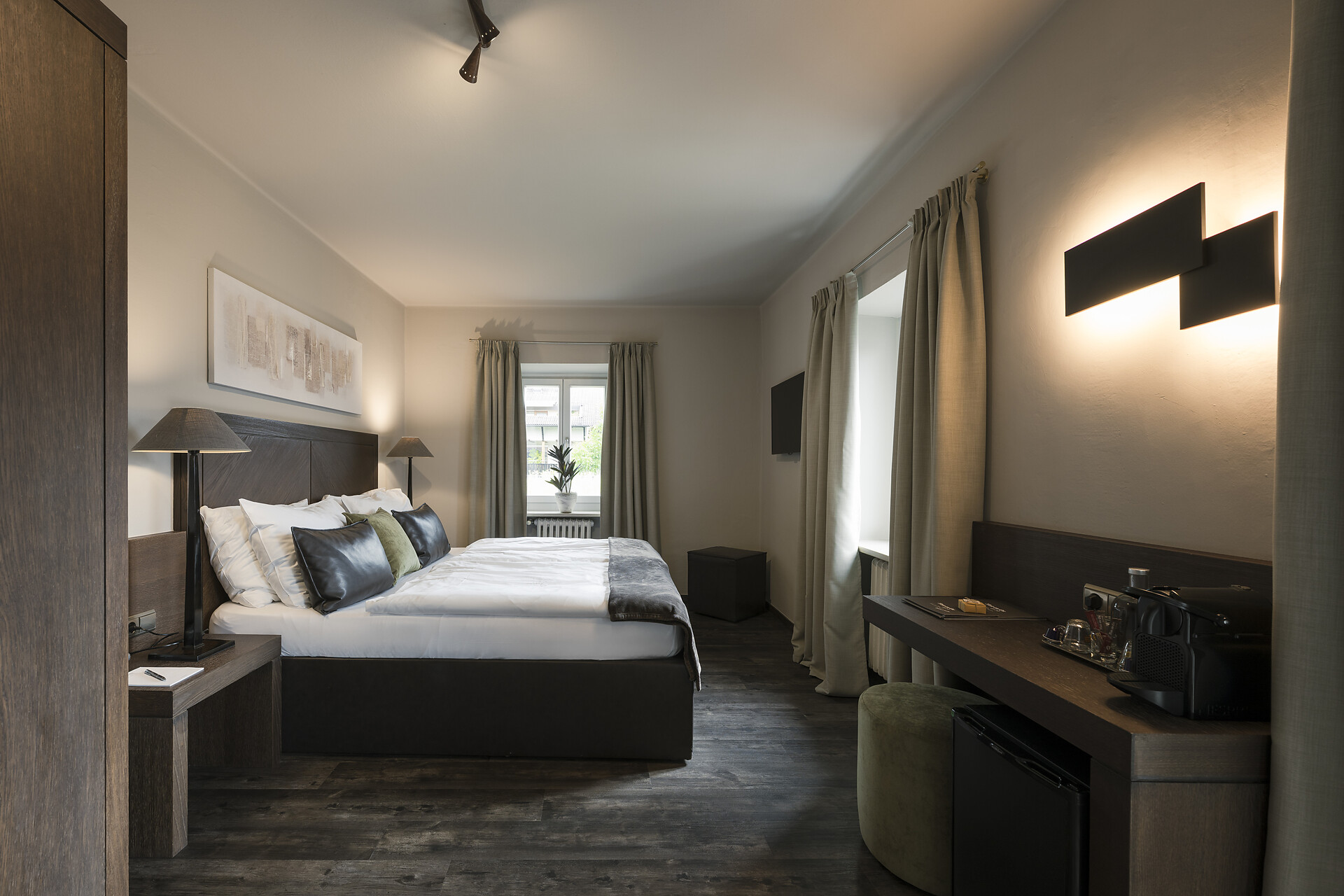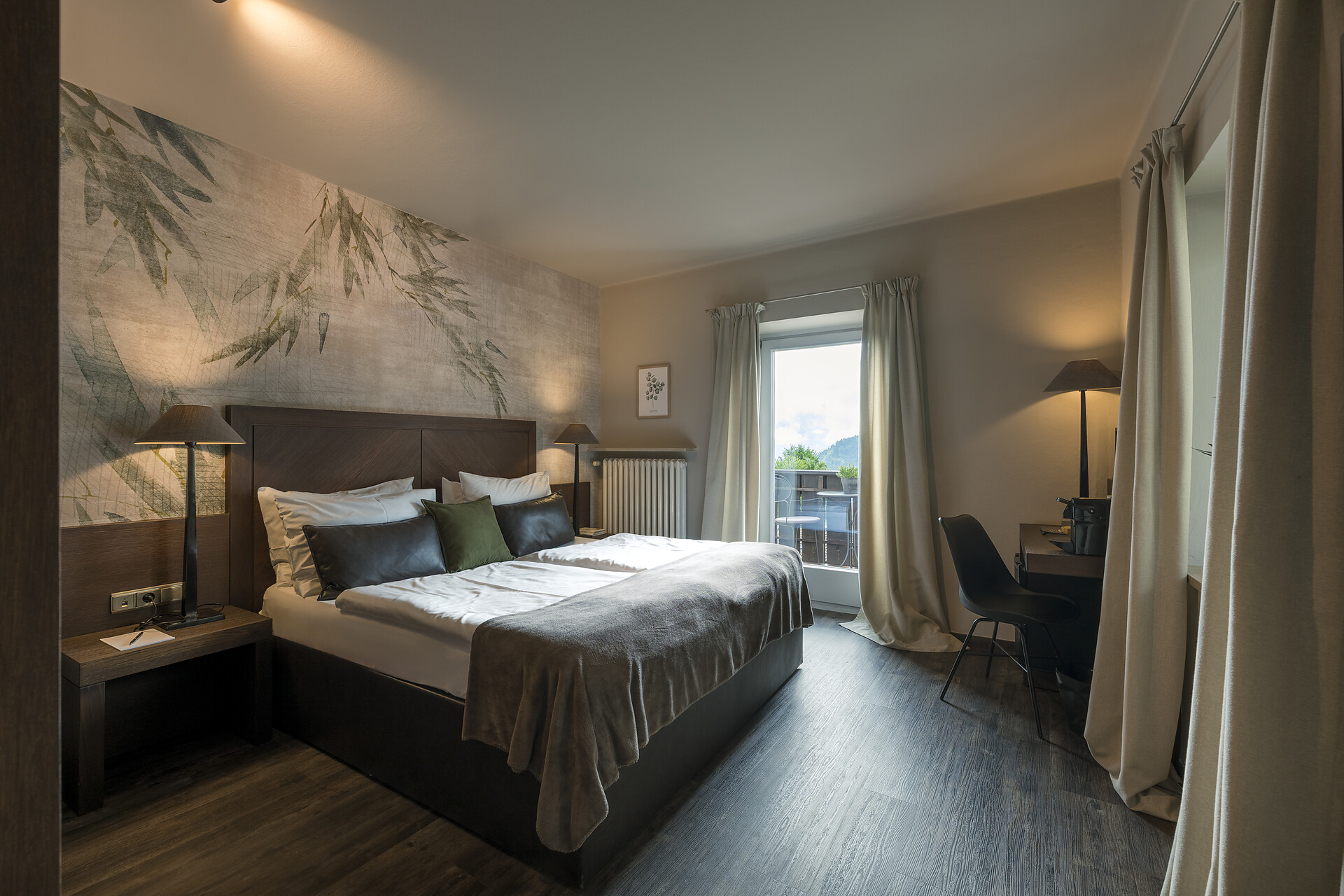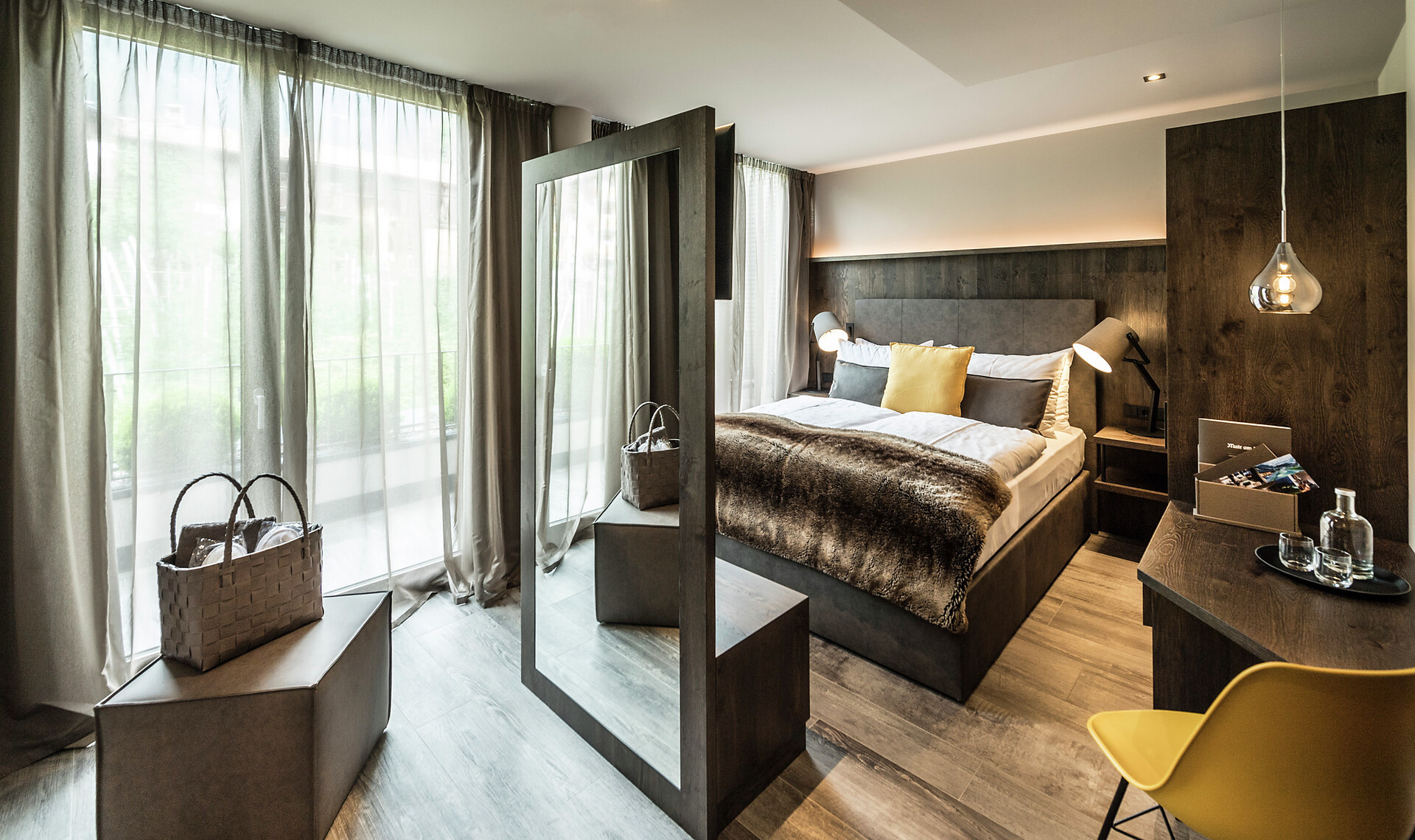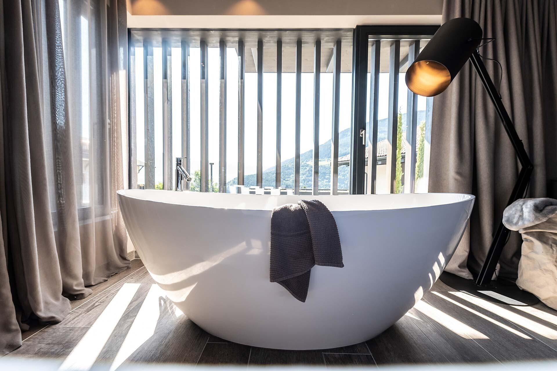 The 45-50 m² rooms with 15 m² panoramic terraces impress not only with a unique panoramic view of Merano and the surrounding mountains; they present themselves in the finest interior with fine materials, light-filled windows, a sitting area, large flat-screen satellite TV, free Wi-Fi, a luxurious bathroom with a large partner shower, separate toilet bidet, hair dryer, makeup mirror, wellness bag with cozy bathrobe and exclusive toiletries, Minibar, Nespresso coffee and air conditioner.