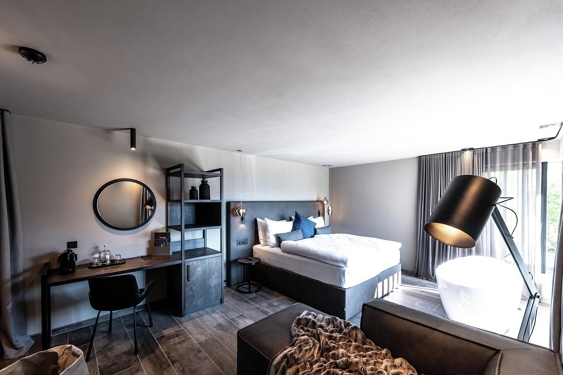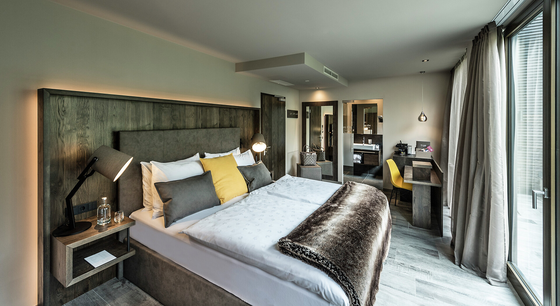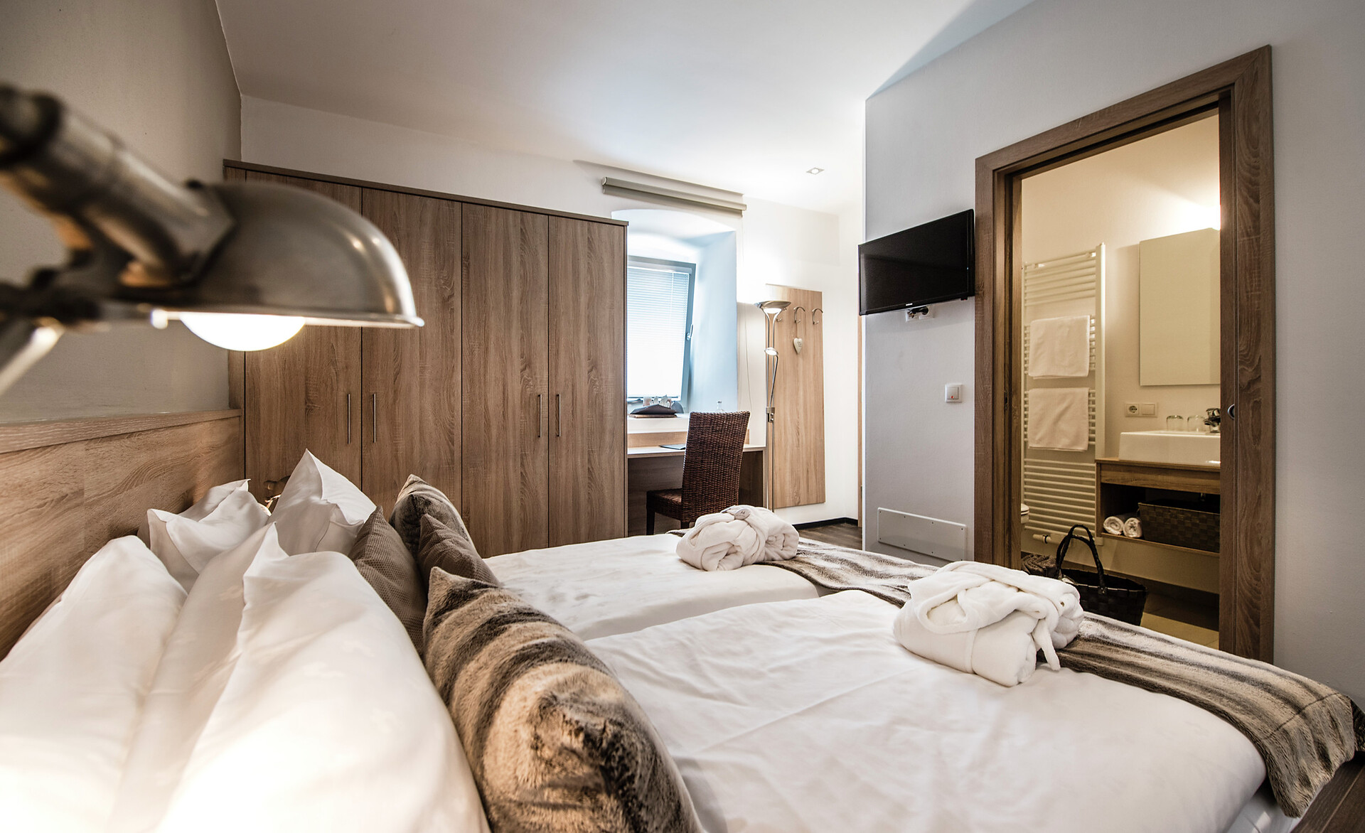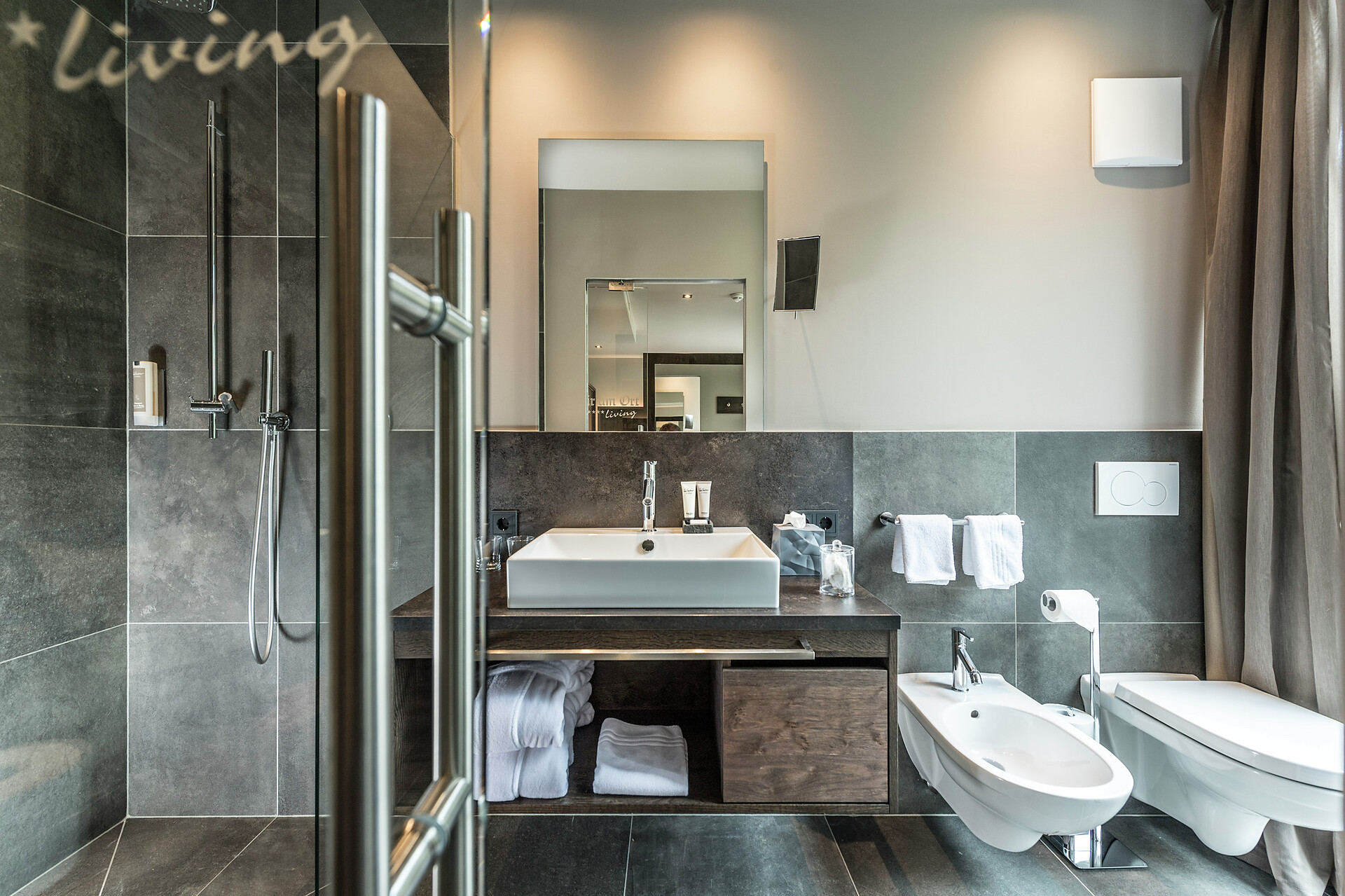 The 45-50 m² rooms with 15 m² panoramic terraces impress not only with a unique panoramic view of Merano and the surrounding mountains; they present themselves in the finest interior with fine materials, light-filled windows, a sitting area, large flat-screen satellite TV, free Wi-Fi, a luxurious bathroom with a large partner shower, separate toilet bidet, hair dryer, makeup mirror, wellness bag with cozy bathrobe and exclusive toiletries, Minibar, Nespresso coffee and air conditioner.
