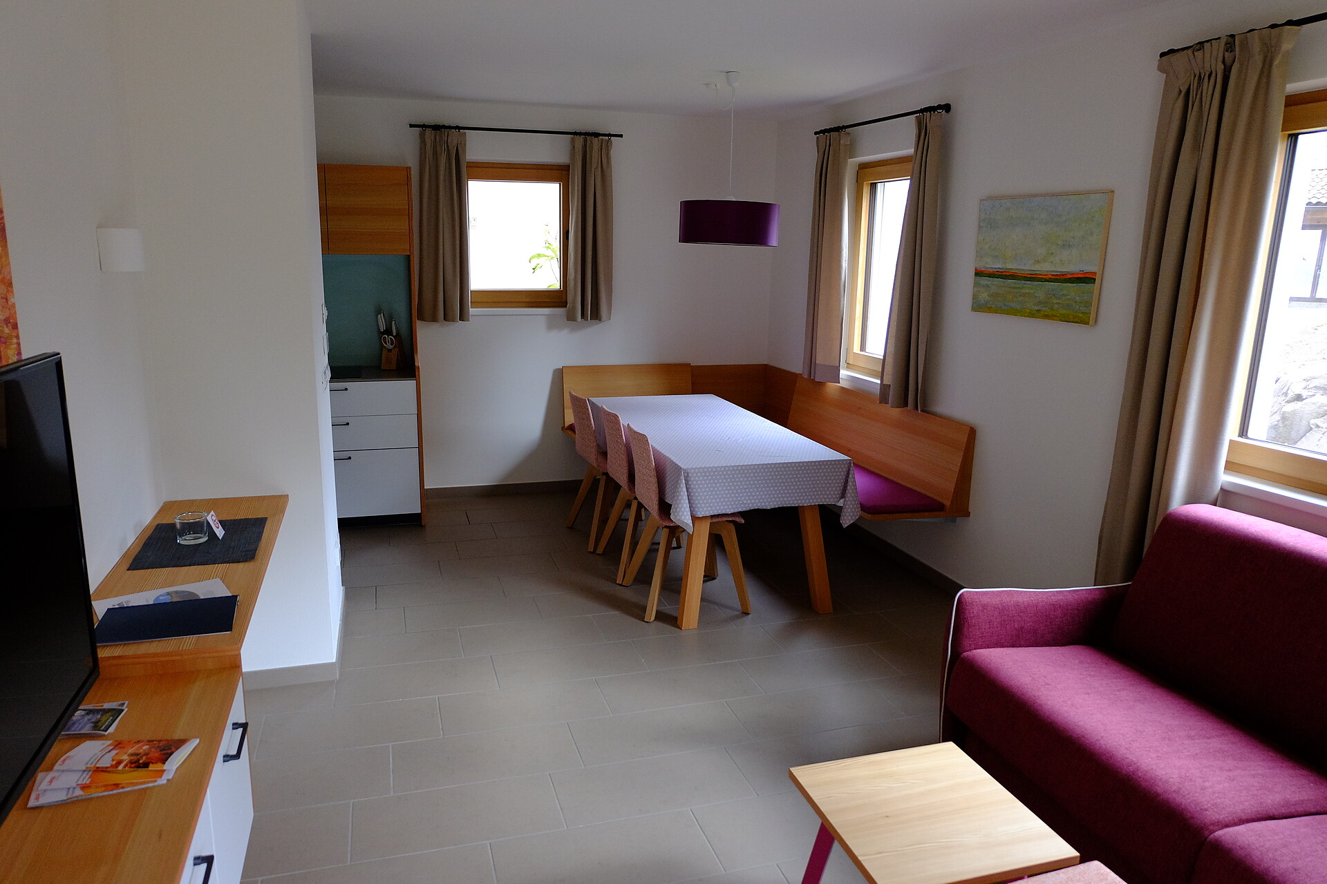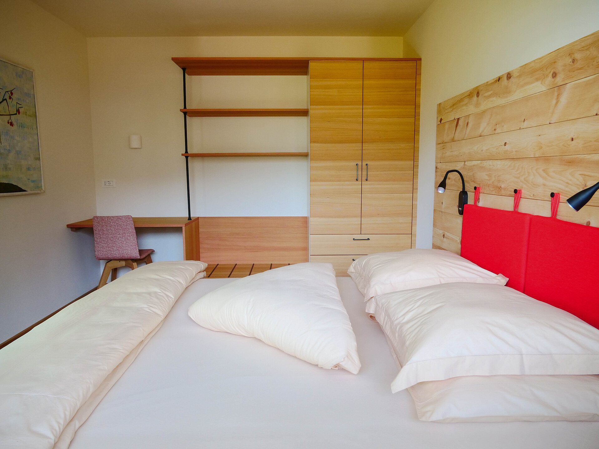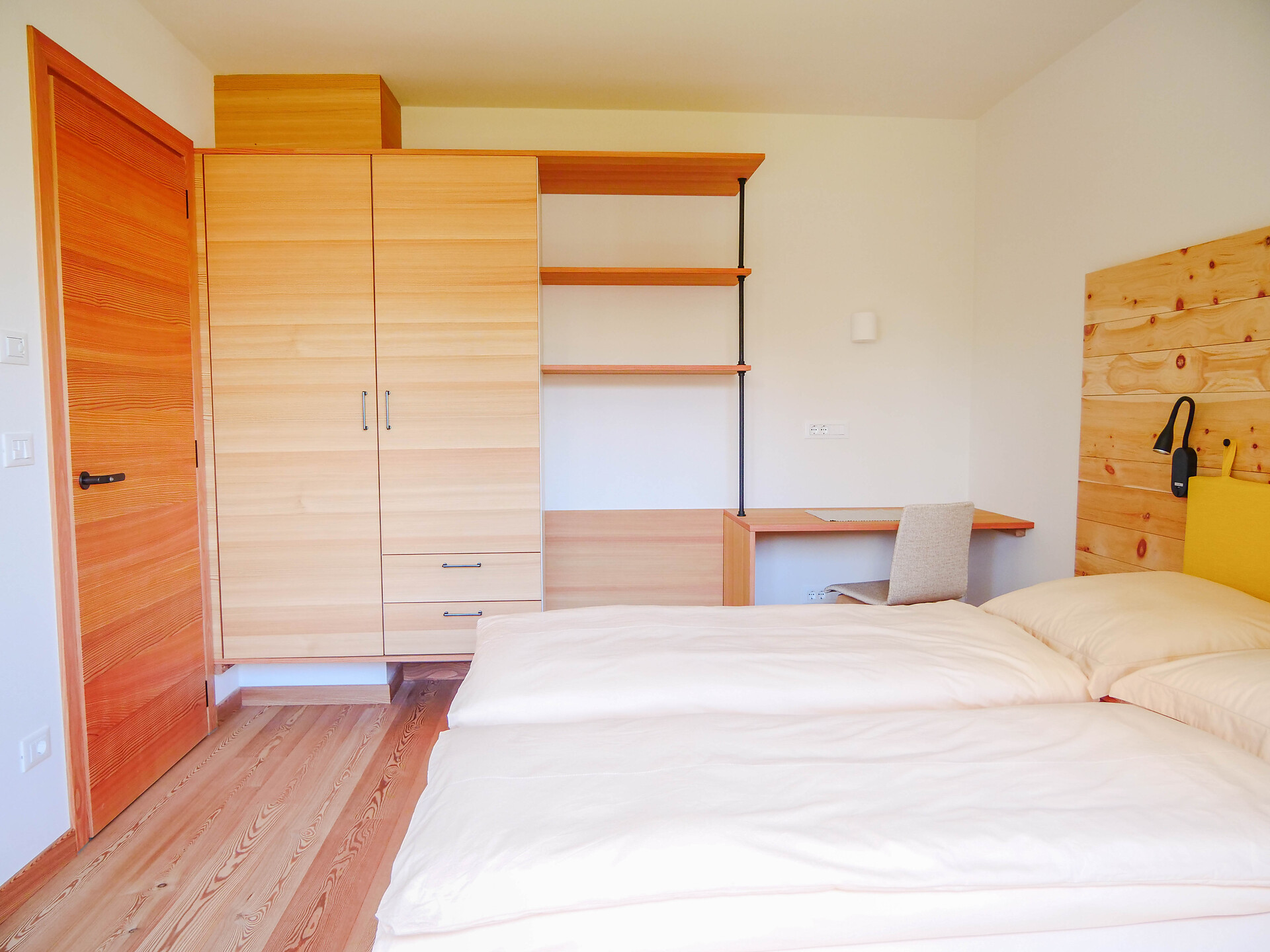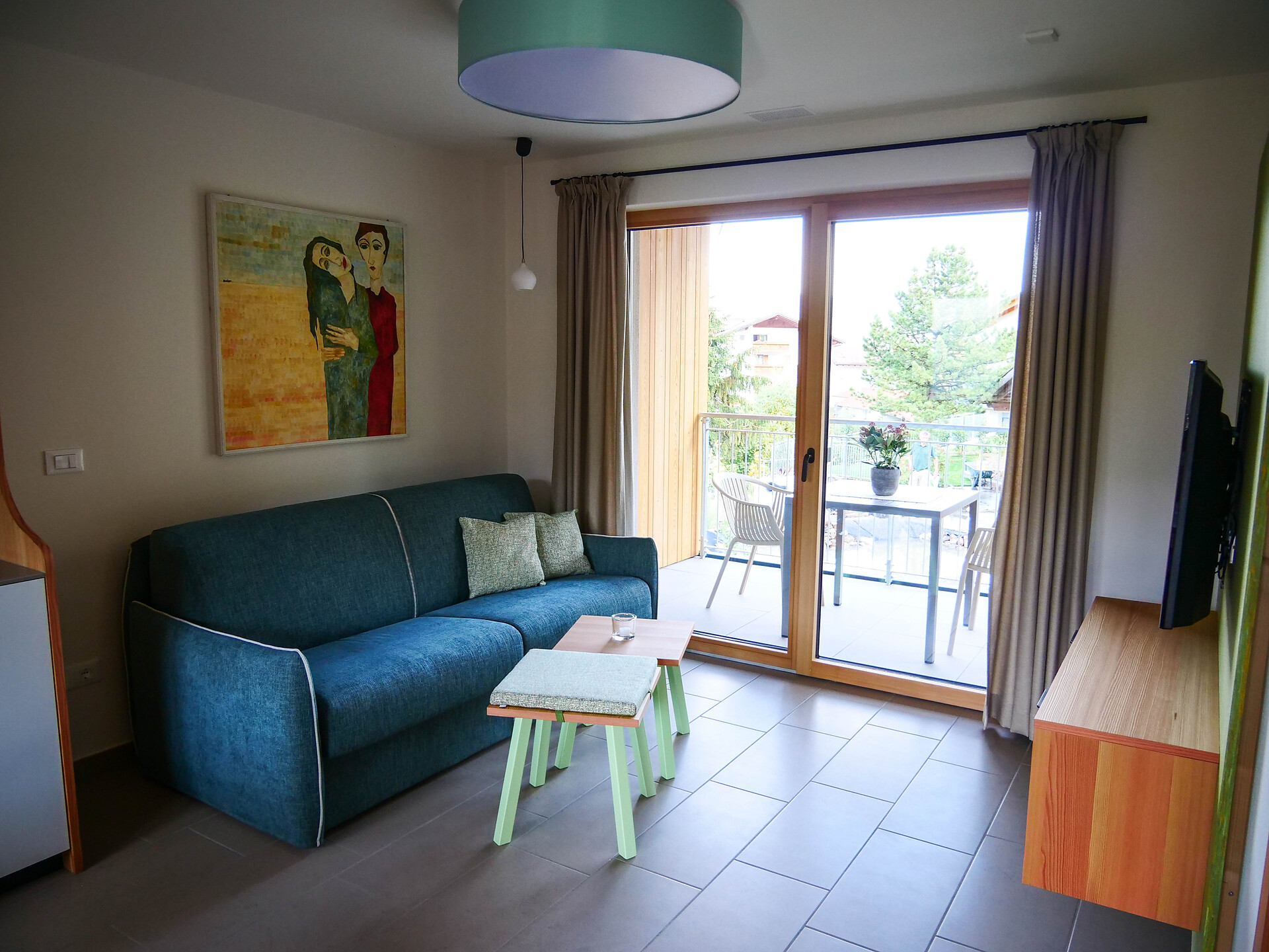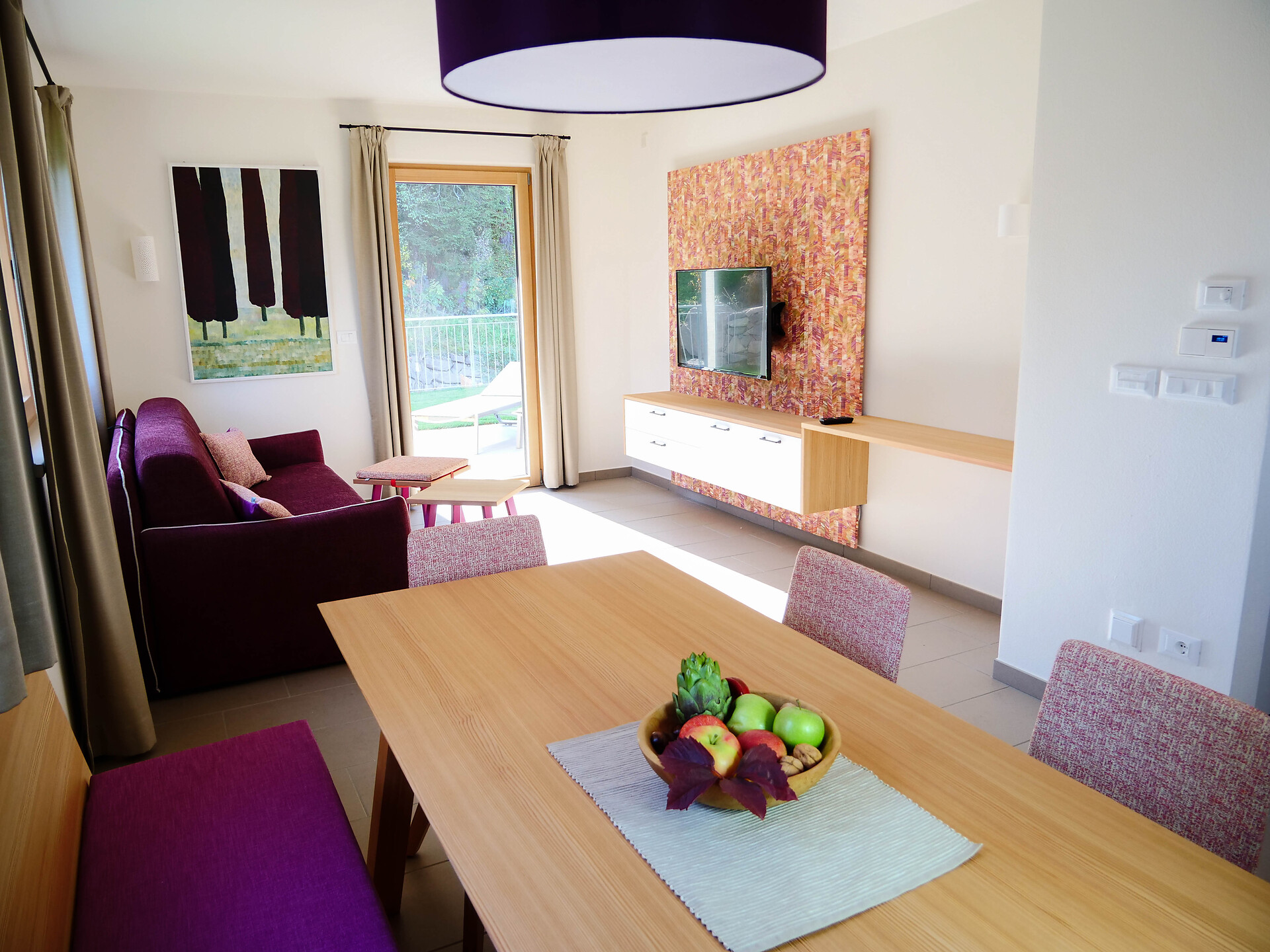 Apartment with approx. 45m2 on the ground floor, east west orientation, terraces on both sides, 1 large living room with (sleep) sofa, kitchen and dining area for 4 persons, fully equipped kitchen, bedroom with double bed and pine back wall, children's room with bunk bed, wardrobe and bathroom with shower, WC, bidet and washbasin, hairdryer and towel warmer. Built-in radio with ceiling speakers and Bluetooth, WLAN, TV 43", living room ventilation, original paintings by German and South Tyrolean artists.