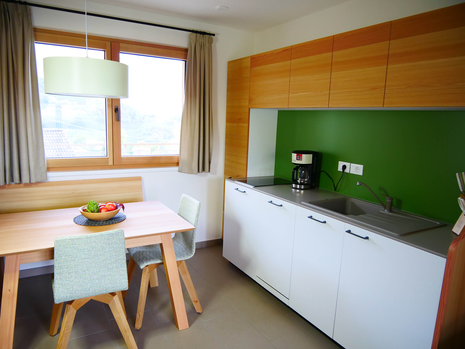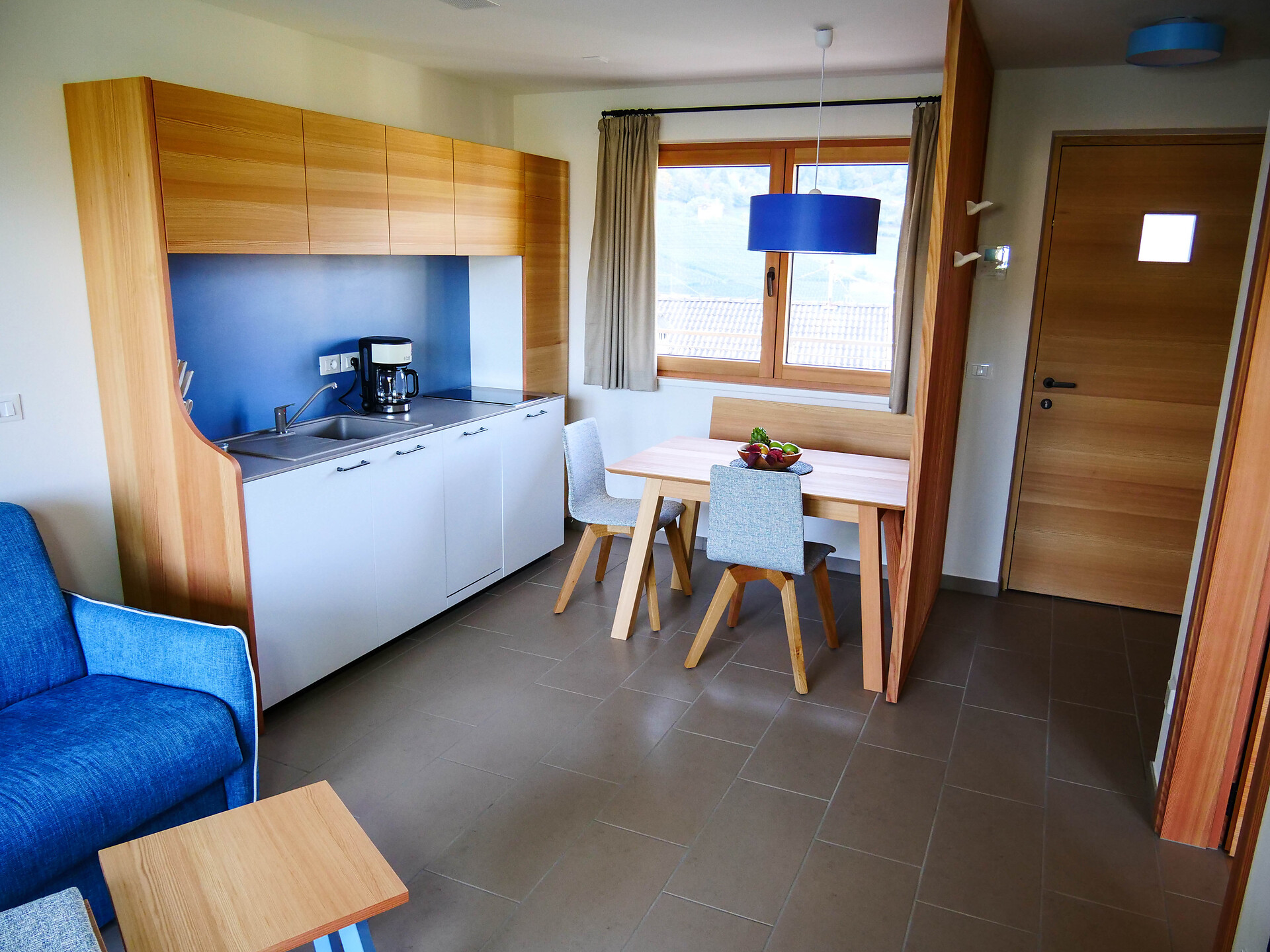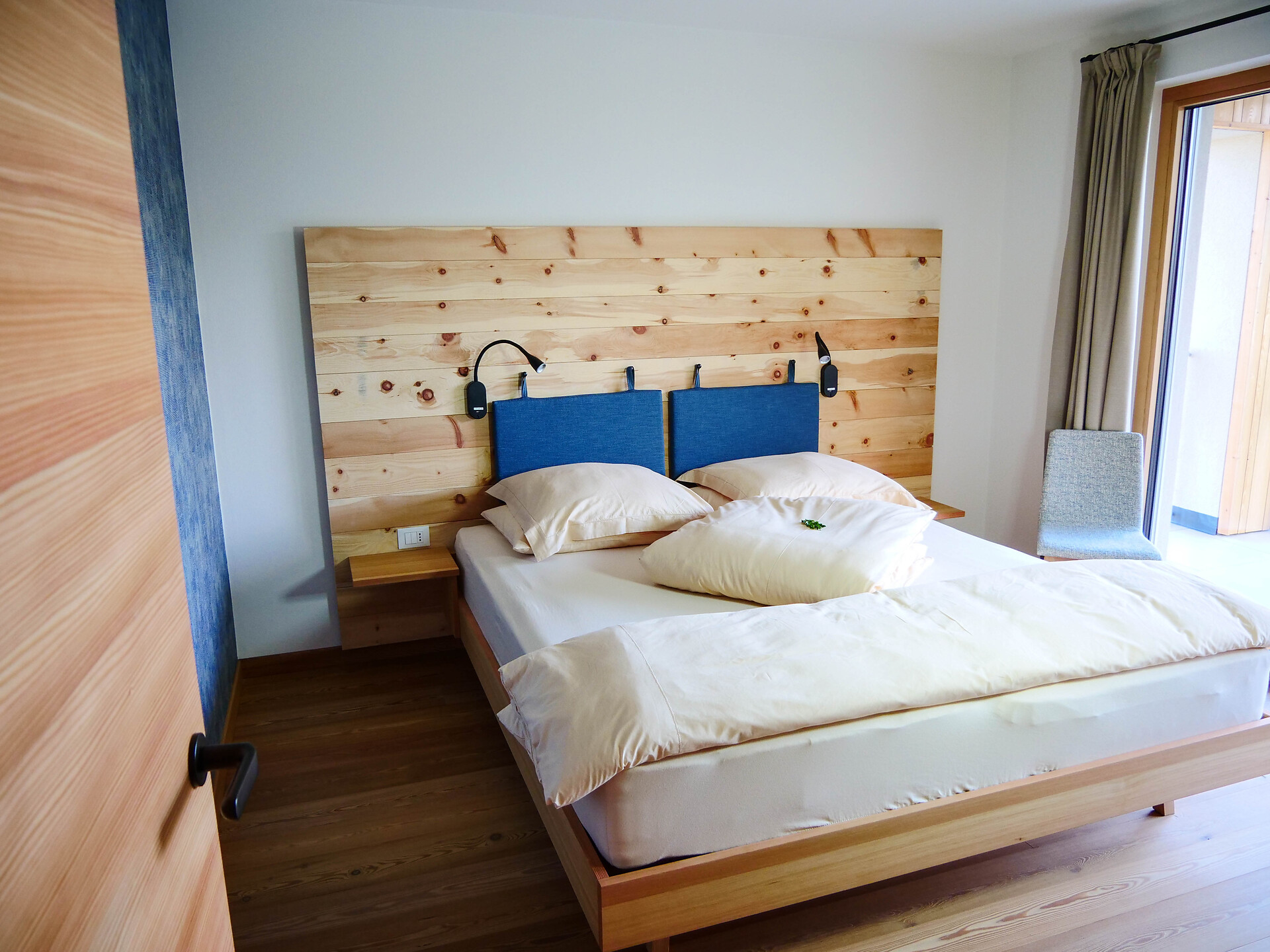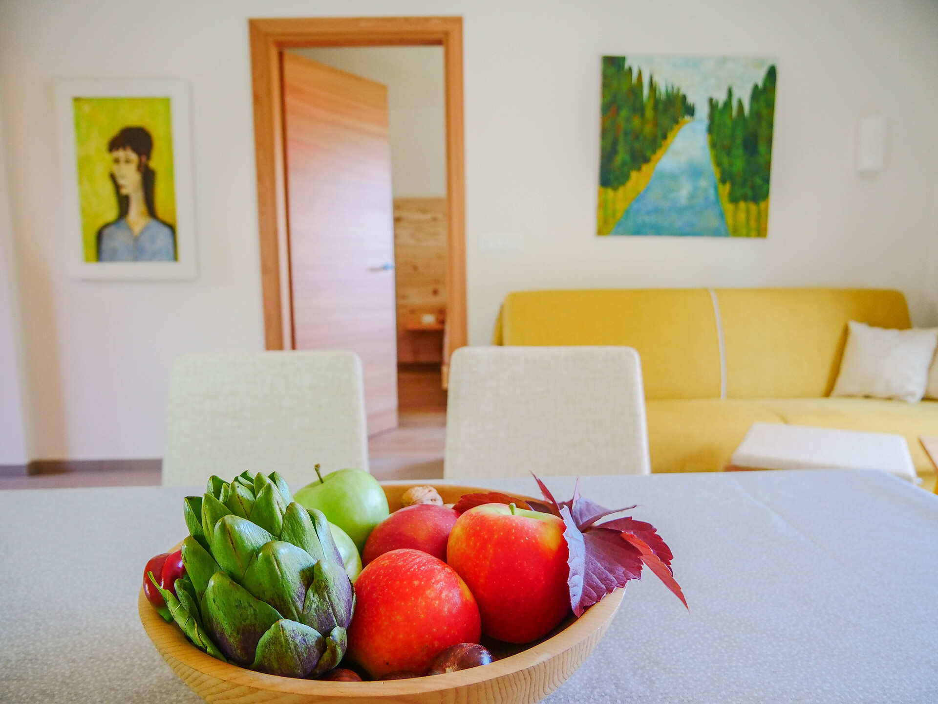 Apartment with approx. 45m2 on the ground floor, east west orientation, terraces on both sides, 1 large living room with (sleep) sofa, kitchen and dining area for 4 persons, fully equipped kitchen, bedroom with double bed and pine back wall, children's room with bunk bed, wardrobe and bathroom with shower, WC, bidet and washbasin, hairdryer and towel warmer. Built-in radio with ceiling speakers and Bluetooth, WLAN, TV 43", living room ventilation, original paintings by German and South Tyrolean artists.