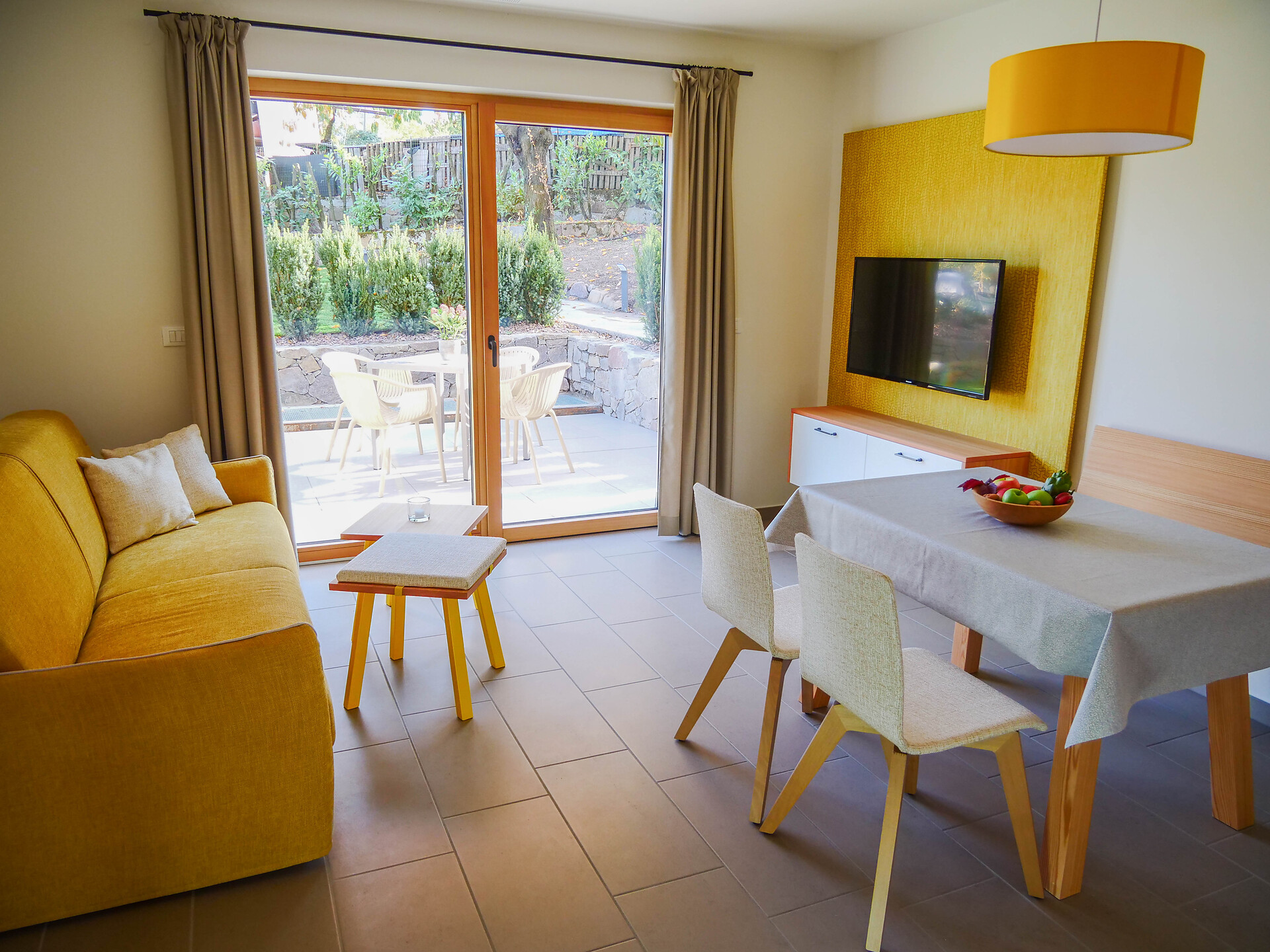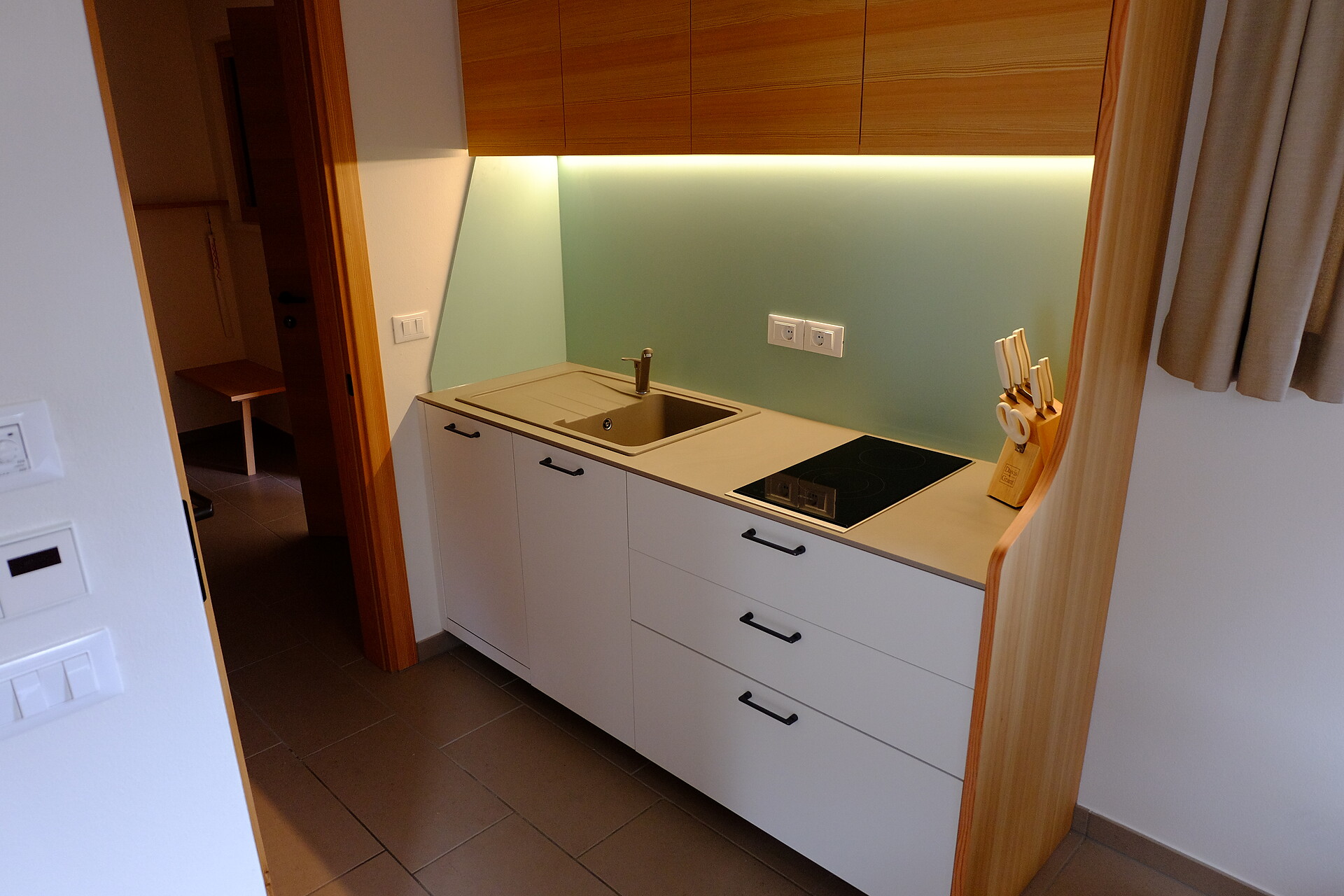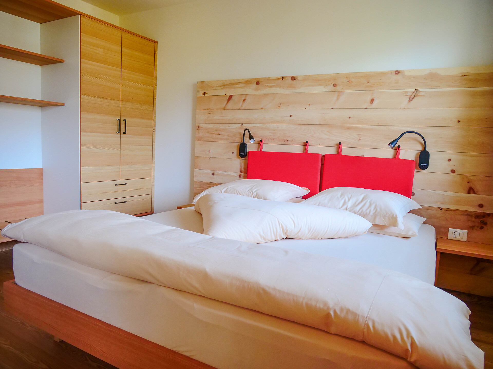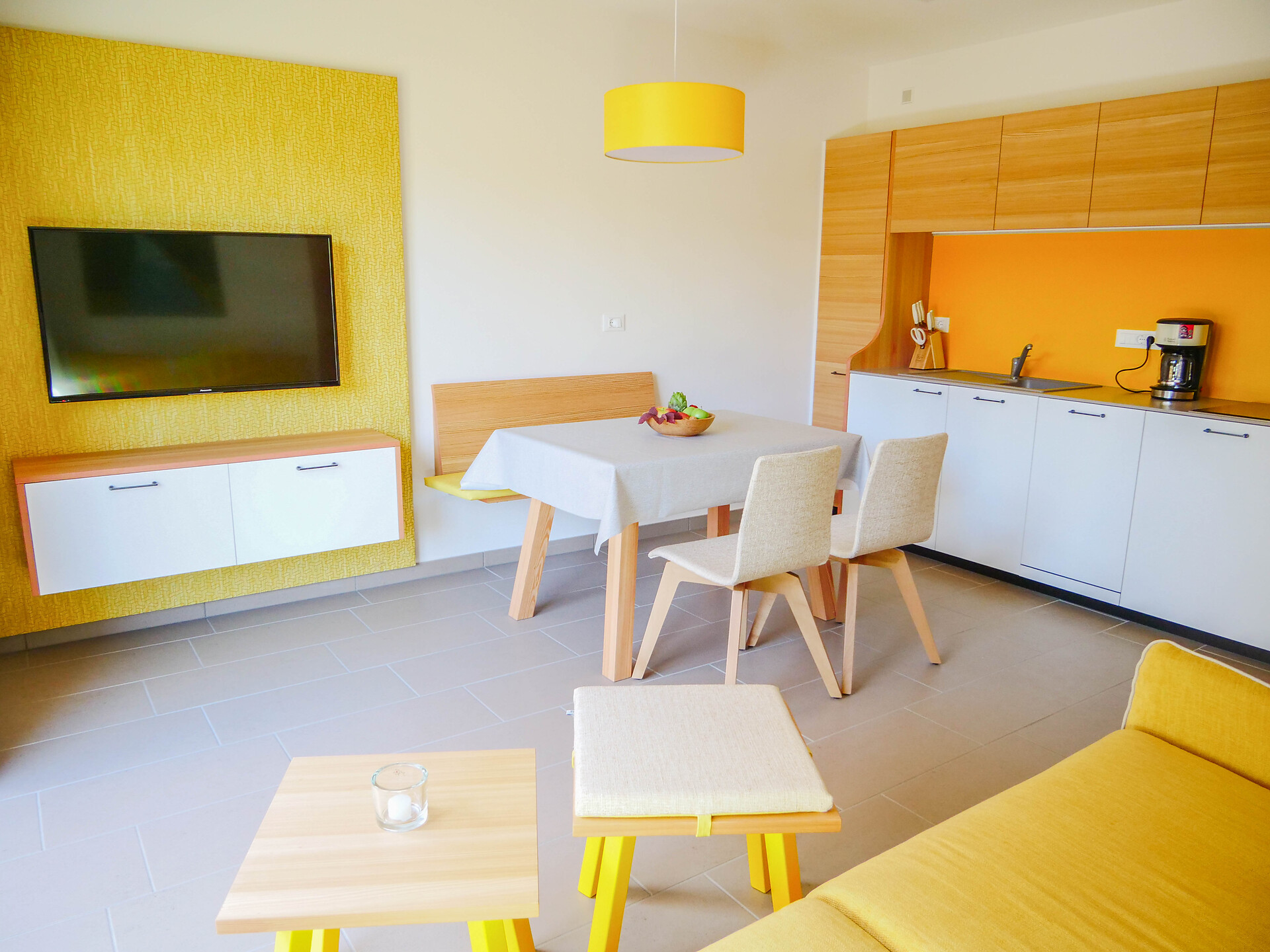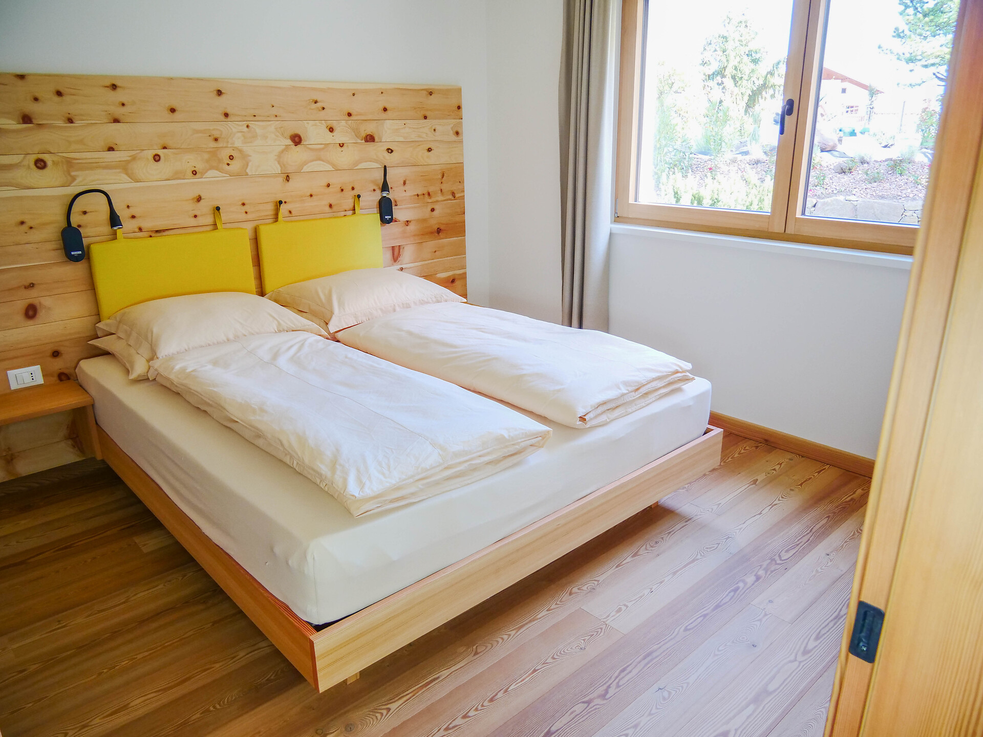 Apartment with approx. 45m2 on the ground floor, east west orientation, terraces on both sides, 1 large living room with (sleep) sofa, kitchen and dining area for 4 persons, fully equipped kitchen, bedroom with double bed and pine back wall, children's room with bunk bed, wardrobe and bathroom with shower, WC, bidet and washbasin, hairdryer and towel warmer. Built-in radio with ceiling speakers and Bluetooth, WLAN, TV 43", living room ventilation, original paintings by German and South Tyrolean artists.