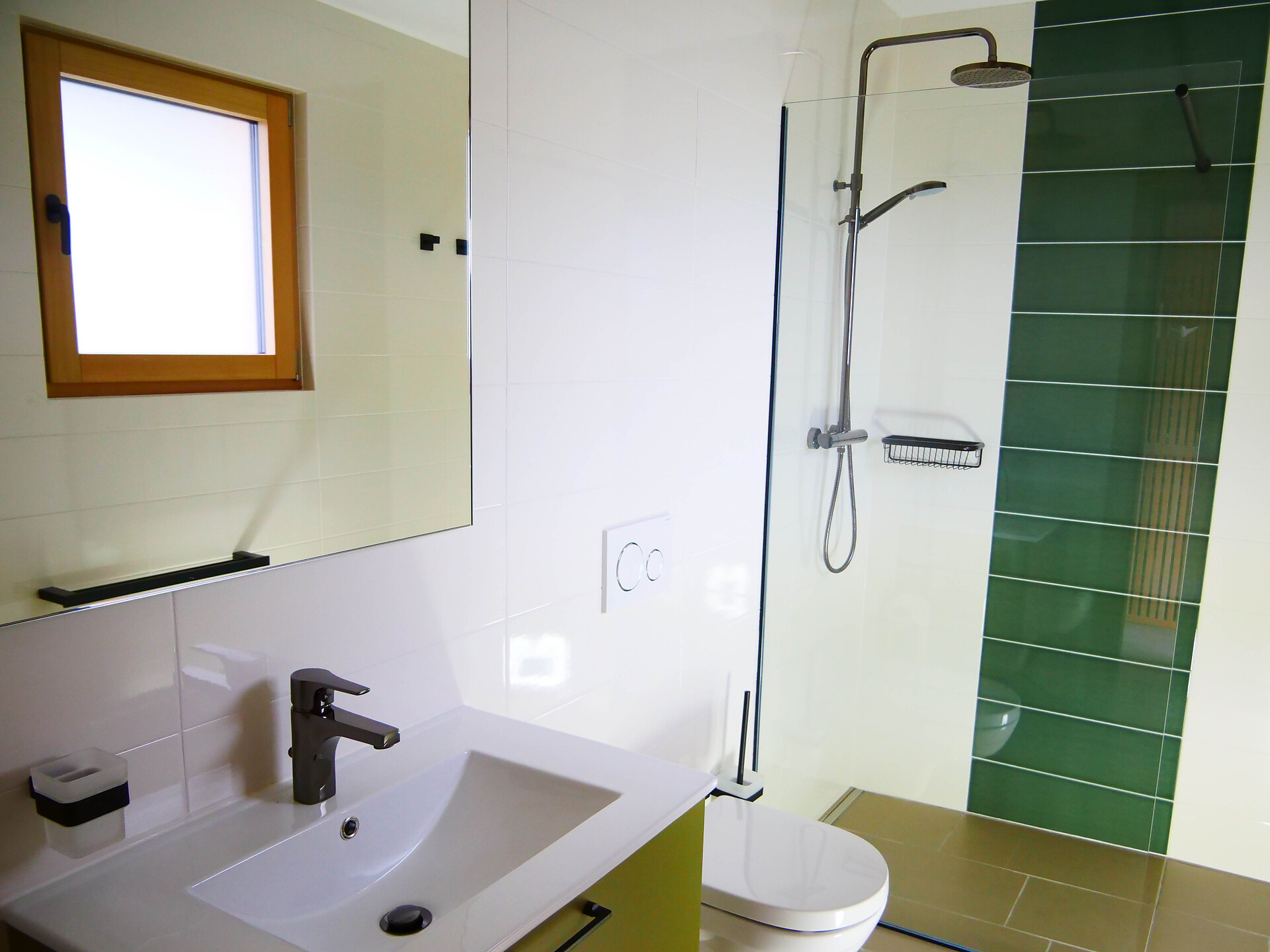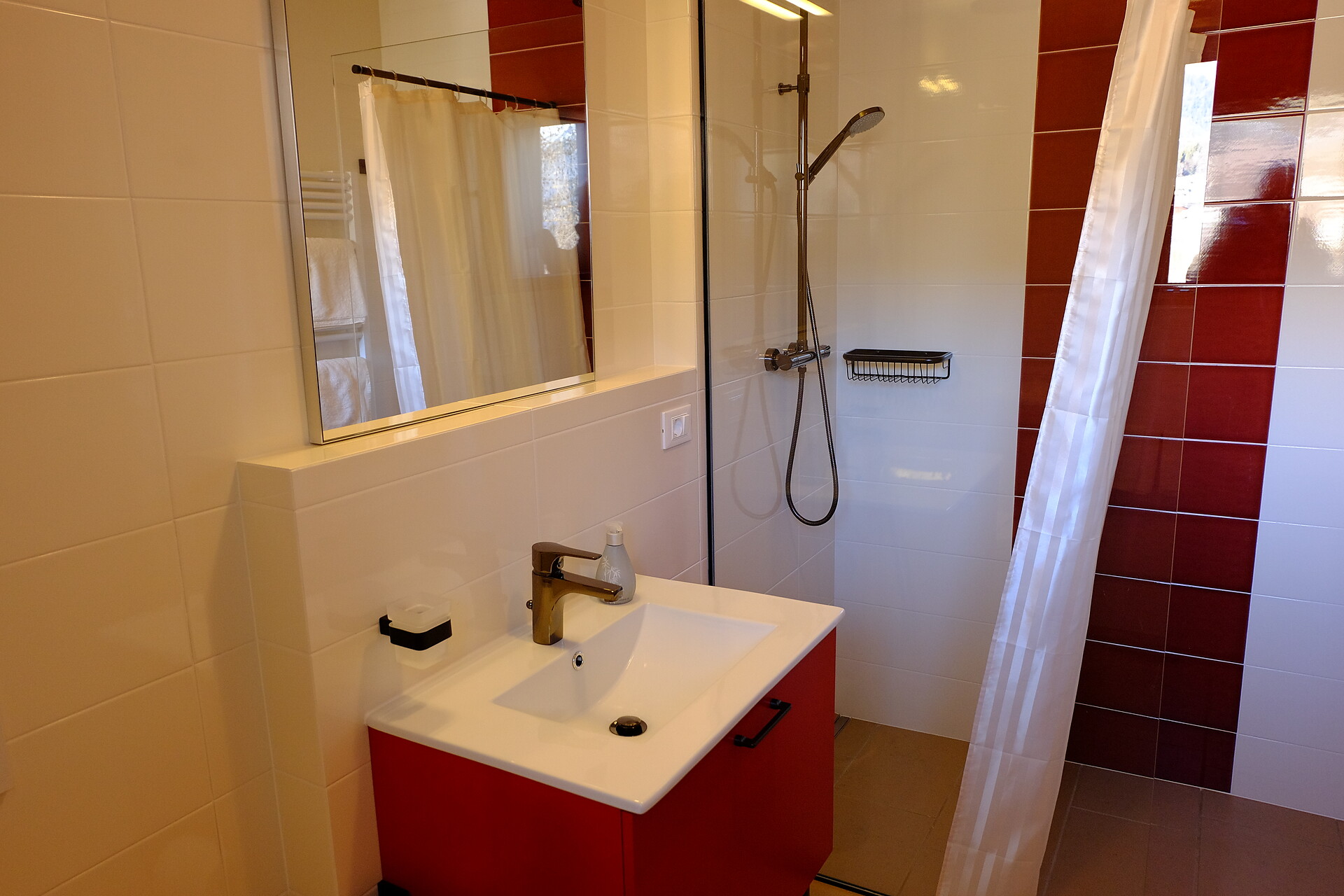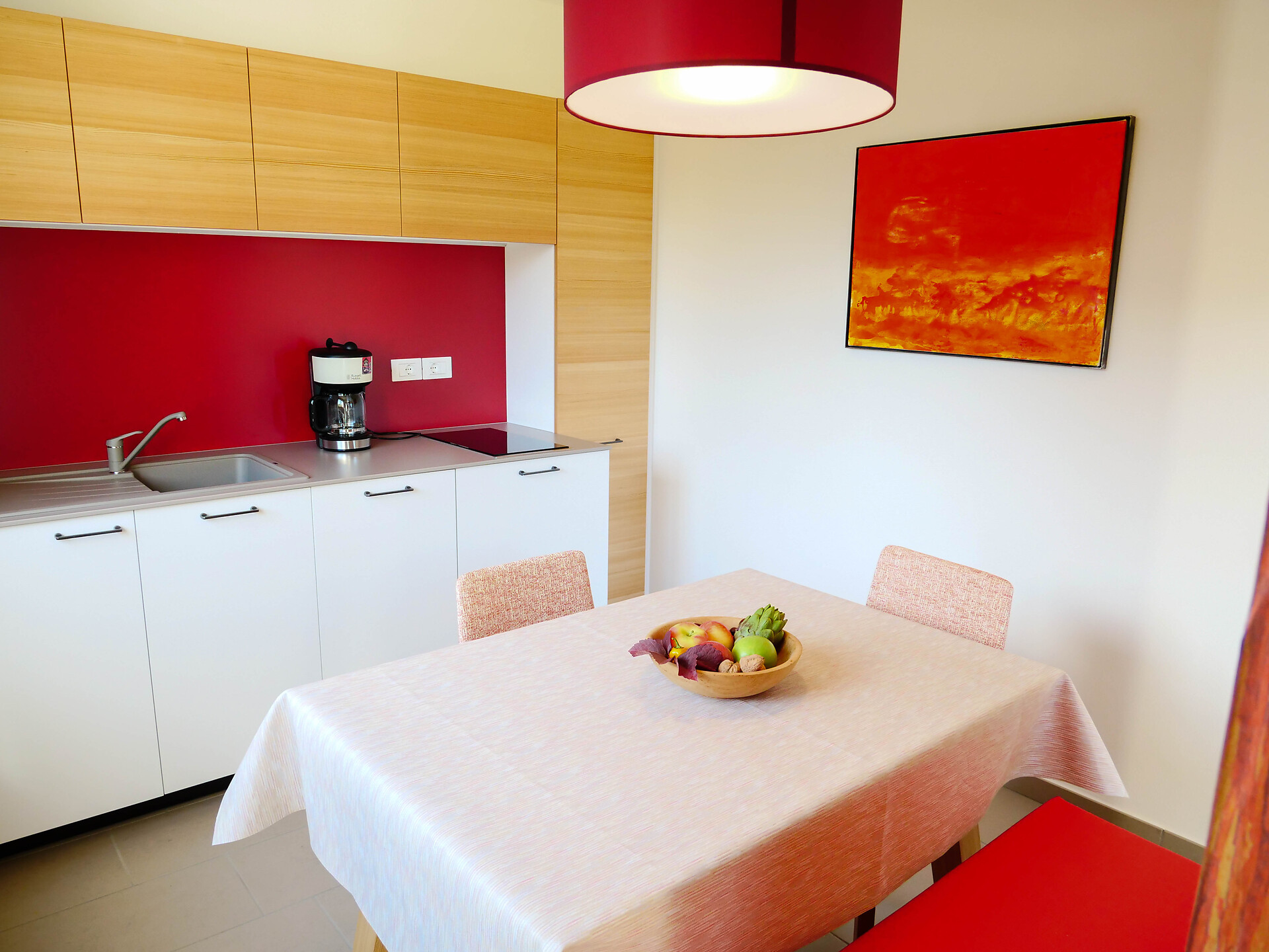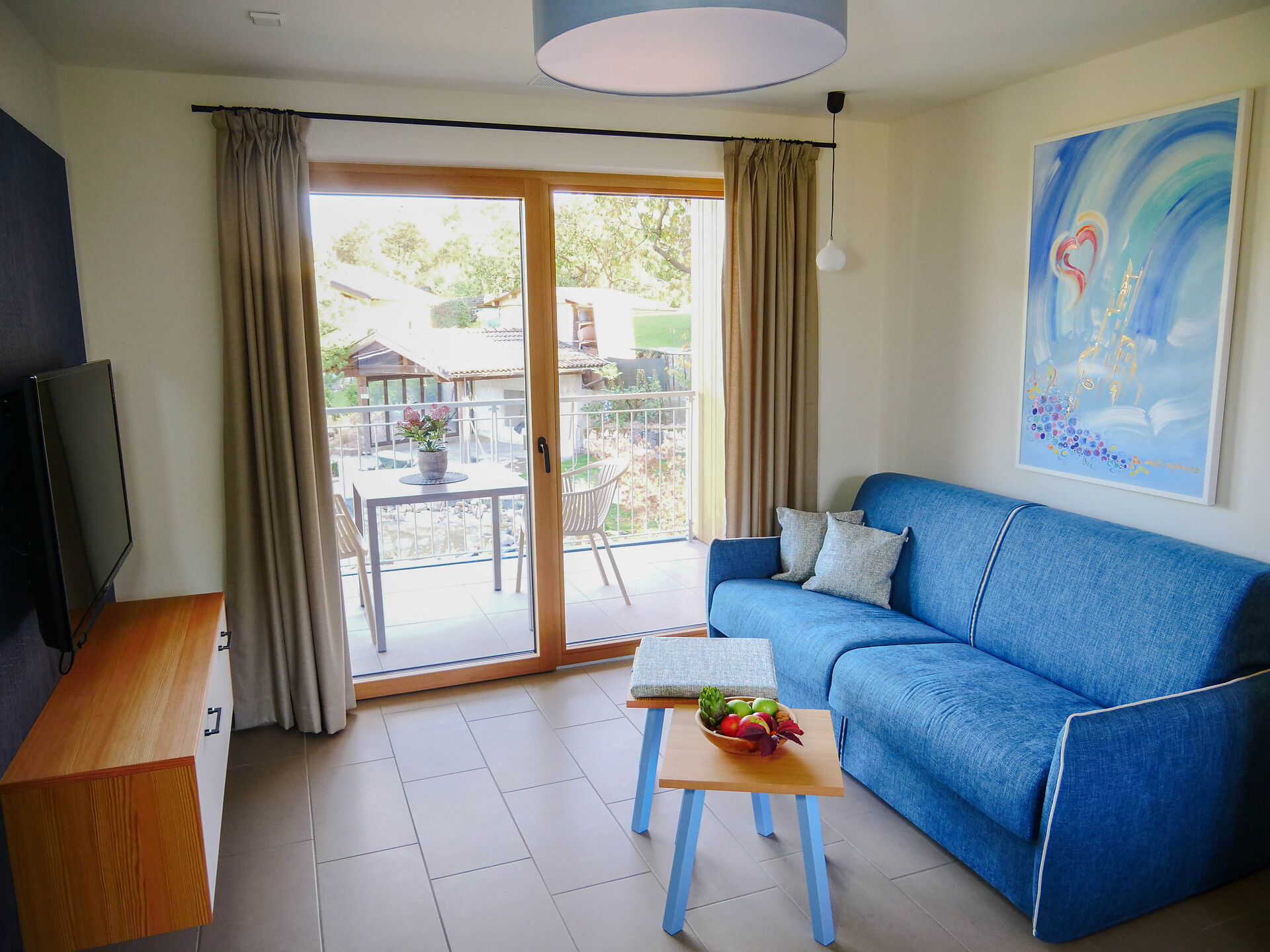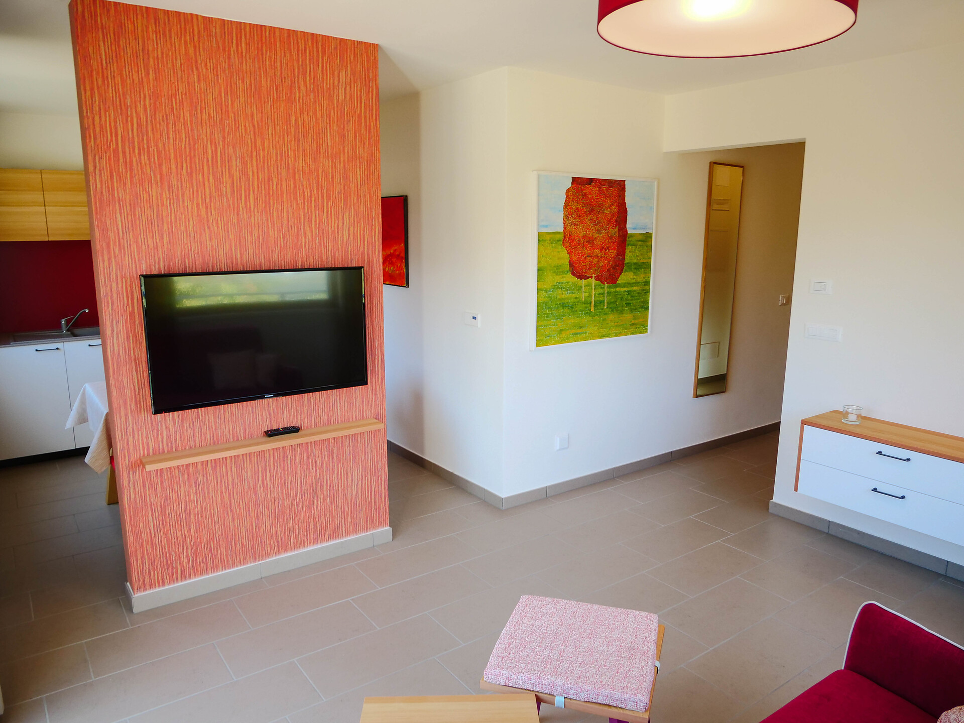 Apartment with approx. 45m2 on the ground floor, east west orientation, terraces on both sides, 1 large living room with (sleep) sofa, kitchen and dining area for 4 persons, fully equipped kitchen, bedroom with double bed and pine back wall, children's room with bunk bed, wardrobe and bathroom with shower, WC, bidet and washbasin, hairdryer and towel warmer. Built-in radio with ceiling speakers and Bluetooth, WLAN, TV 43", living room ventilation, original paintings by German and South Tyrolean artists.