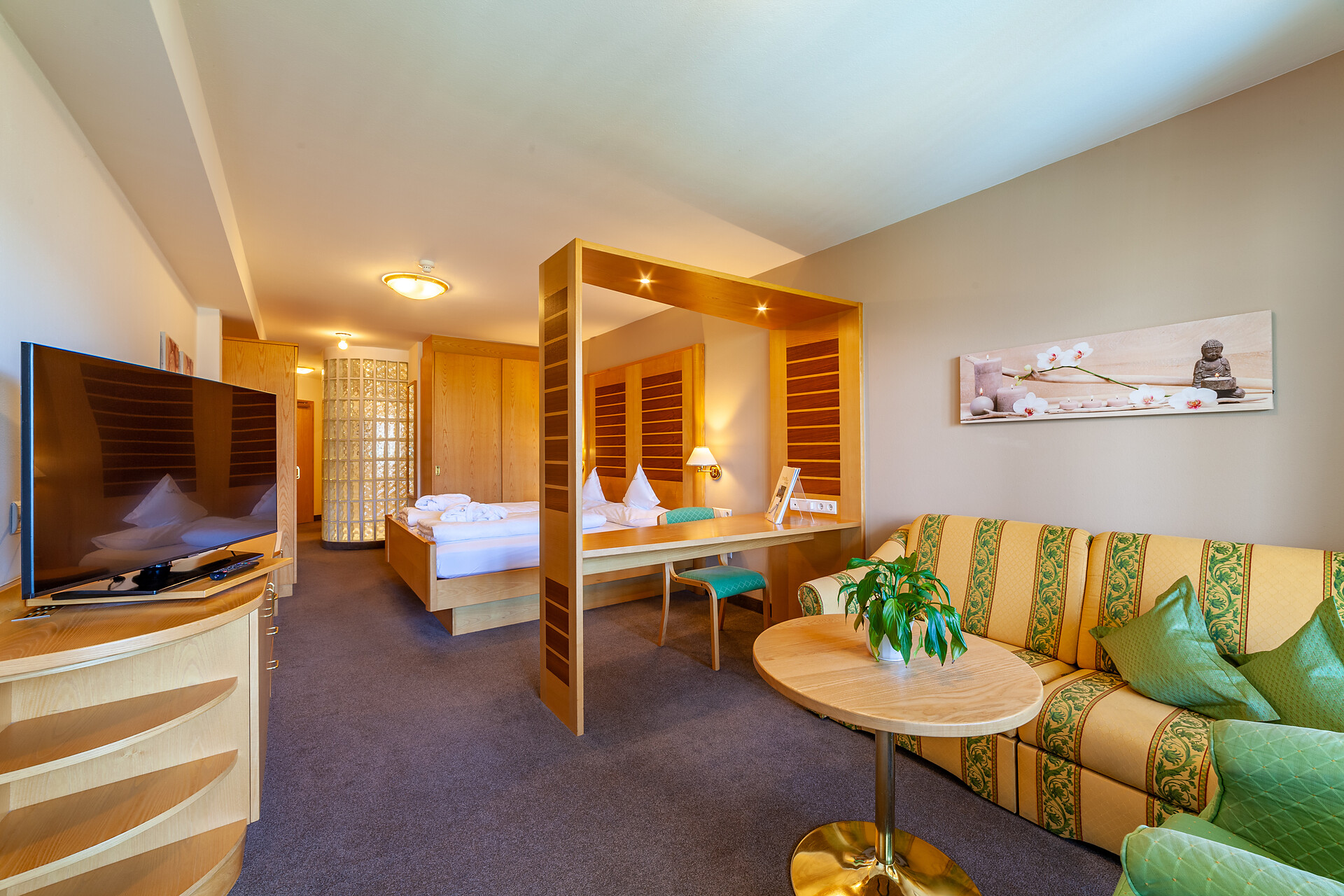 Double room, Double bed , Cot, Sofa bed, Balcony, Mini-bar, Safe, Shower / Bath tub, Separate WC, Hair dryer, Bathrobe, TV, Satellite/Cable, WLAN, Internet access, Main building, Panoramic view, South view