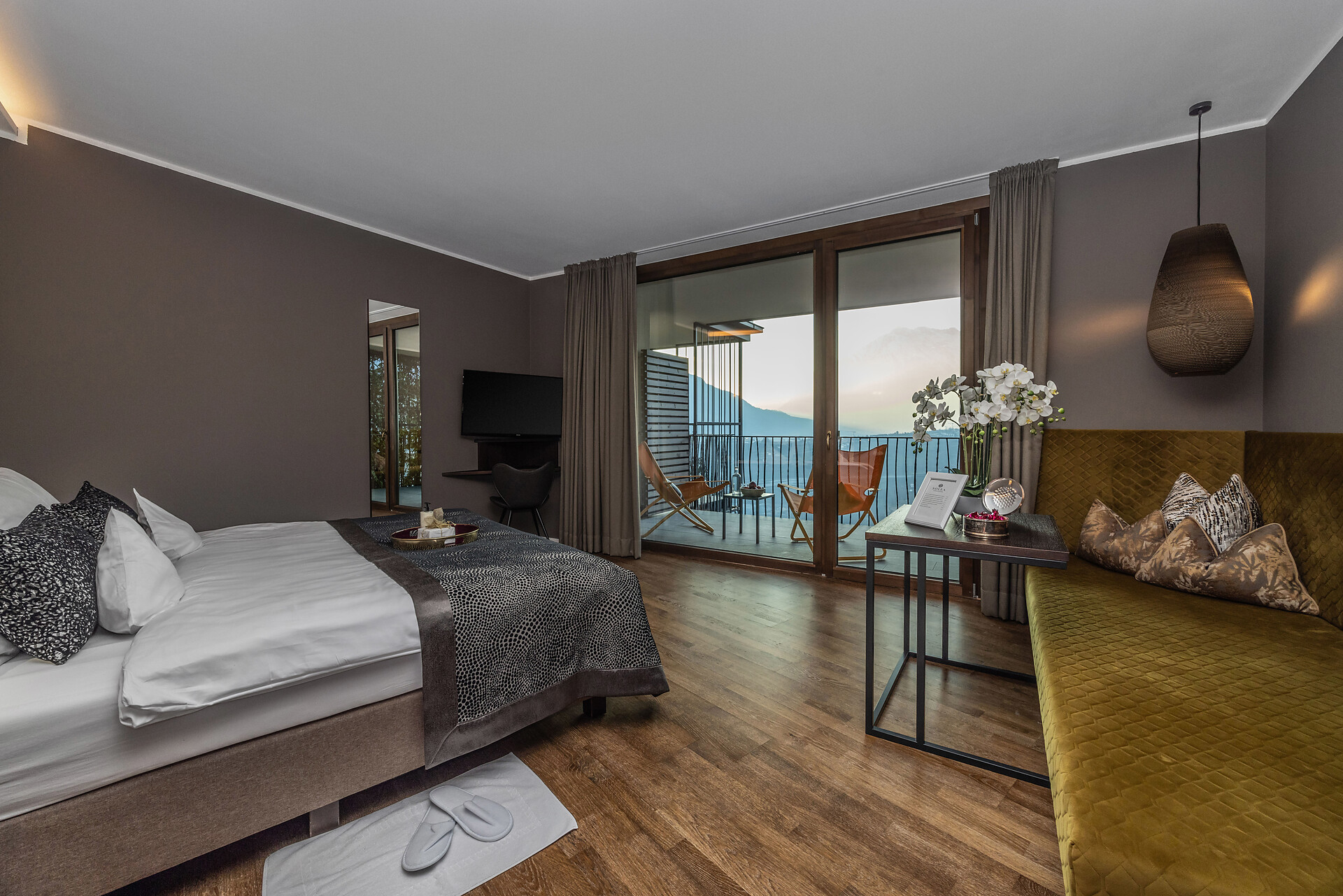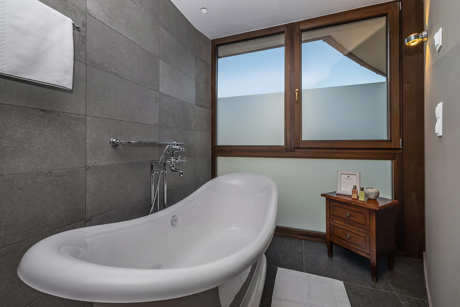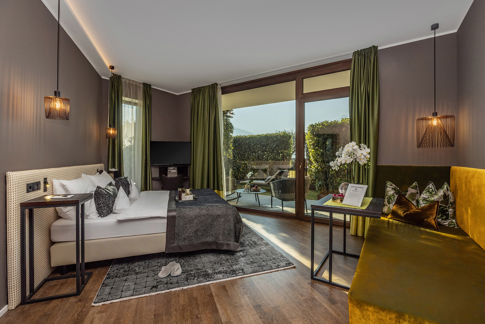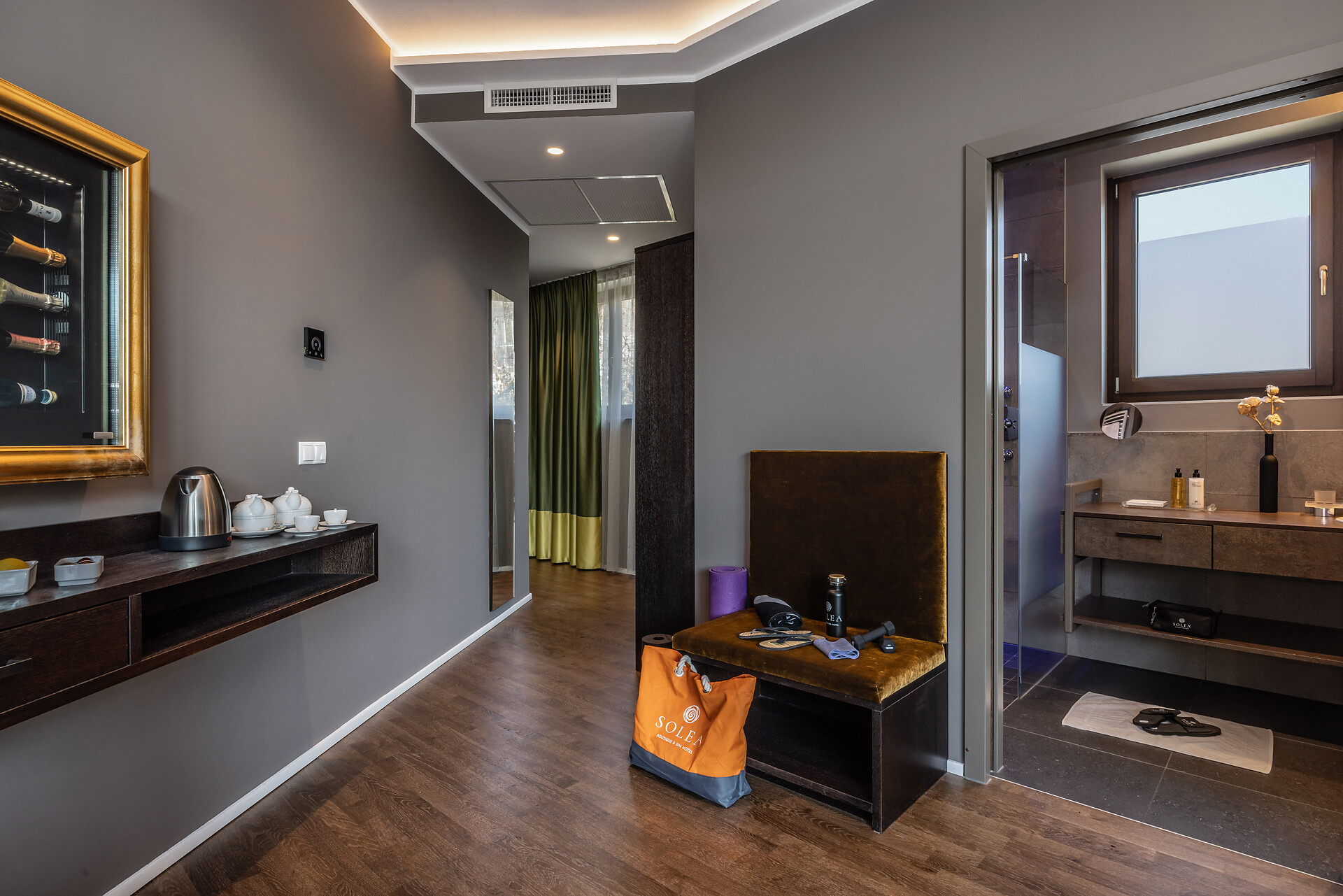 Large family suite with two separate bedrooms, living room with seating area for 4 people, panoramic glazing, large balcony with view to the Mediterranean garden, free-standing bathtub, shower, two washbasins, separate toilet and bidet, natural wooden flooring, air conditioning, 2 flat screen TVs, safe, minibar, and underground parking space.
