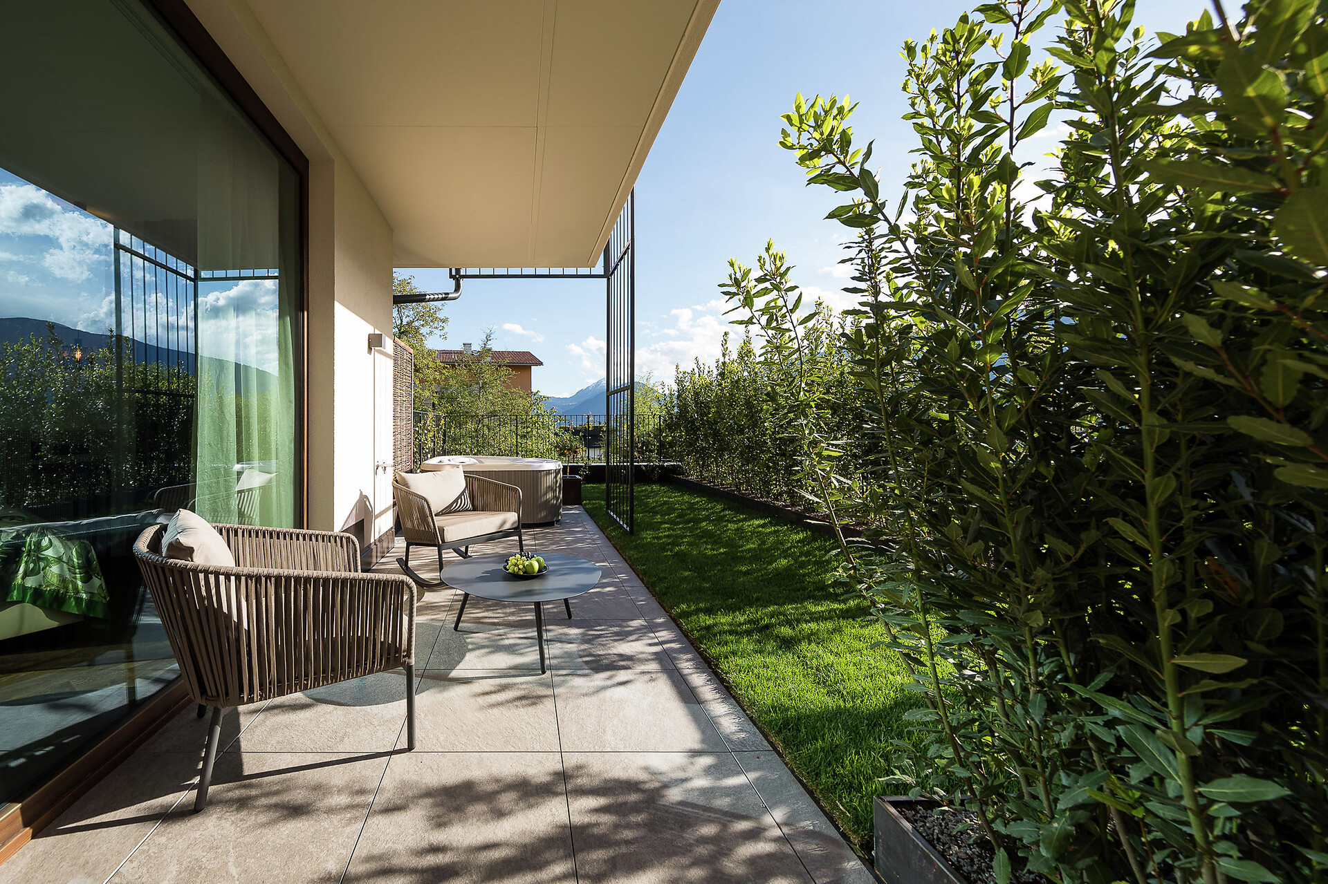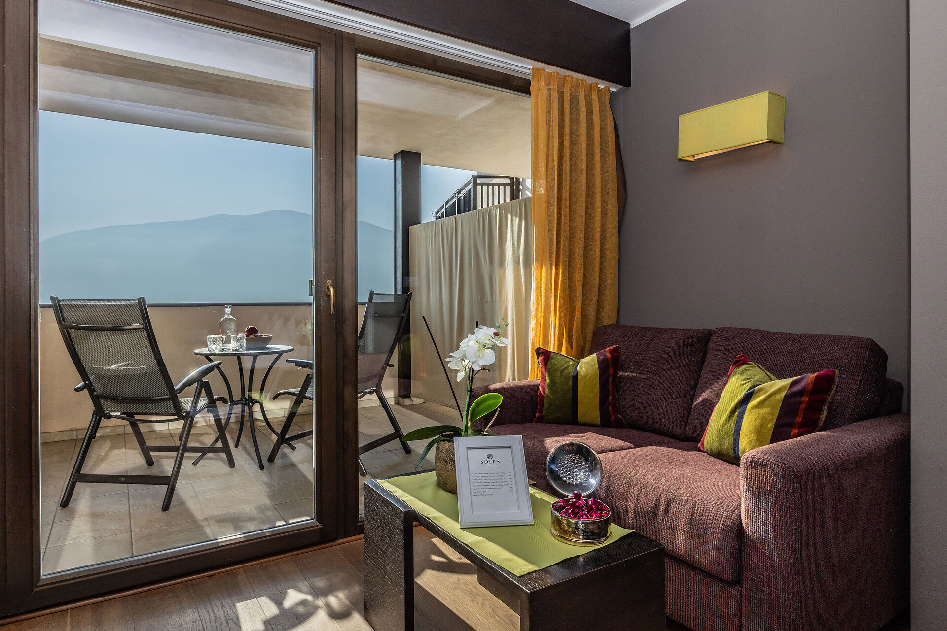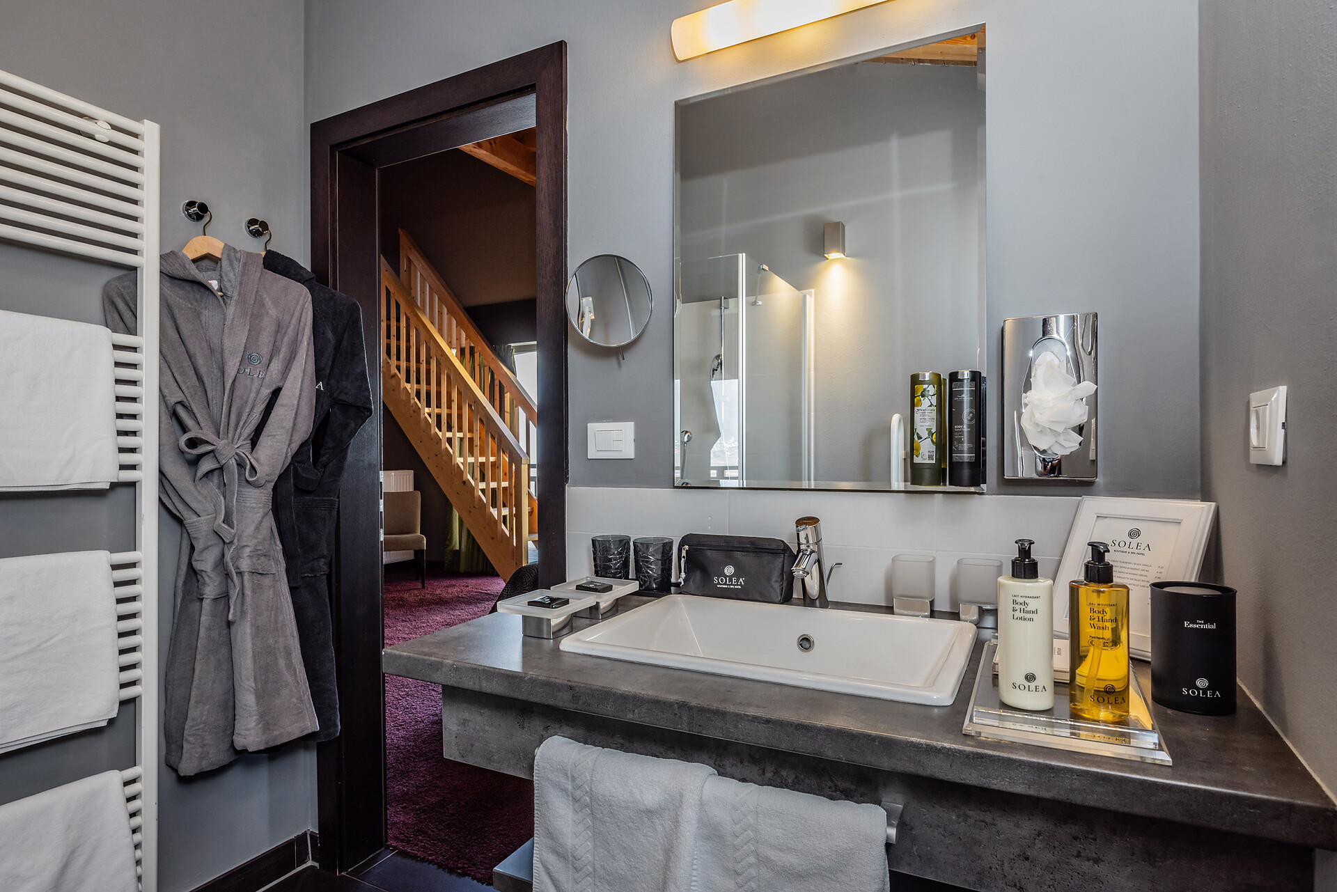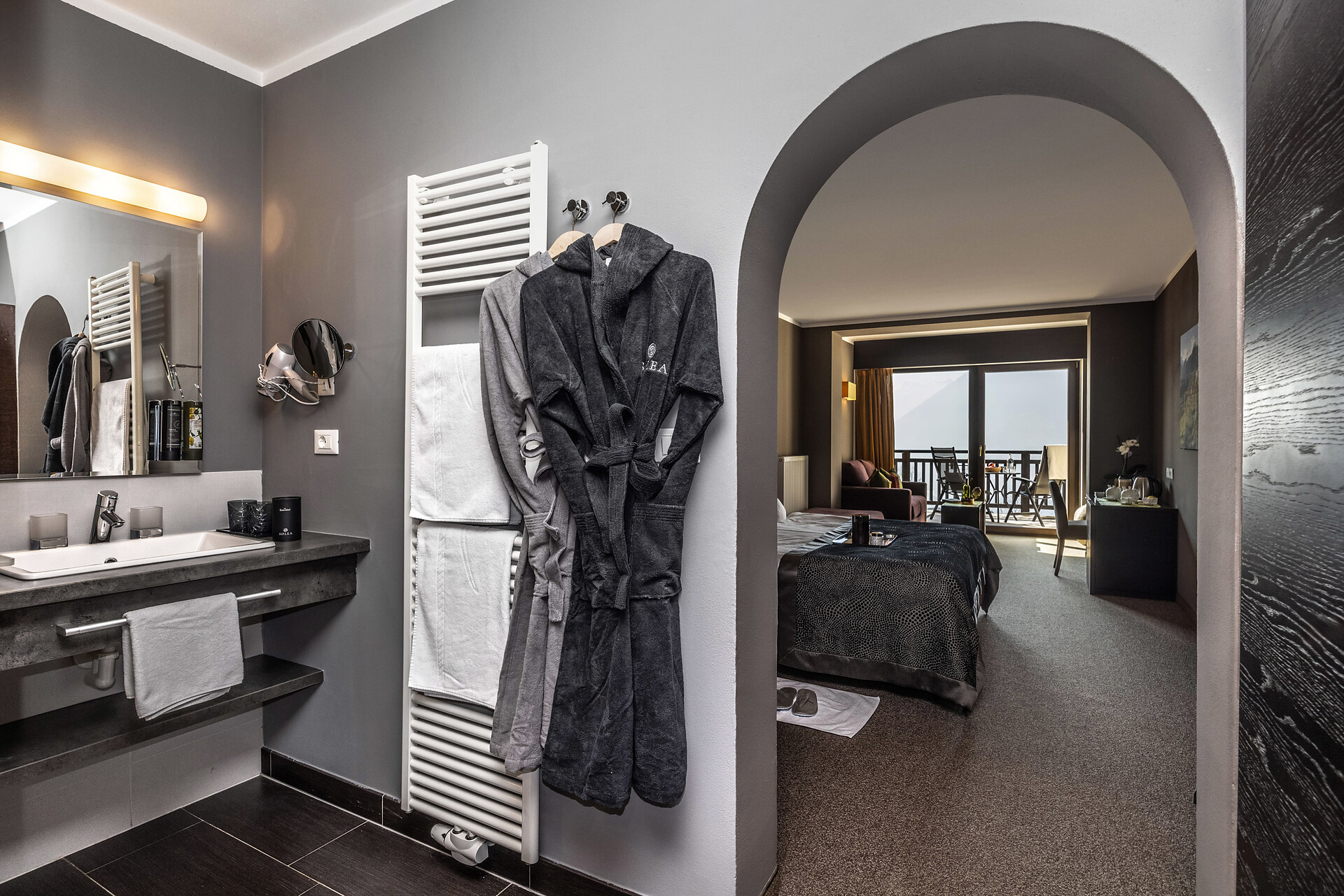 Large family suite with two separate bedrooms, living room with seating area for 4 people, panoramic glazing, large balcony with view to the Mediterranean garden, free-standing bathtub, shower, two washbasins, separate toilet and bidet, natural wooden flooring, air conditioning, 2 flat screen TVs, safe, minibar, and underground parking space.