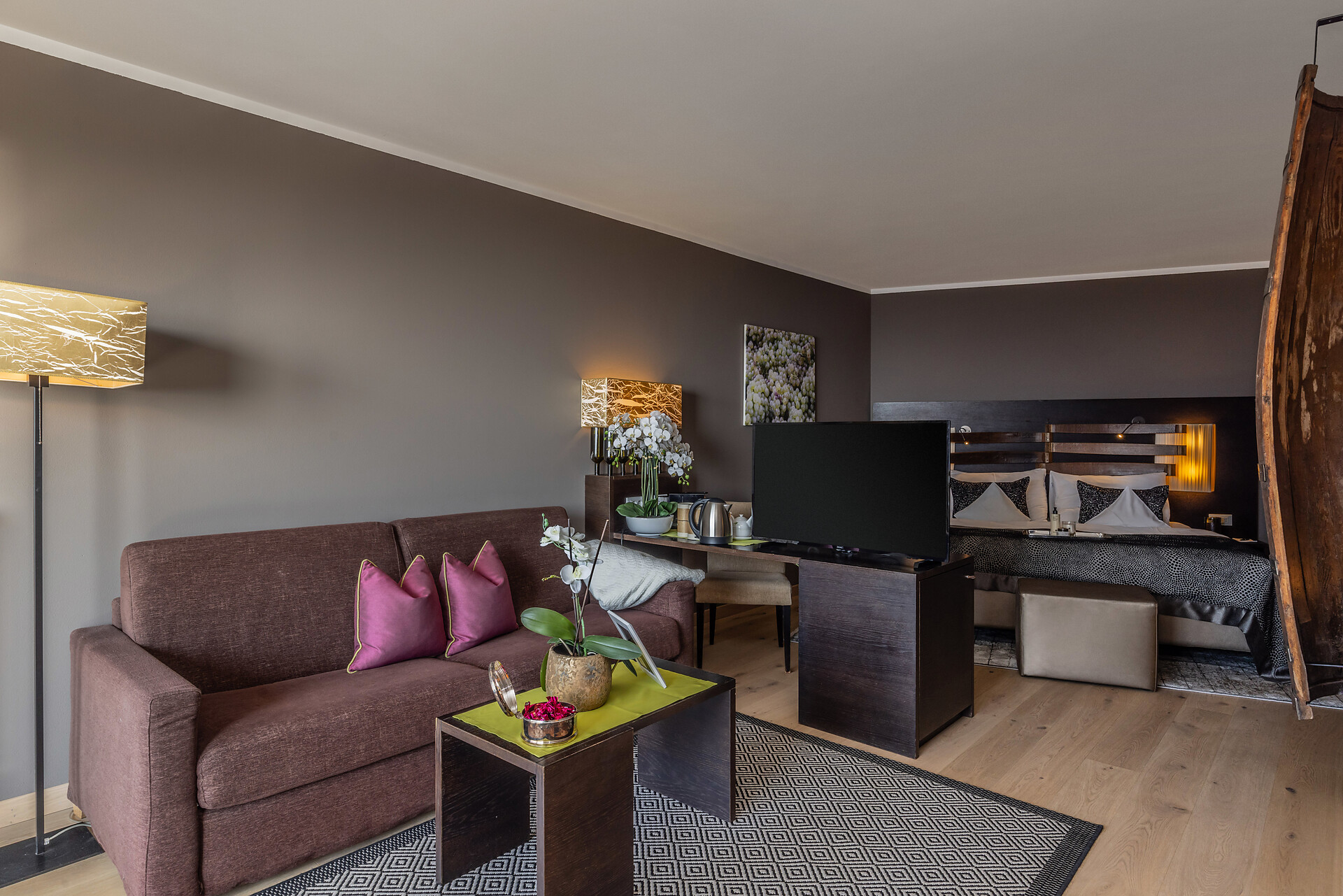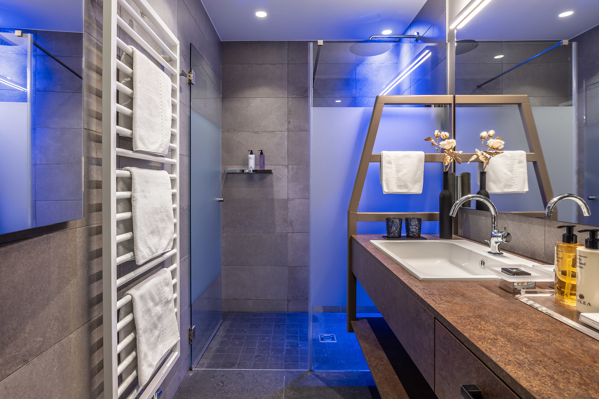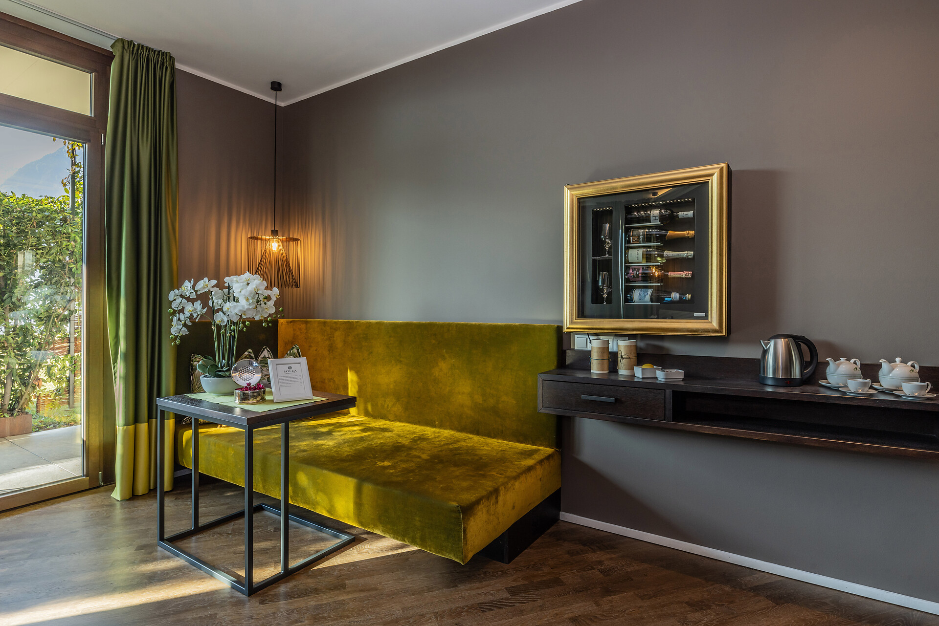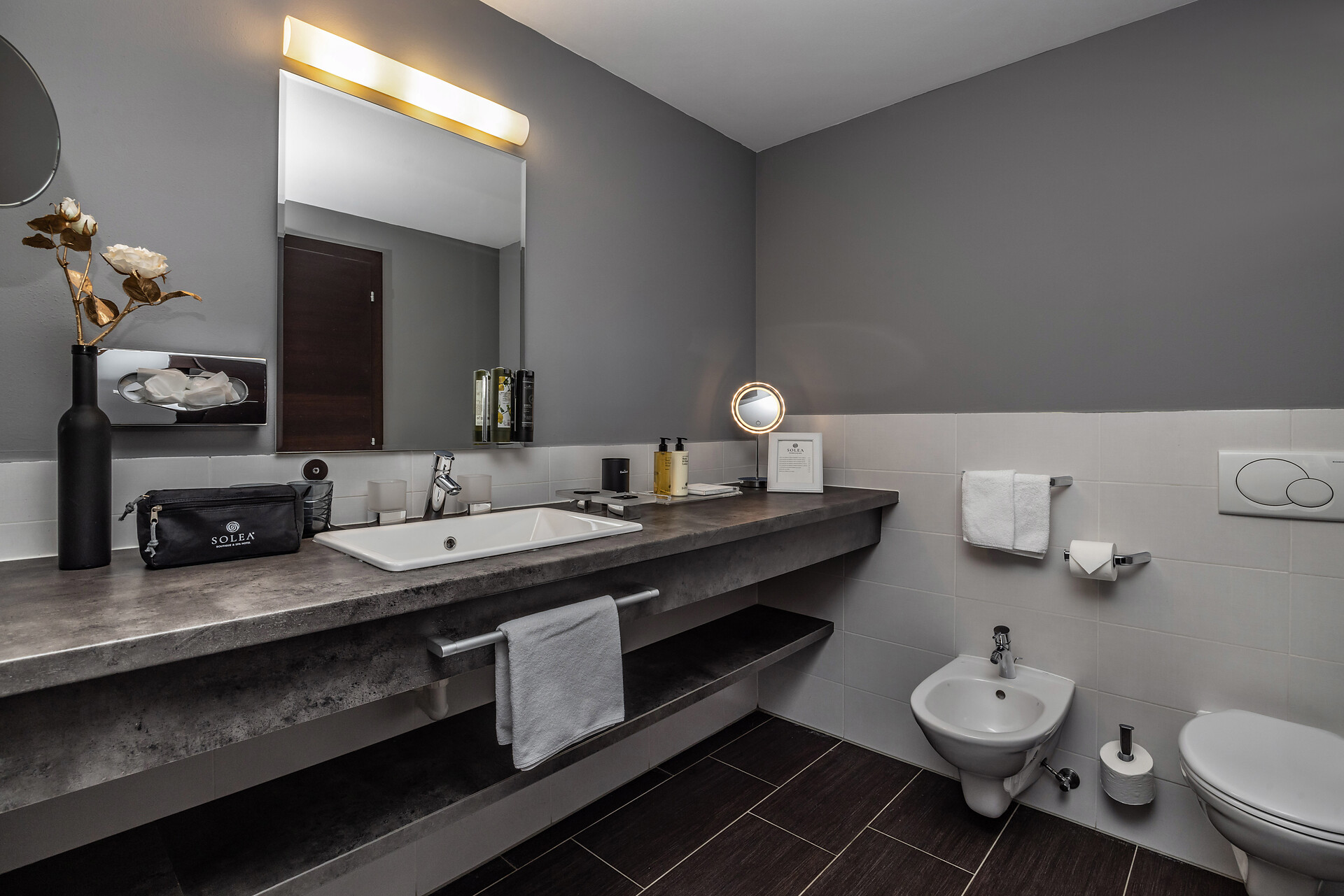 Large family suite with two separate bedrooms, living room with seating area for 4 people, panoramic glazing, large balcony with view to the Mediterranean garden, free-standing bathtub, shower, two washbasins, separate toilet and bidet, natural wooden flooring, air conditioning, 2 flat screen TVs, safe, minibar, and underground parking space.
