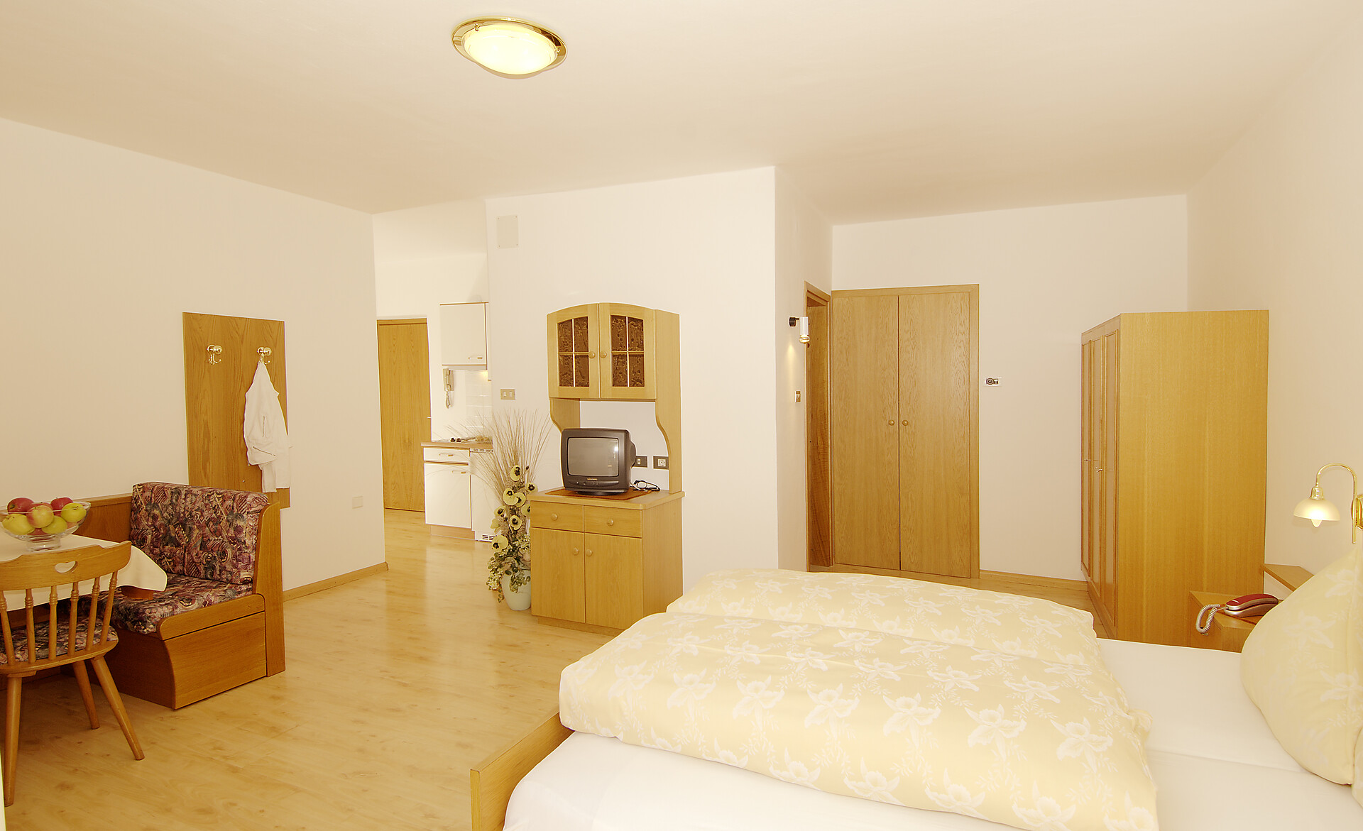 Living-Kitchen with Bedroom You are welcome to bring your dog on request — provided that the dog is not left alone when you leave the house. We charge a fee of €25.00 per day. For final cleaning there is a charge of €70.00, plus the applicable local tax. Our well-kept, fully furnished apartments invite you to feel at home: a fully equipped kitchen with four hotplates, oven, filter-coffee machine, moka pot, egg boiler, etc., and linen (children’s bedding available on request), plus Wi-Fi, satellite TV, safe, hair-dryer… Toaster, small oven and microwave are available for borrowing. Enjoy a relaxed breakfast on the balcony, soak up the sun, or unwind comfortably in our garden — everything to make you feel at ease.