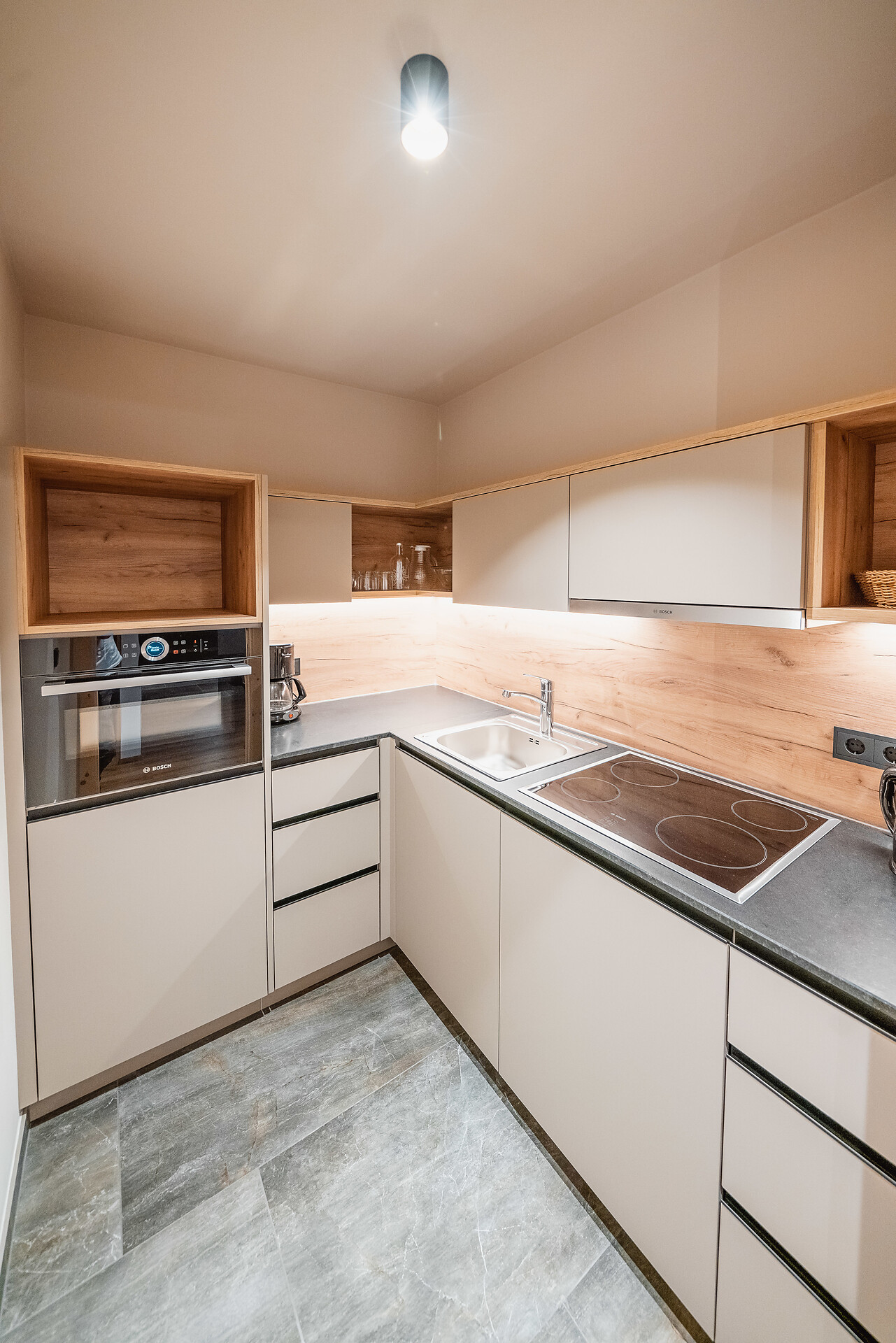 Kitchen with dishwasher, kettle, 4-fold ceramic hob,