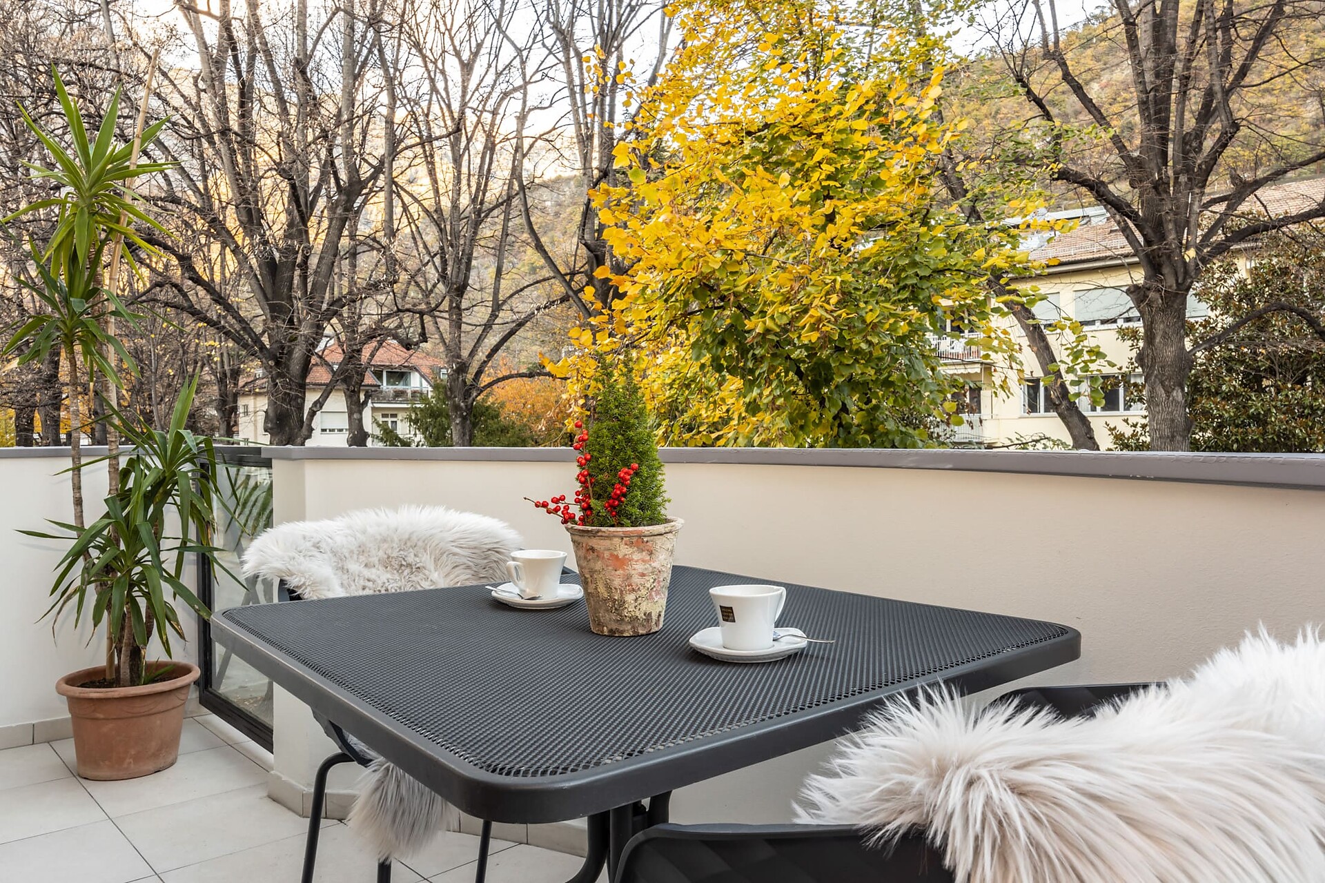 View of the linden trees, air-conditioned living rooms furnished with classy designer furniture and a large designer bathroom. Two balconies facing south and west for hours of relaxation. The "Palm Loggia Linden" is ideal for 2-3 persons.