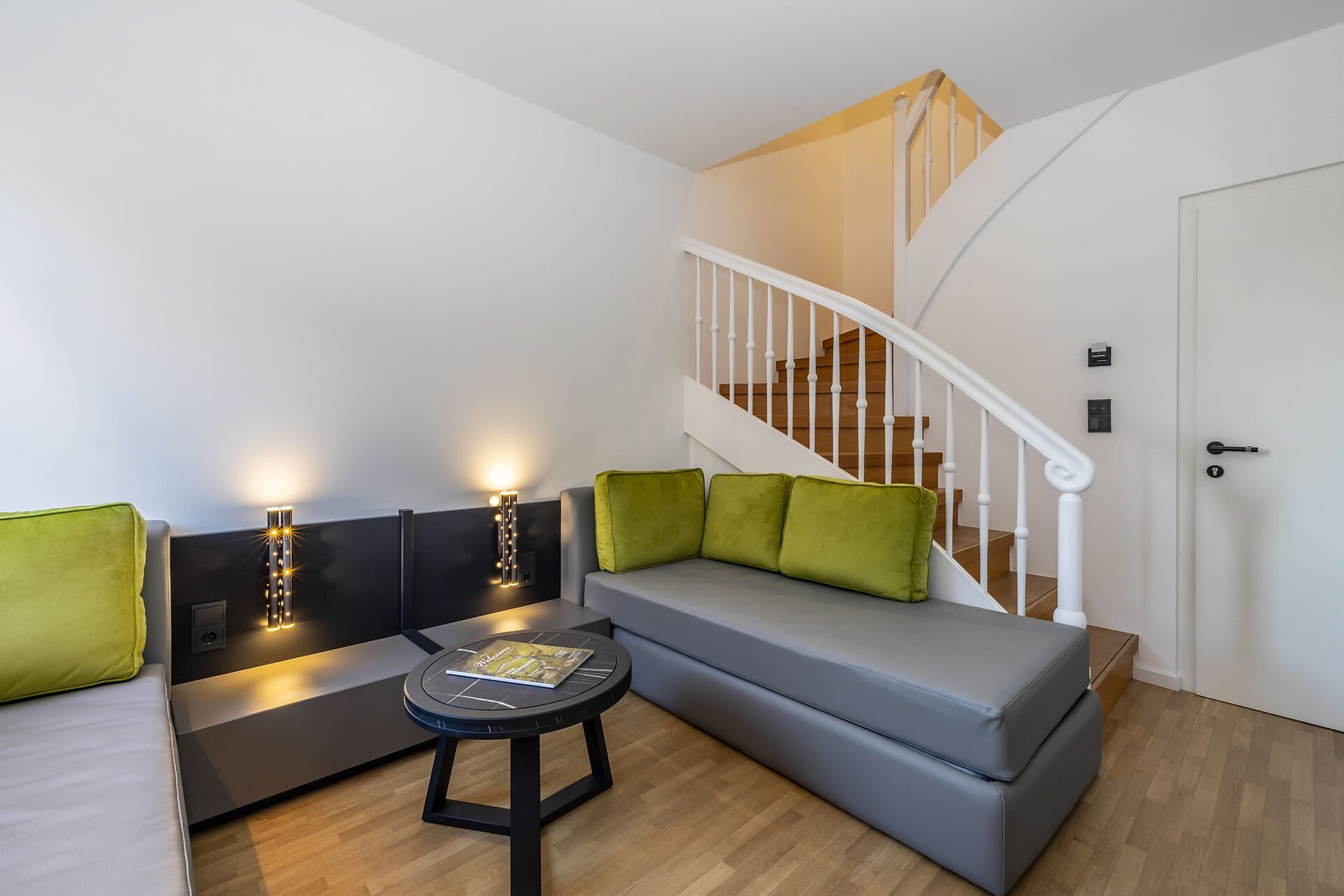 Light-flooded and air-conditioned living rooms furnished with high-quality designer furniture extend over two floors and include three balconies. The "Palm Loggia Loft" is ideal for 2 to 4 people.