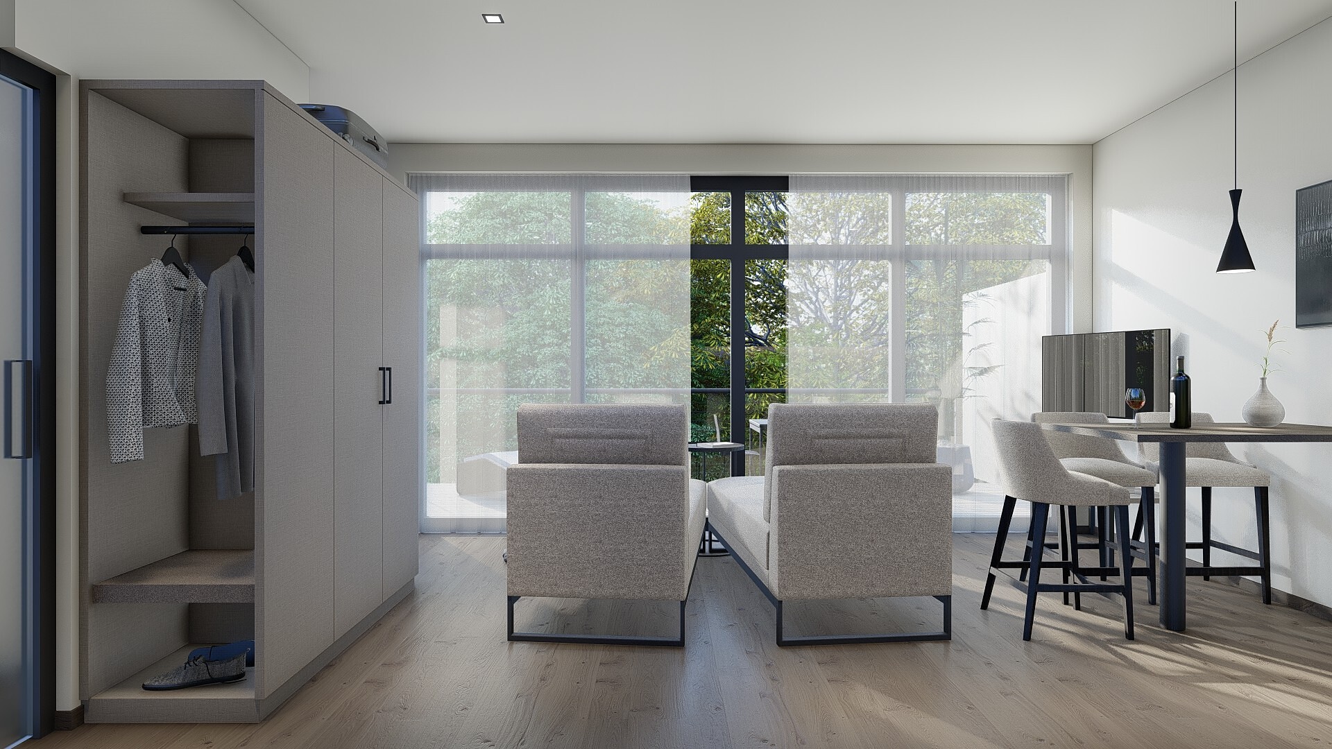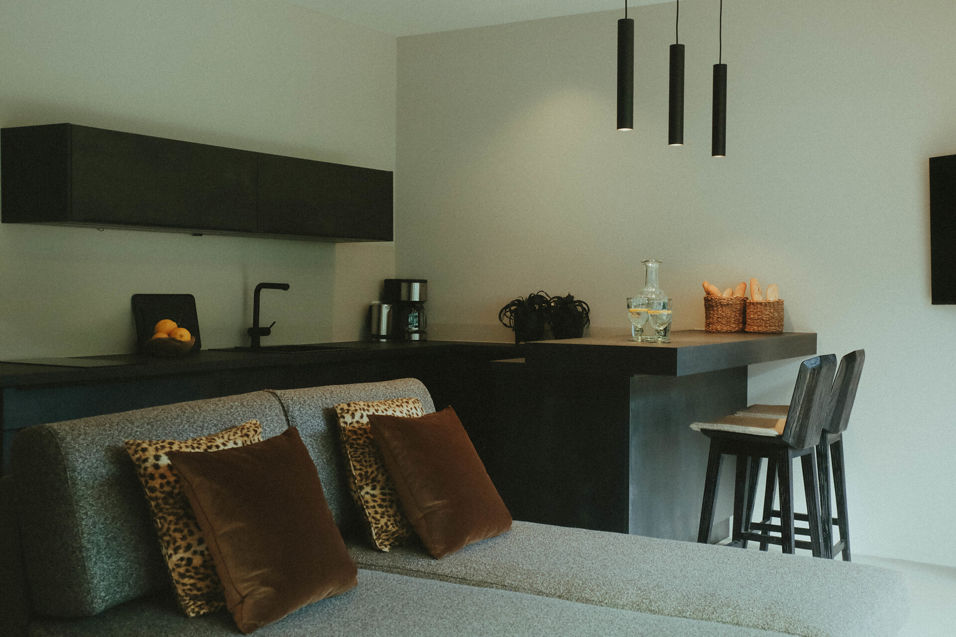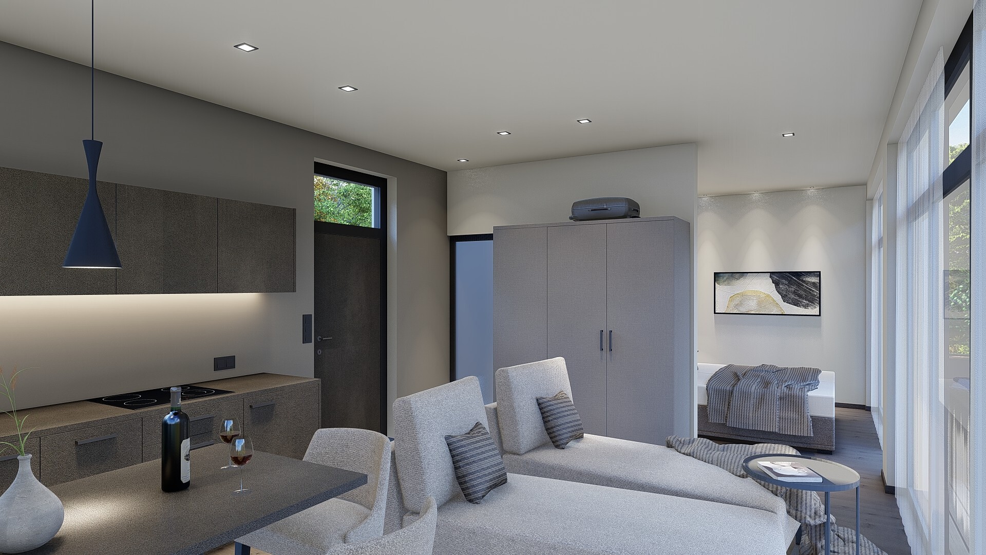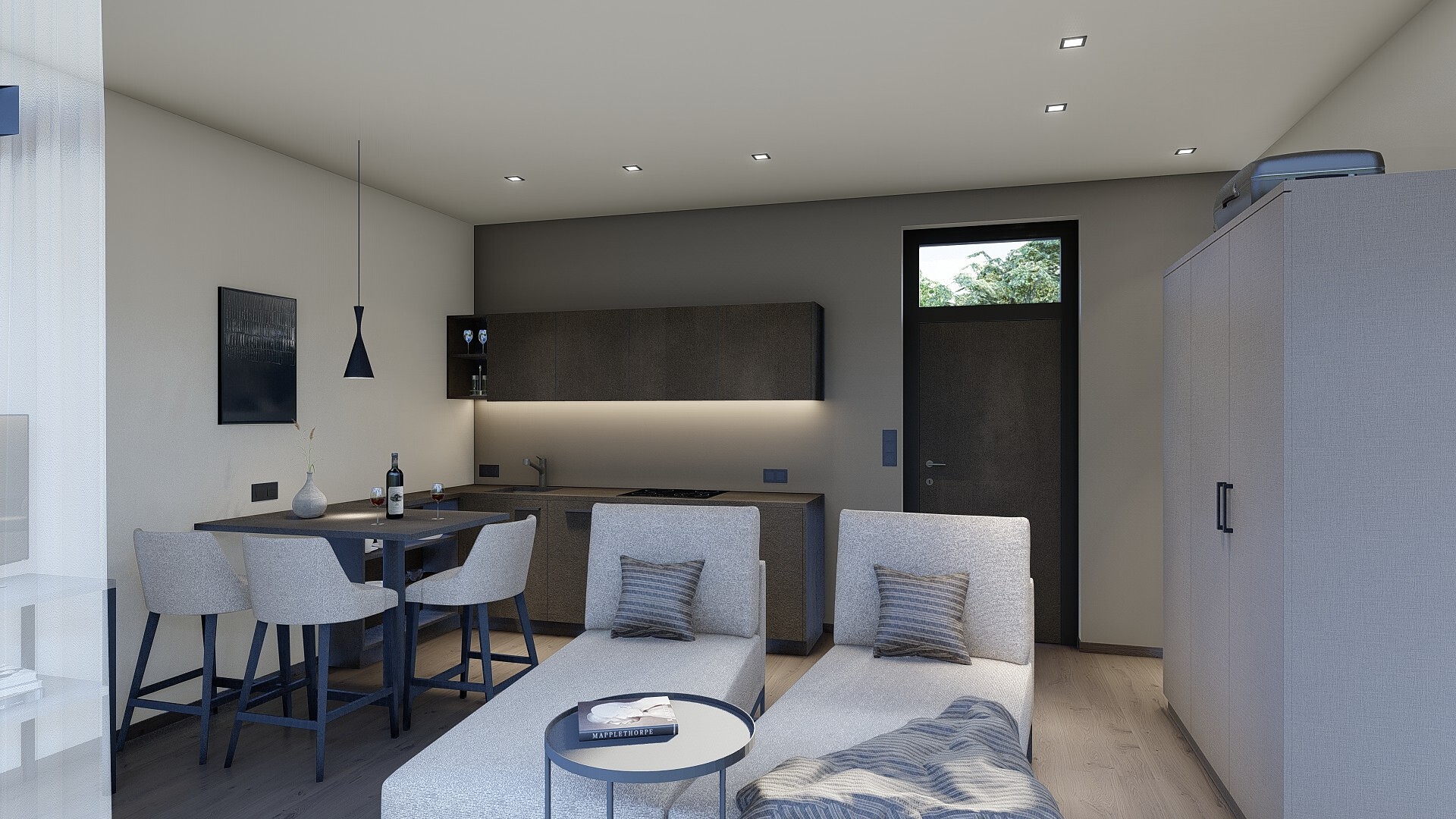 Chalet (40m²): Bedroom with box-spring bed, fully equipped living and dining room with sofa beds, smart TV, Wi-Fi, bathroom with rain shower and private sauna, bed linen, bath towels, cosy bathrobes and high-quality natural cosmetics. Large private panoramic terrace with dining area and barbecue, and relaxation area with loungers and sunshade.