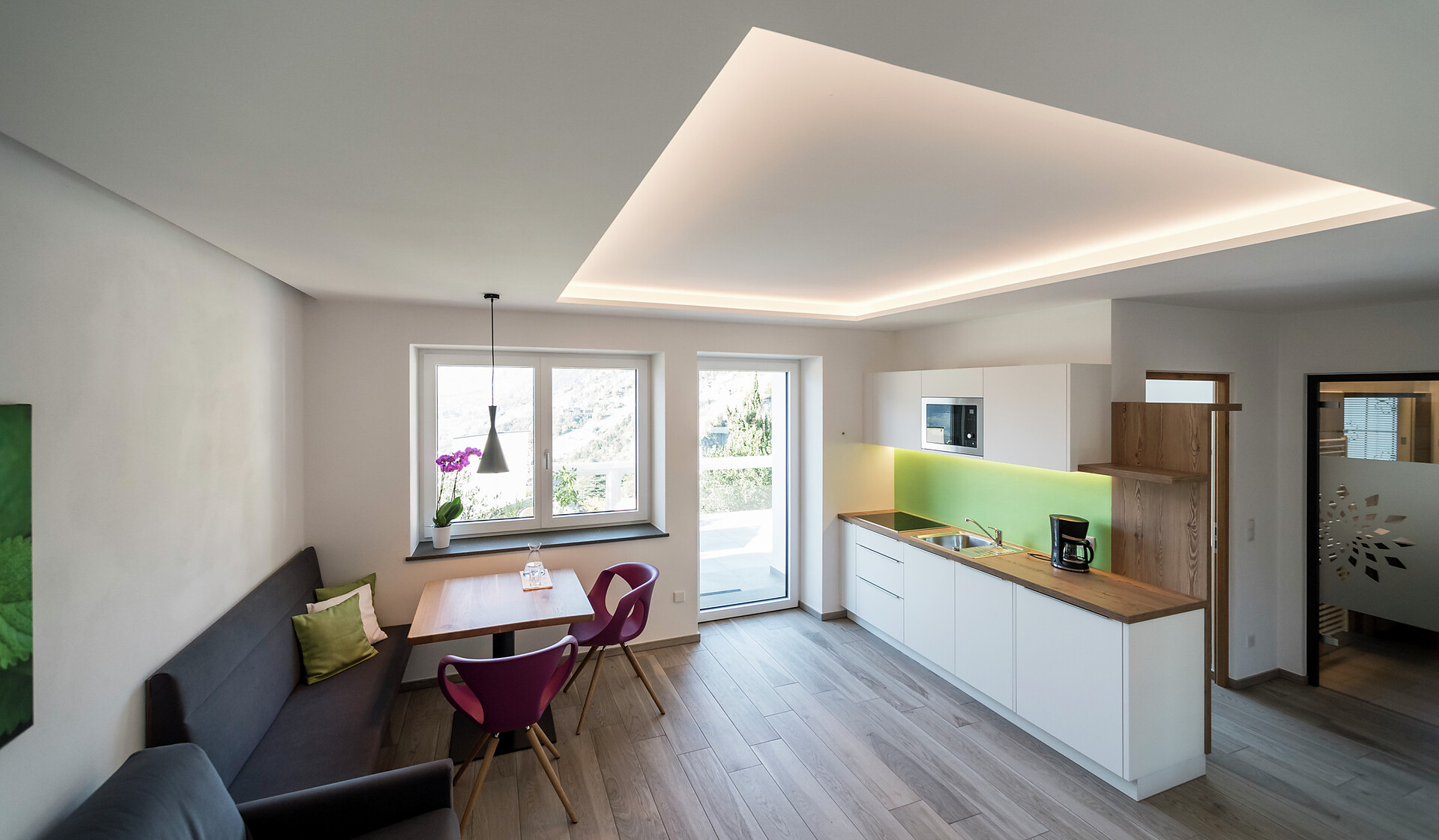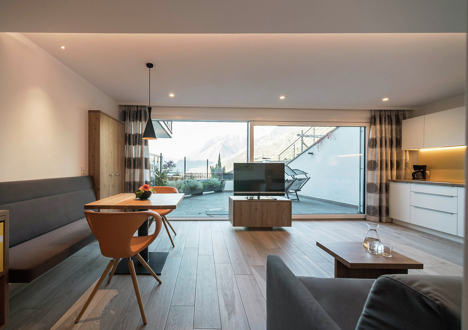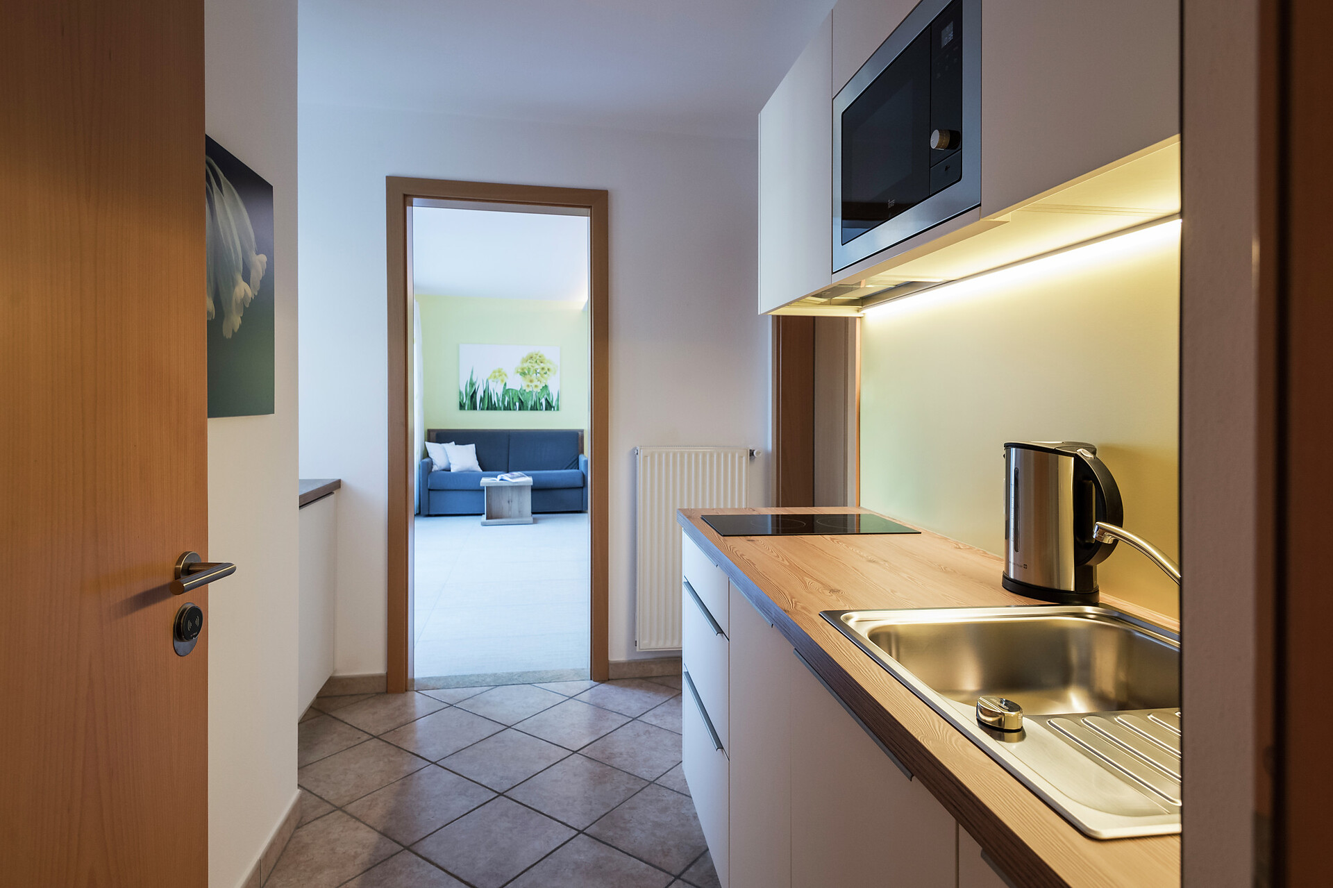 The apartement Primula is 42 qm big, in the second floor, reachable with elevator, the bed- an livingroom is in one, bath and a separate nice kitchenette with an equipment to cook. The terrace has 16,5 qm. For your car we have a garage.