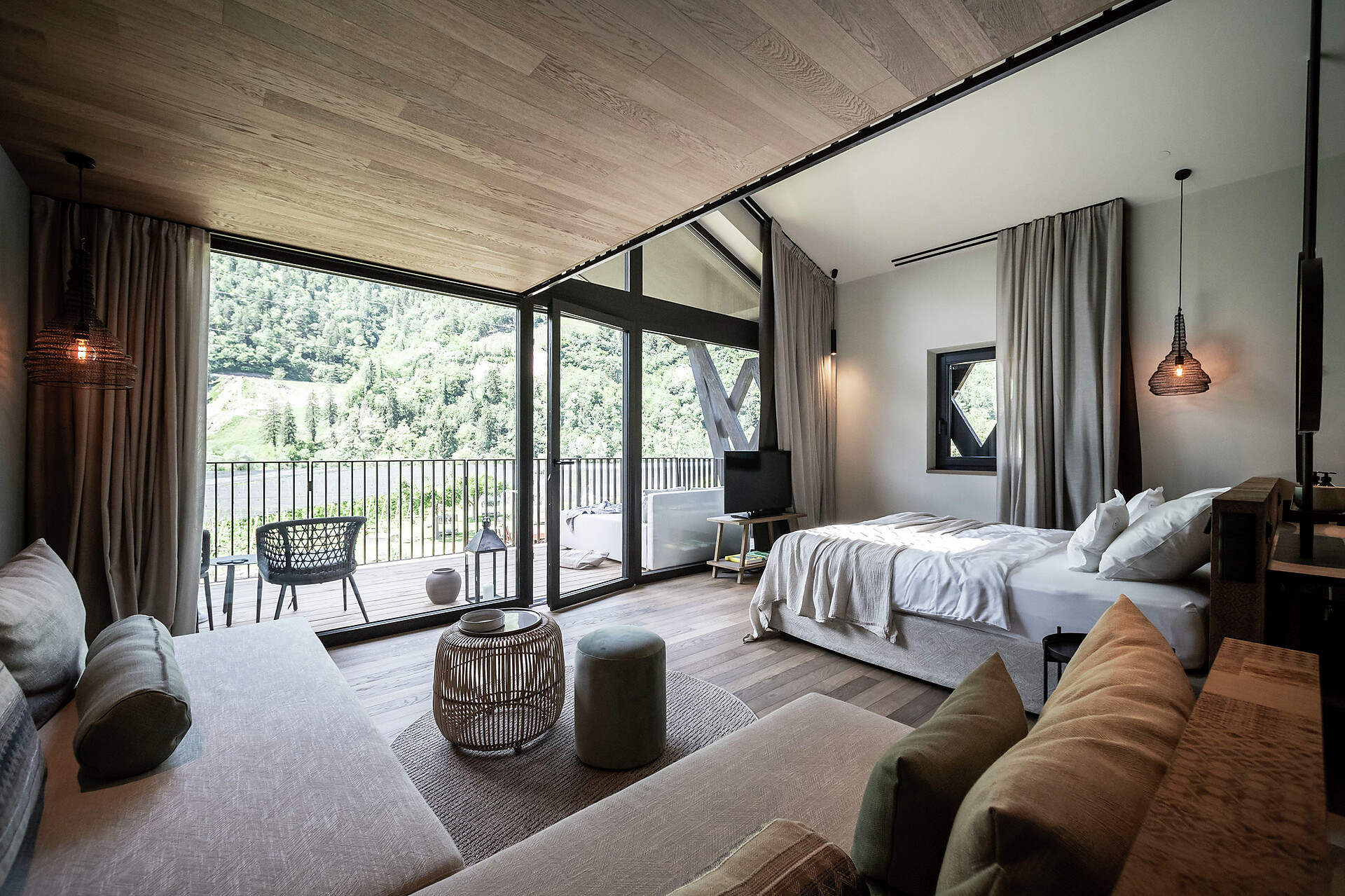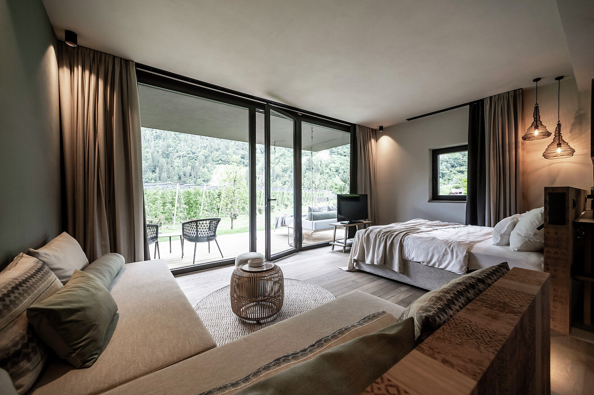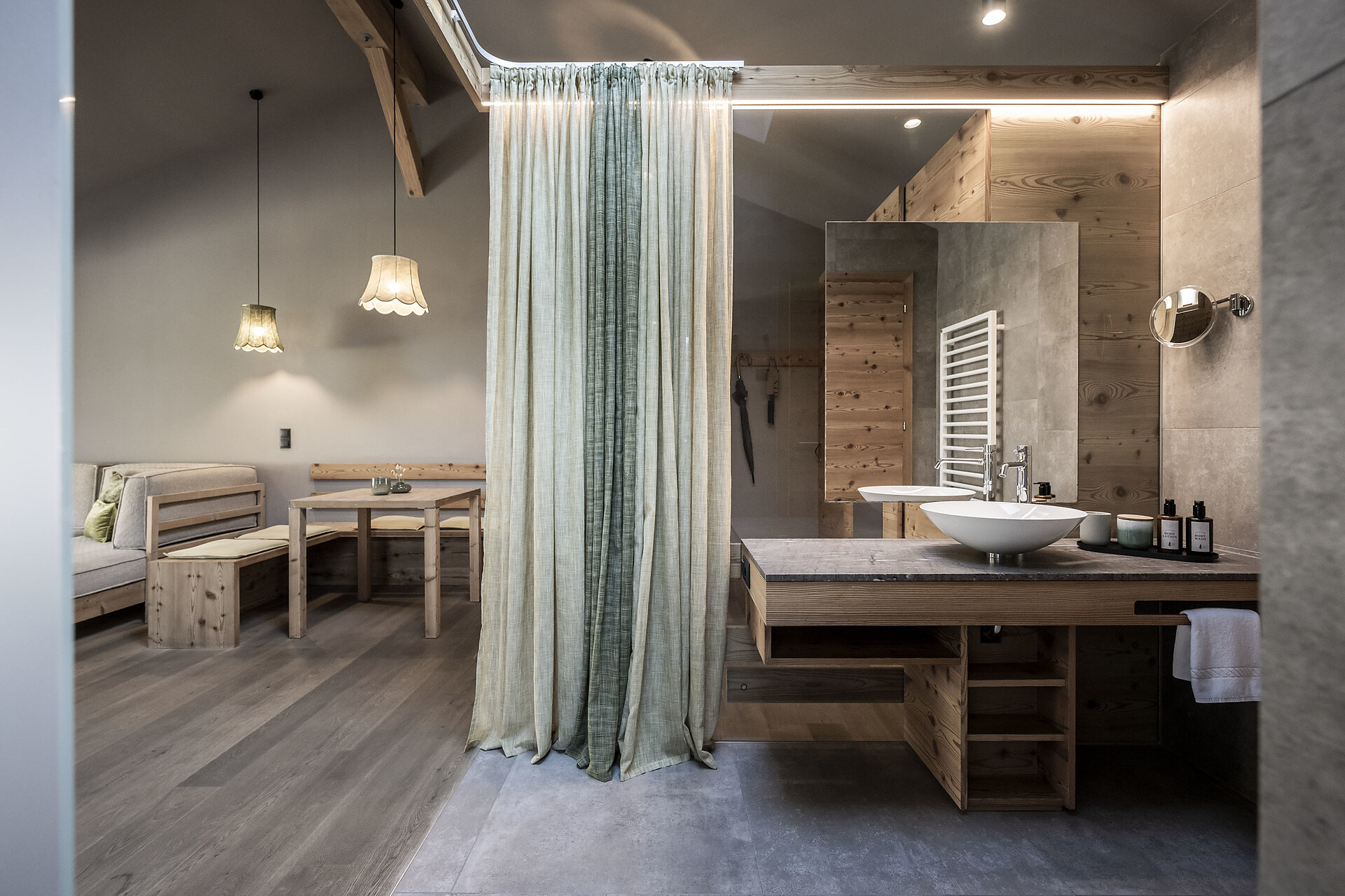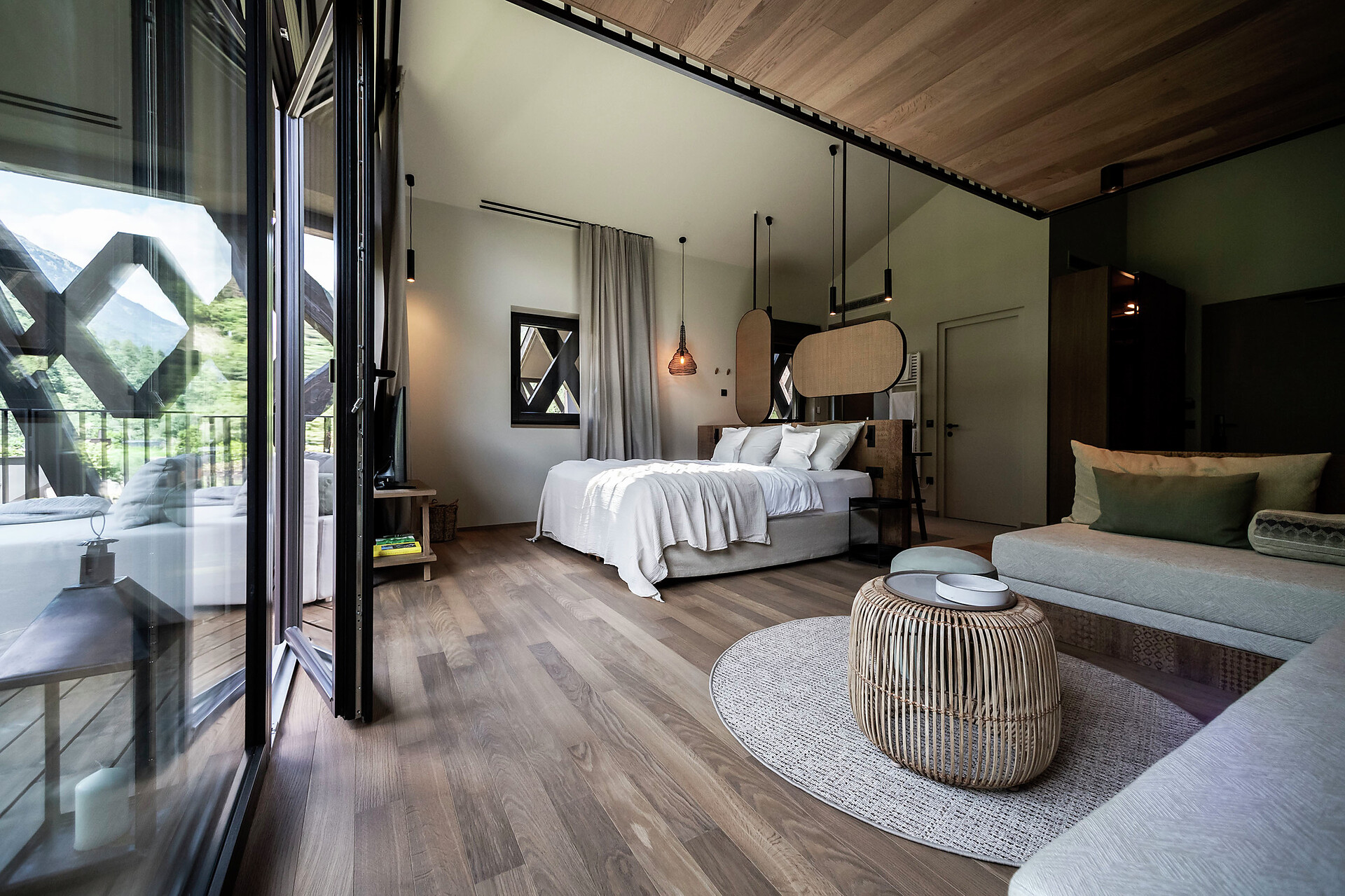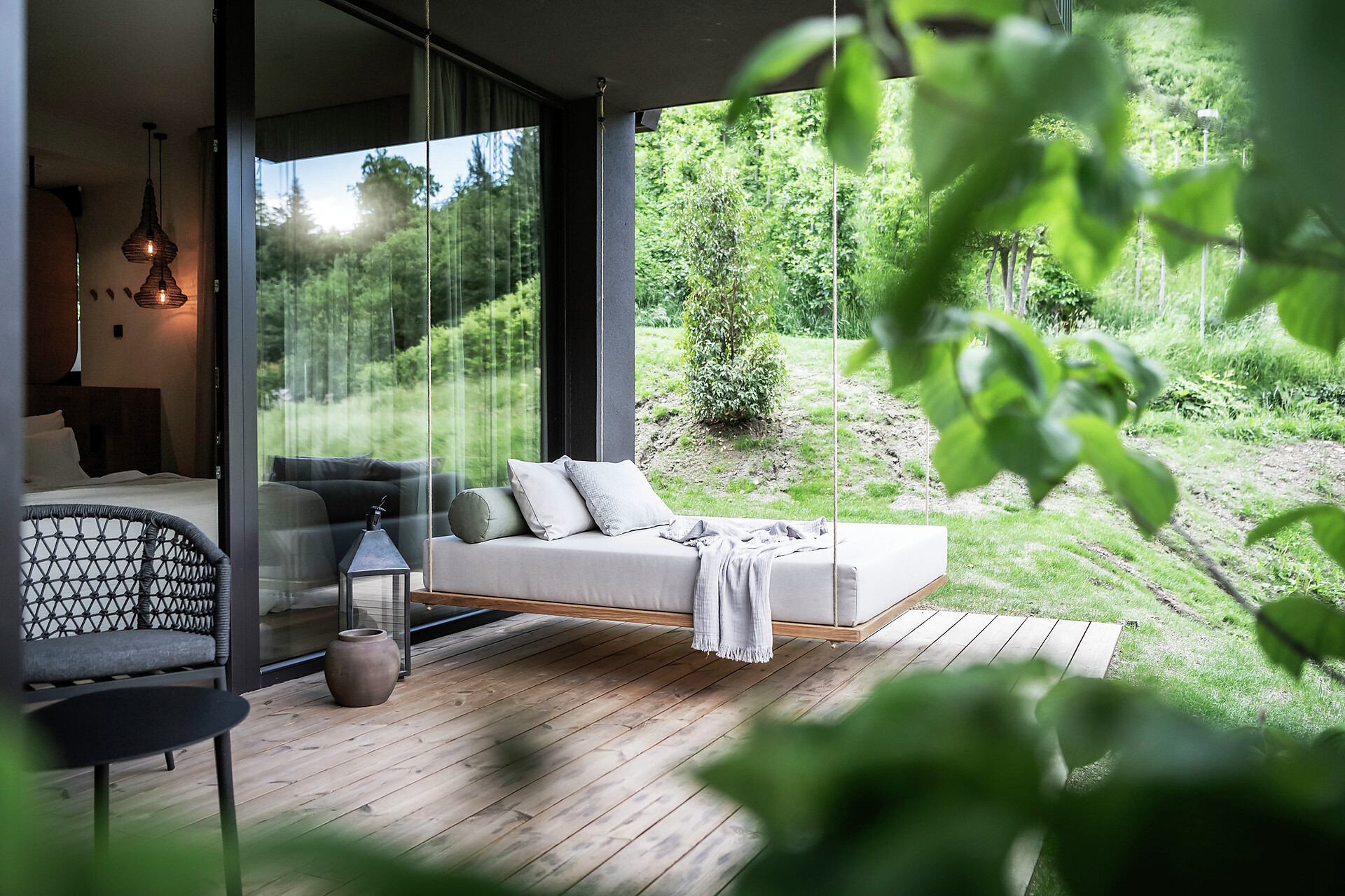 The solid wood paneling exudes intimacy and romance. The balcony overlooks directly onto our garden. With a panoramic shower, corner bathtub and panoramic windows, you can enjoy every moment together.
