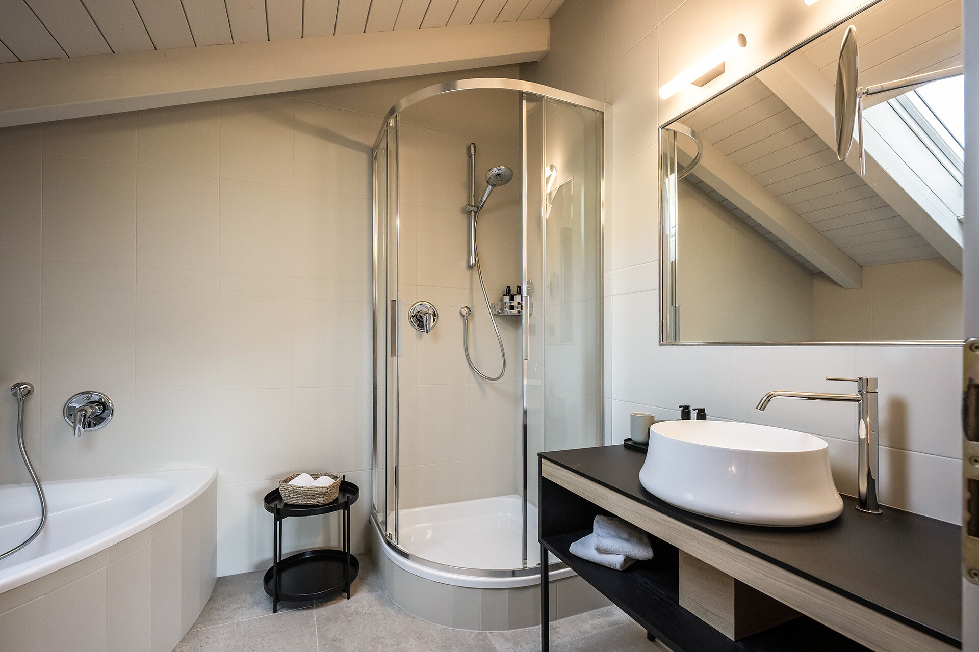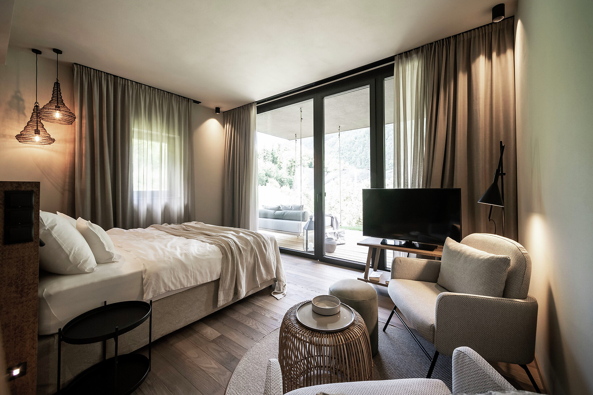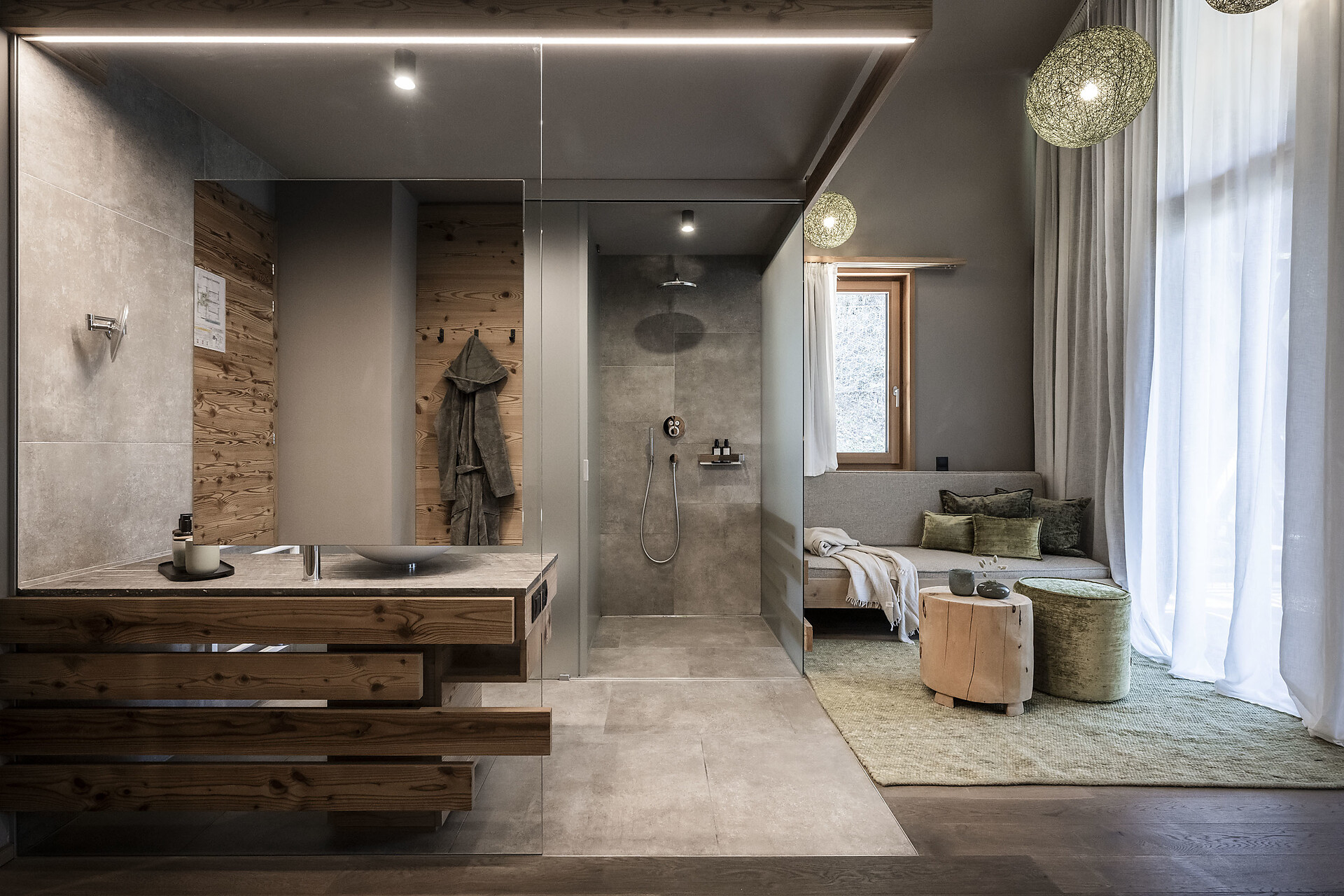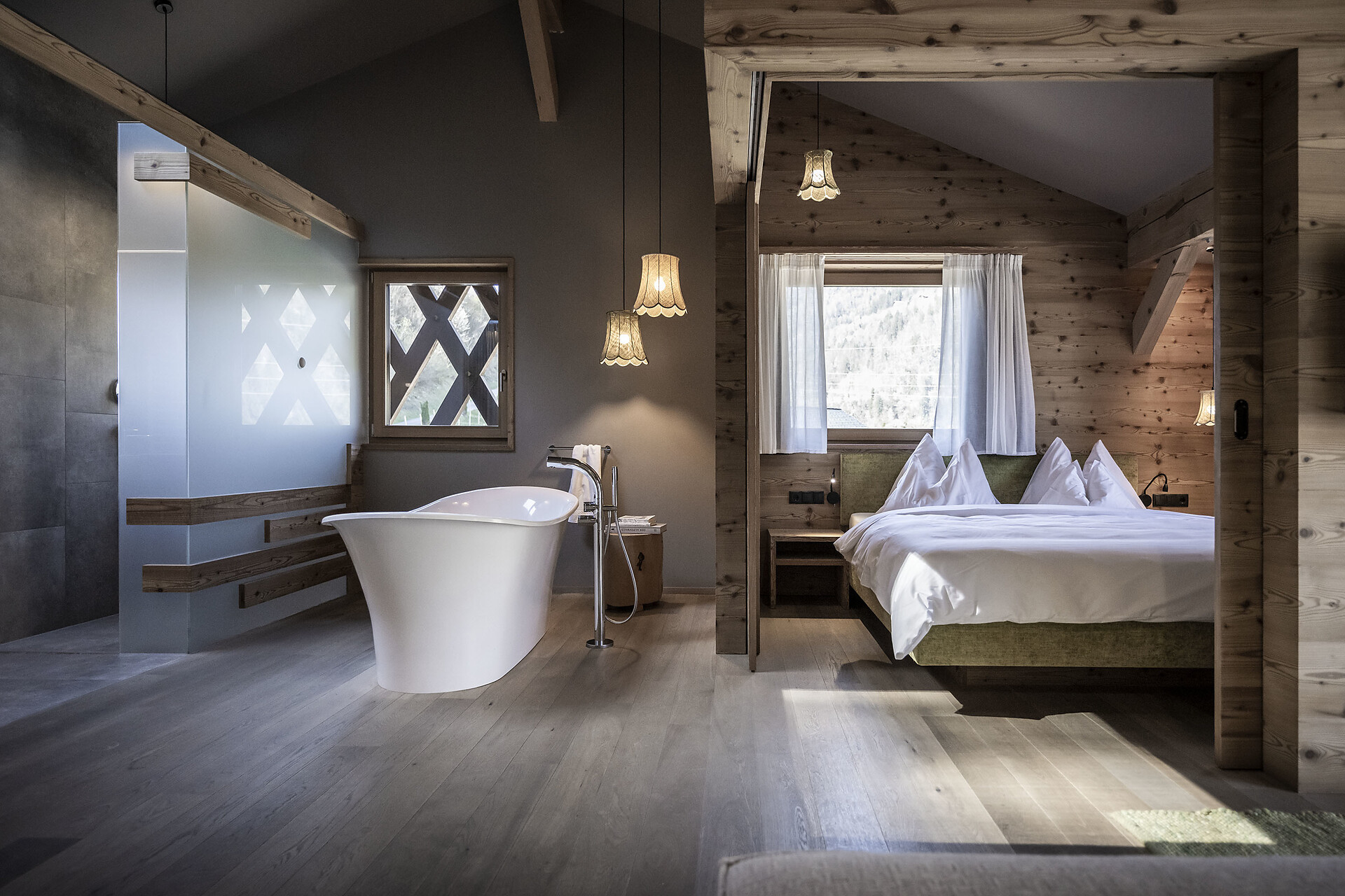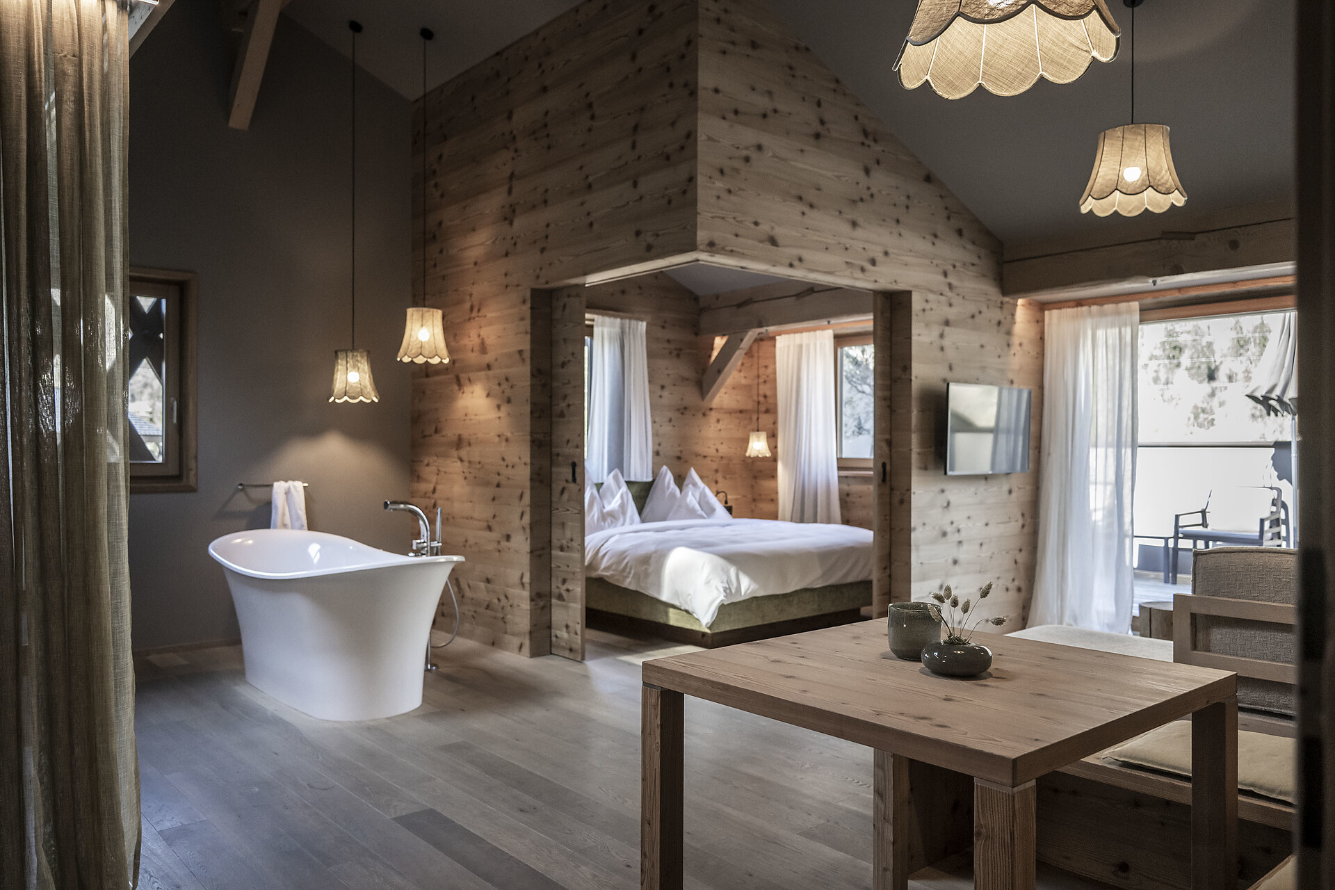 The solid wood paneling exudes intimacy and romance. The balcony overlooks directly onto our garden. With a panoramic shower, corner bathtub and panoramic windows, you can enjoy every moment together.